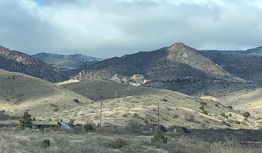 We left Sedona this morning, where the forecast called for “a little dicey” around the Jerome area. As we headed on down the road, we kept an eye on Jerome, which was easier than one might think, since there was a “J” on its mountain!