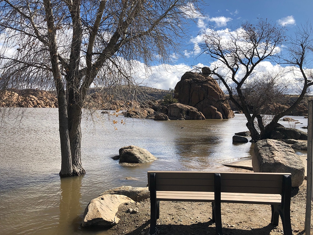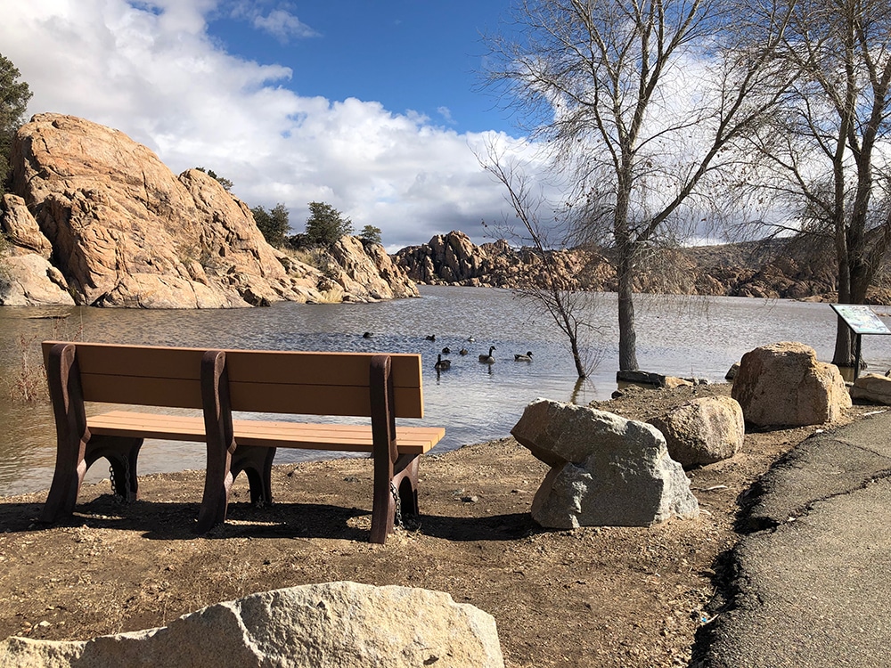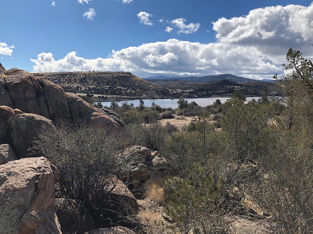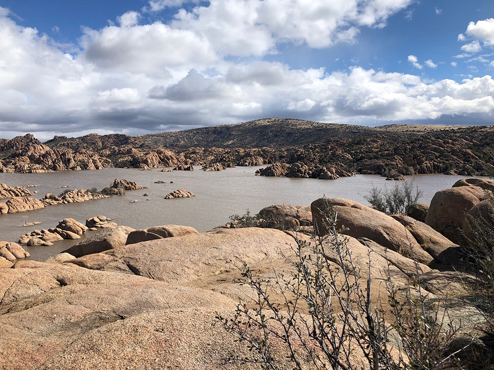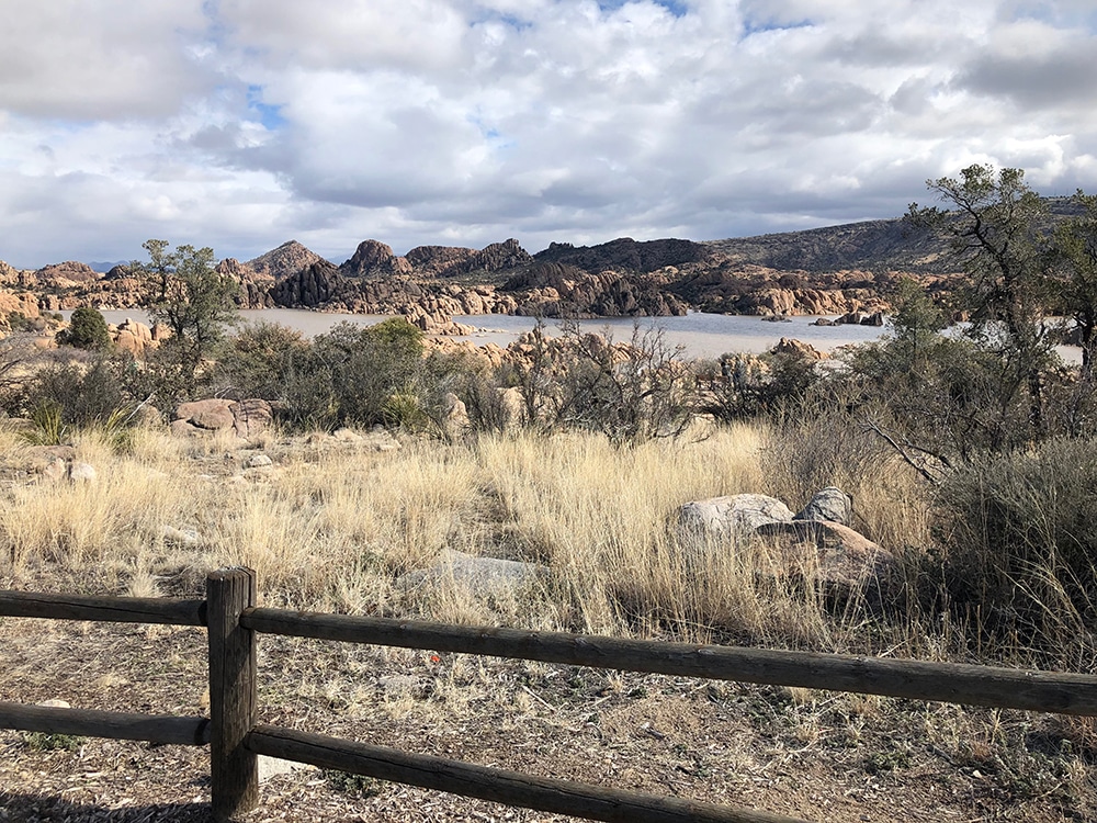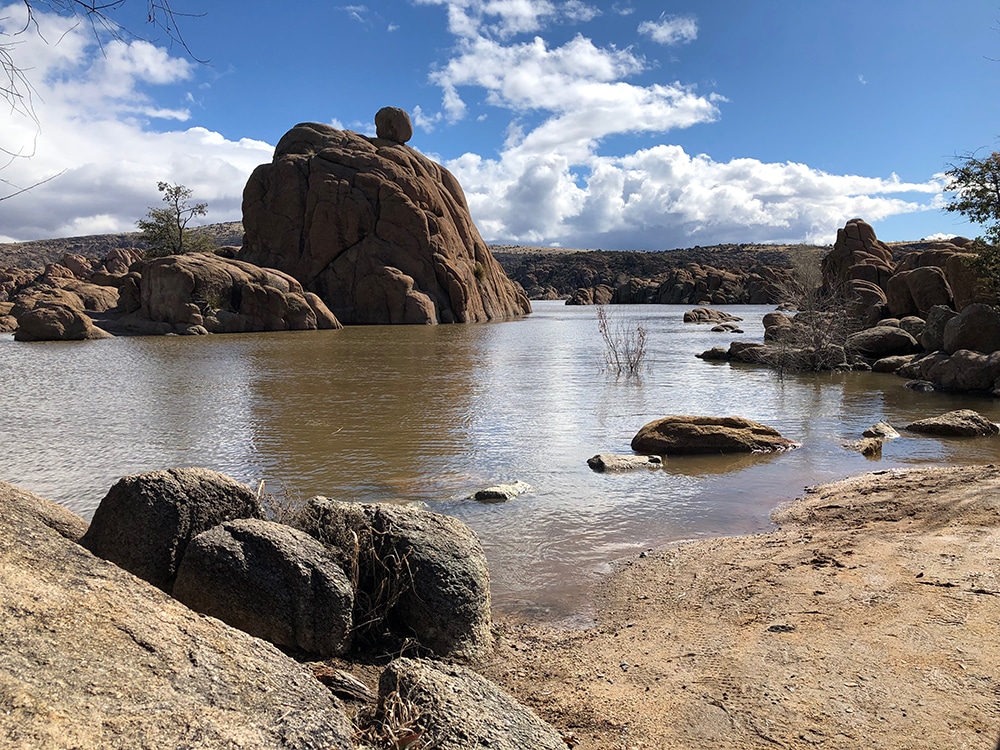 As we continued on 89A past Jerome, the temperature dipped into the low 20s with flurries and an occasional slick patch, adding a touch of anxiety to the curves and up- and downgrades. We welcomed the flat land north of Prescott, and we came to a stop at Watson Lake and the Granite Dells – a very unique place indeed.
