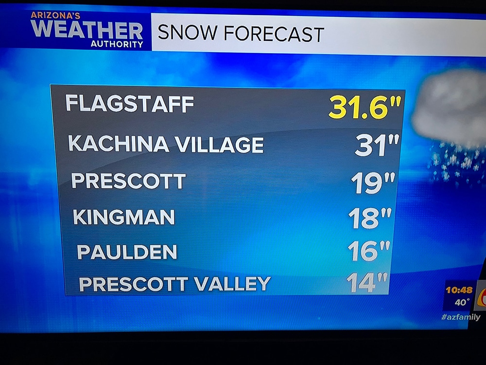 Snow is expected this time of year in Flagstaff and Sedona – but not THIS much. Snow is NOT expected in Tucson, the Phoenix metro area or the ‘burbs. Las Vegas got their first measurable snowfall in more than a decade and Kingman got their forecasted eighteen inches. Hopefully Kingman’s snowplows are in good repair because we are headed that way!