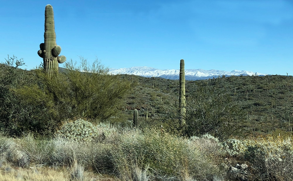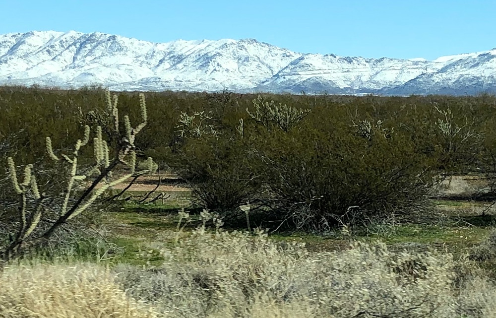 The diagonal striations on the mountains in the third photo is the partial double-decker that we drove to get from Prescott to Wickenburg (White Spar, above). We may not have noticed the road today if it weren’t for the striations in the snow.