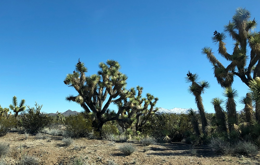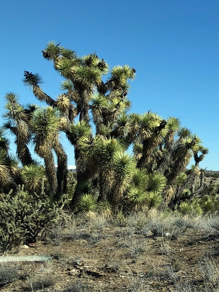 Further up Hwy 93, we entered the Joshua Tree Parkway of Arizona. The Joshua Tree (below) is a scrappy-looking Yucca tree that grows in the Mojave Desert in four states. It was named after the bearded biblical figure Joshua by westbound Mormons. Also called the “praying tree”, the limbs seemed to guide travelers westward (or to the Promised Land). More accurately, they were pointing us northwest.