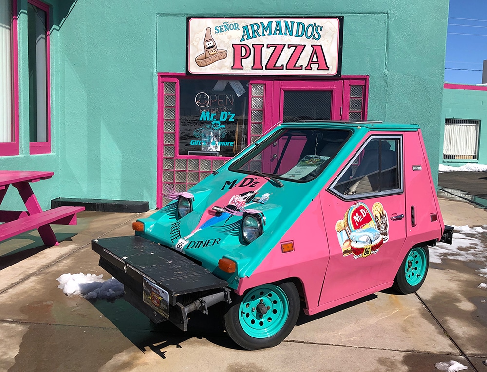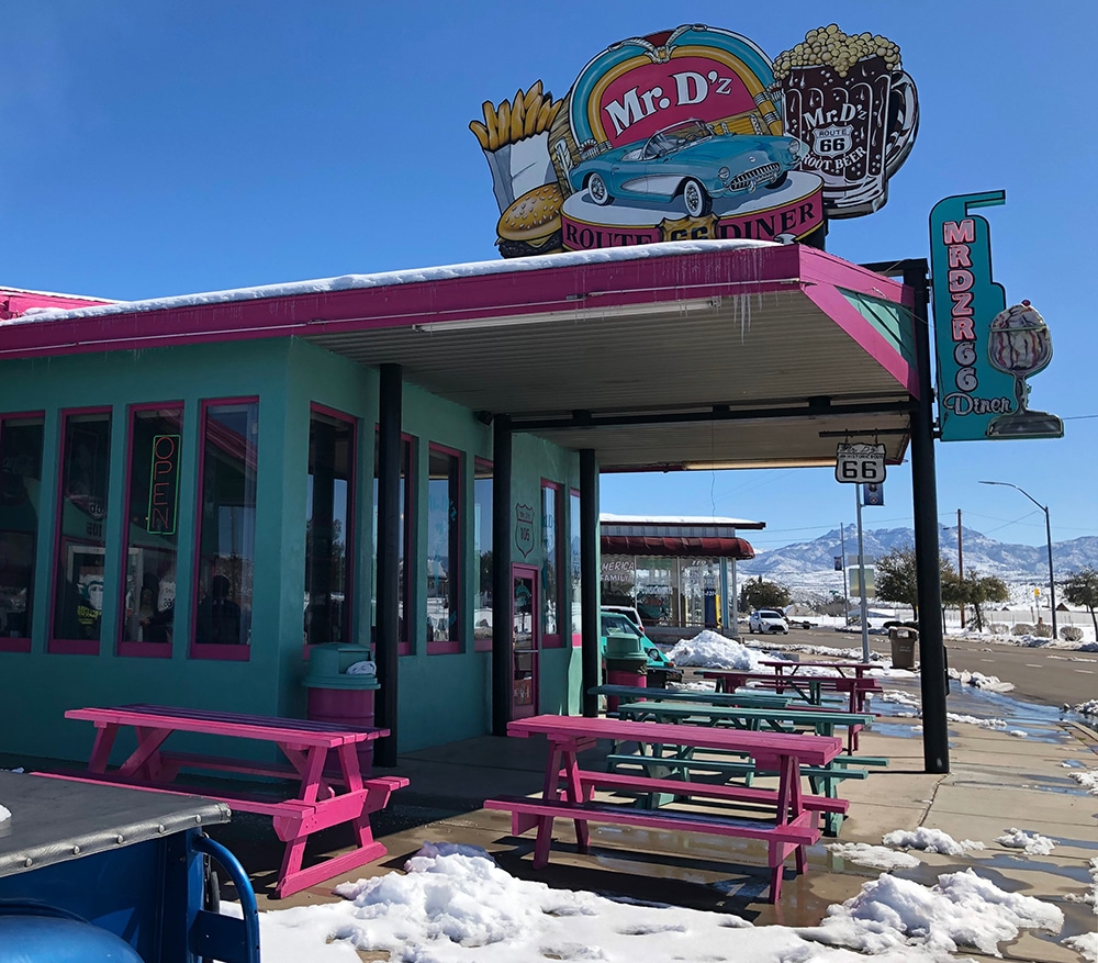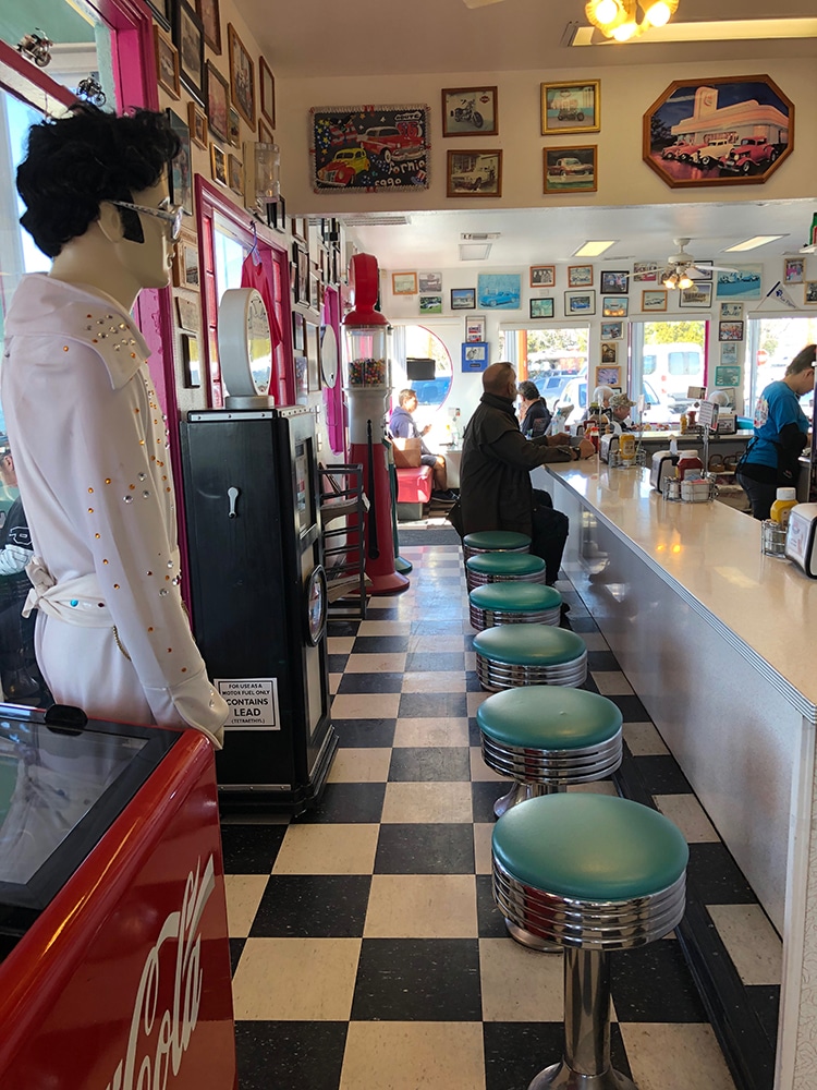 “This Route 66 diner is an old fashioned diner, serving traditional diner fare, and is best known for its homemade root beer and pizza.” We had a cheeseburger, fries and a chocolate shake, which seemed apropos in a joint like this!