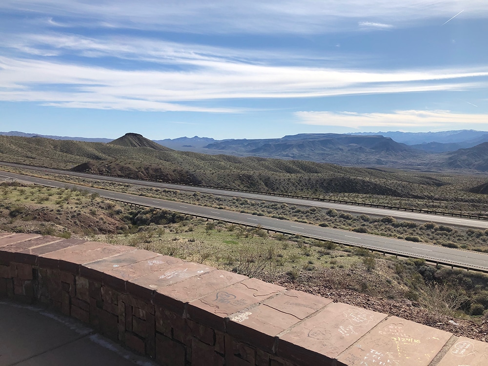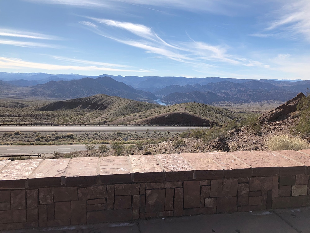 About an hour down the road we catch our first glimpse of Lake Mead at a scenic overlook just before the Hoover Dam. We could see for miles from this vantage point and the clouds looked like they had been painted on the sky with a brush.