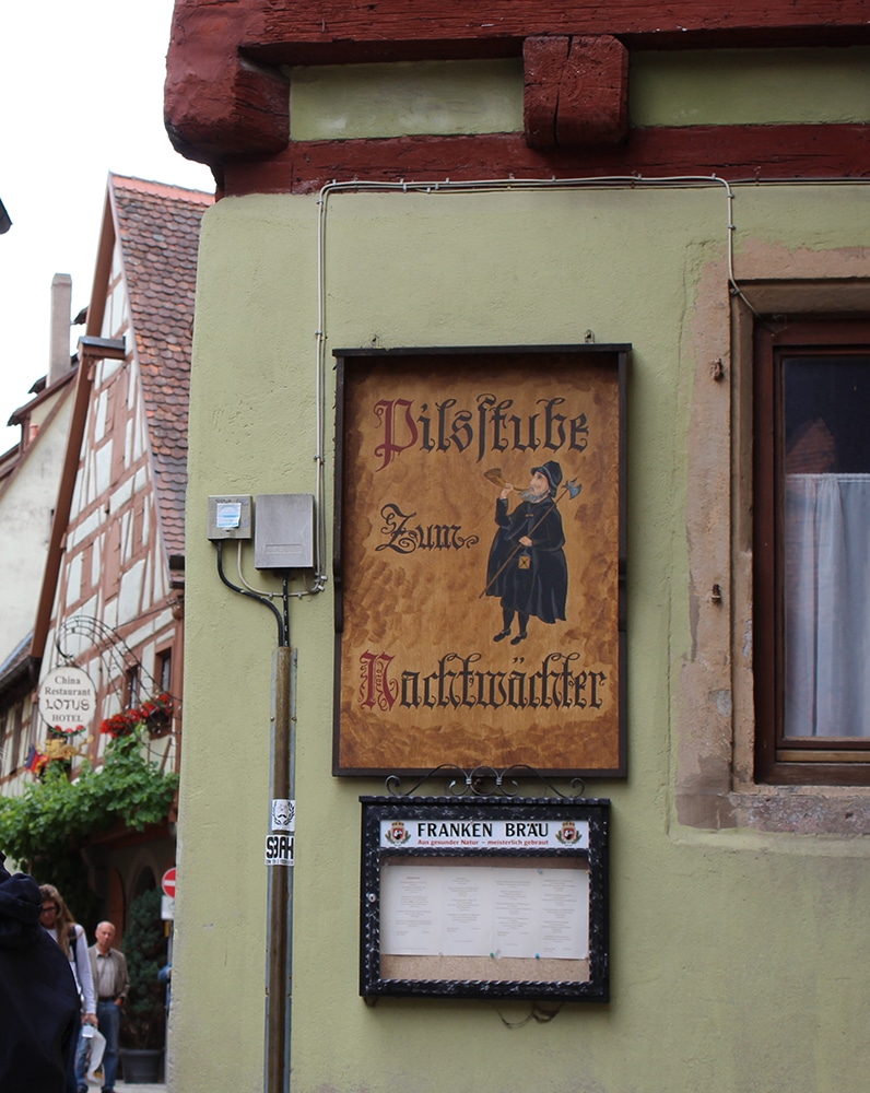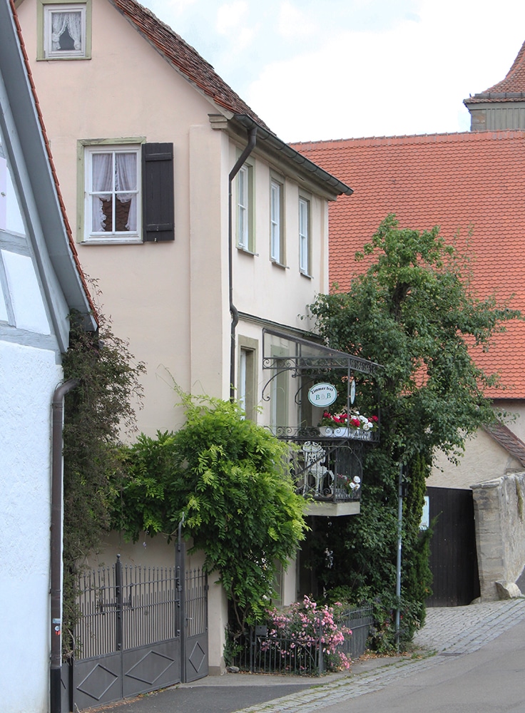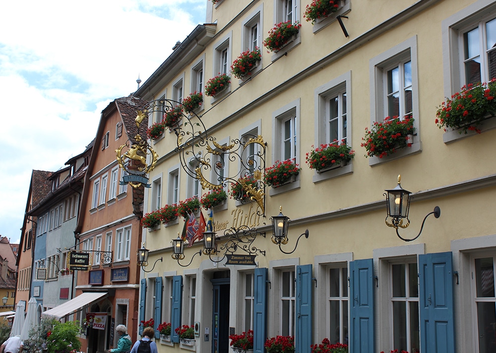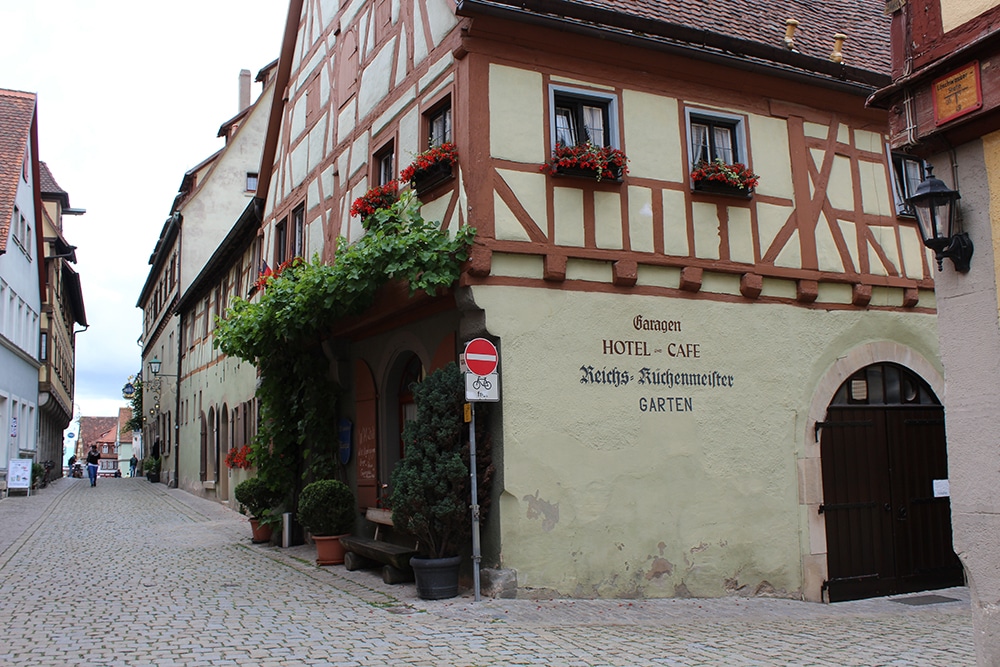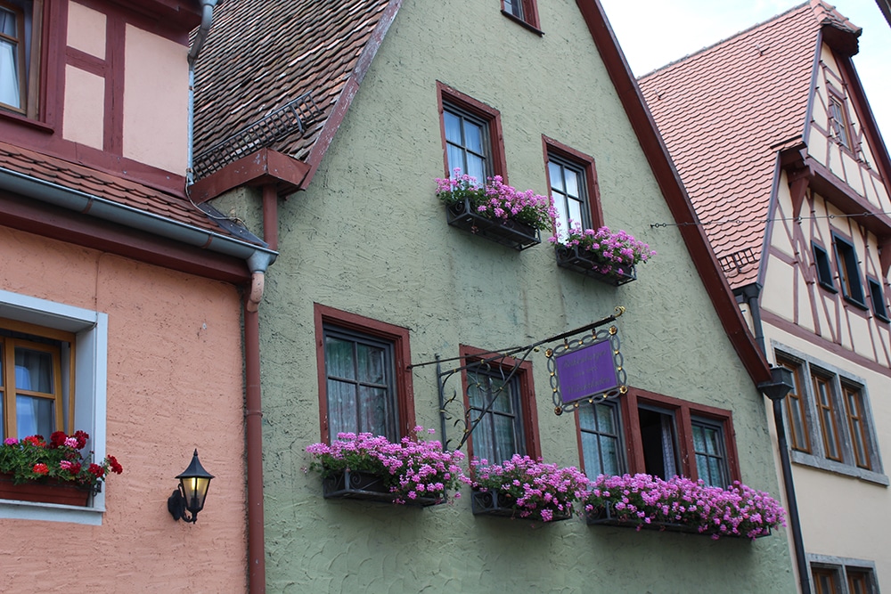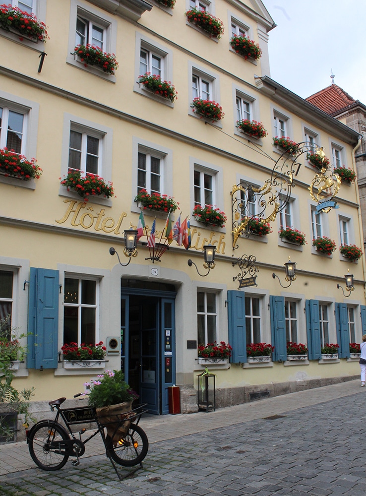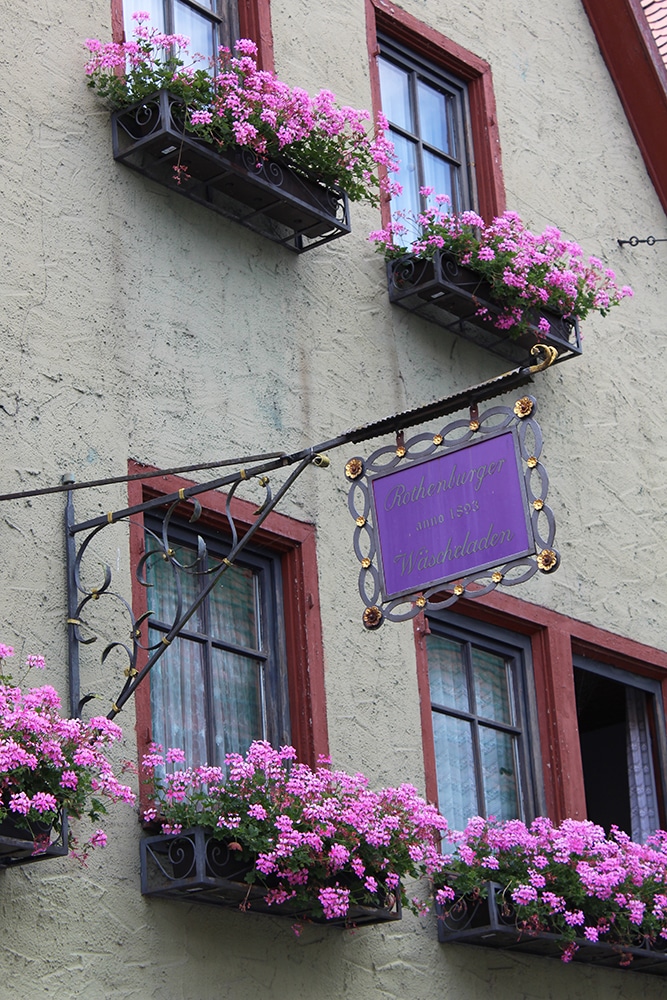 Flowers adorn Rothenburg’s neat and tidy streets and balconies, and the occasional tower and many intricate metalwork signs add to its interest. Its cobblestone streets are wide and in good repair, so our feet weren’t of concern with so much else to look at. Vines growing up the sides of colorful houses were icing on the cake. What a wonderful day, and we’re barely inside the fortress walls!