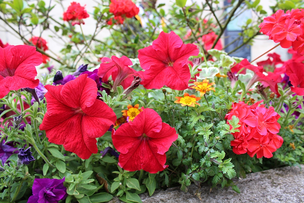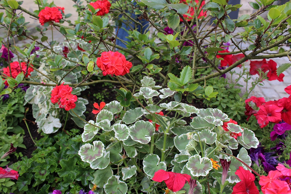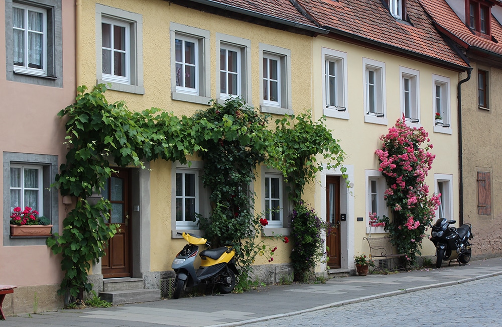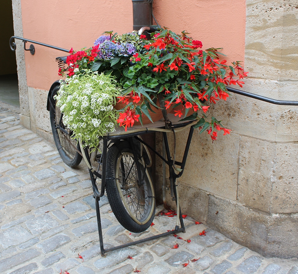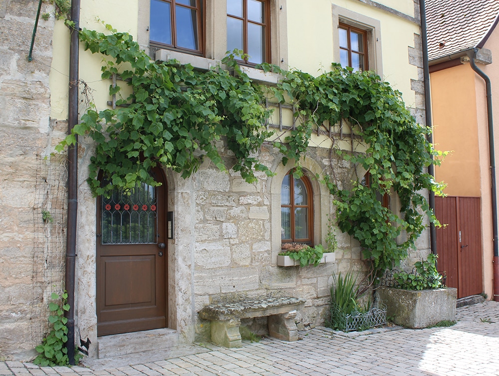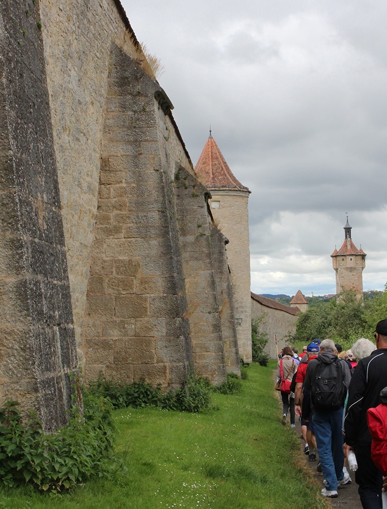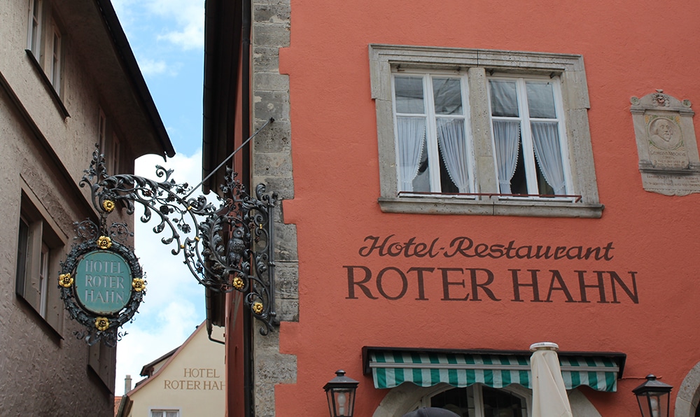 Flowers adorn Rothenburg’s neat and tidy streets and balconies, and the occasional tower and many intricate metalwork signs add to its interest. Its cobblestone streets are wide and in good repair, so our feet weren’t of concern with so much else to look at. Vines growing up the sides of colorful houses were icing on the cake. What a wonderful day, and we’re barely inside the fortress walls!