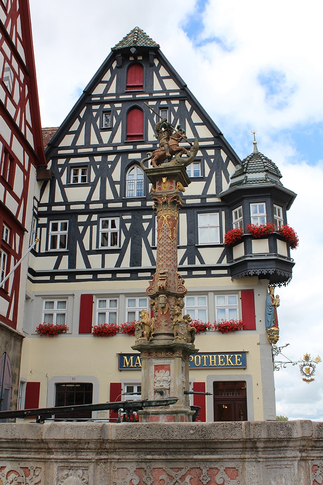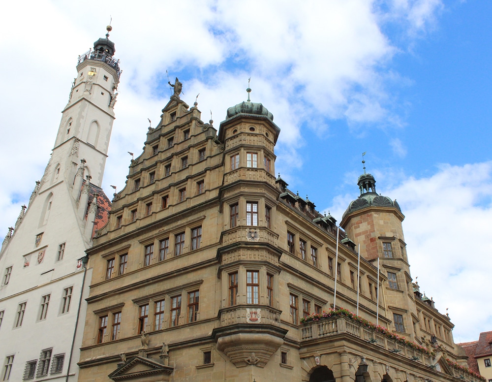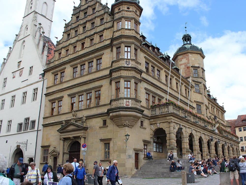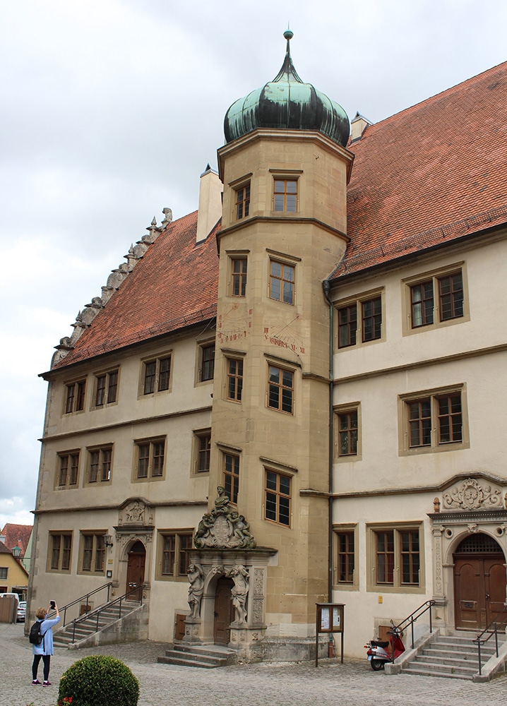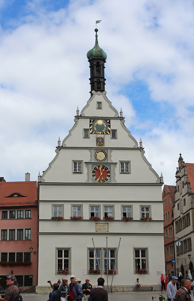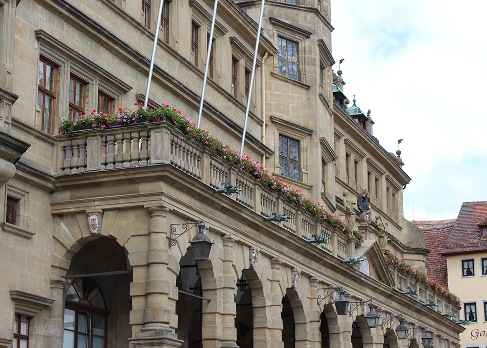 The Town Hall consists of two parts and three architectural styles, which blend beautifully. The white portion was originally a Gothic Doppelbau (double-building) built around 1250. Only the slender, almost 200-foot tall bell tower and its Imperial Hall survived when the rest was destroyed by a fire in 1501. You can climb to the top for a great view of Rothenburg. The most dominating part of the building – with its Renaissance facade – was added in the 1570s. With the help of the oriel windows (turret) and a few other tweaks, the architect joined the two buildings together pretty harmoniously. The Baroque archway, which provides cover and also a foundation for the patio with lovely flowers up top, was added in 1681.