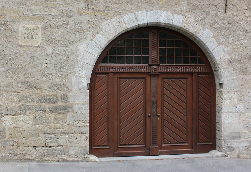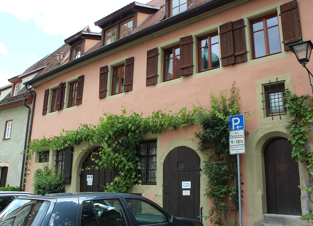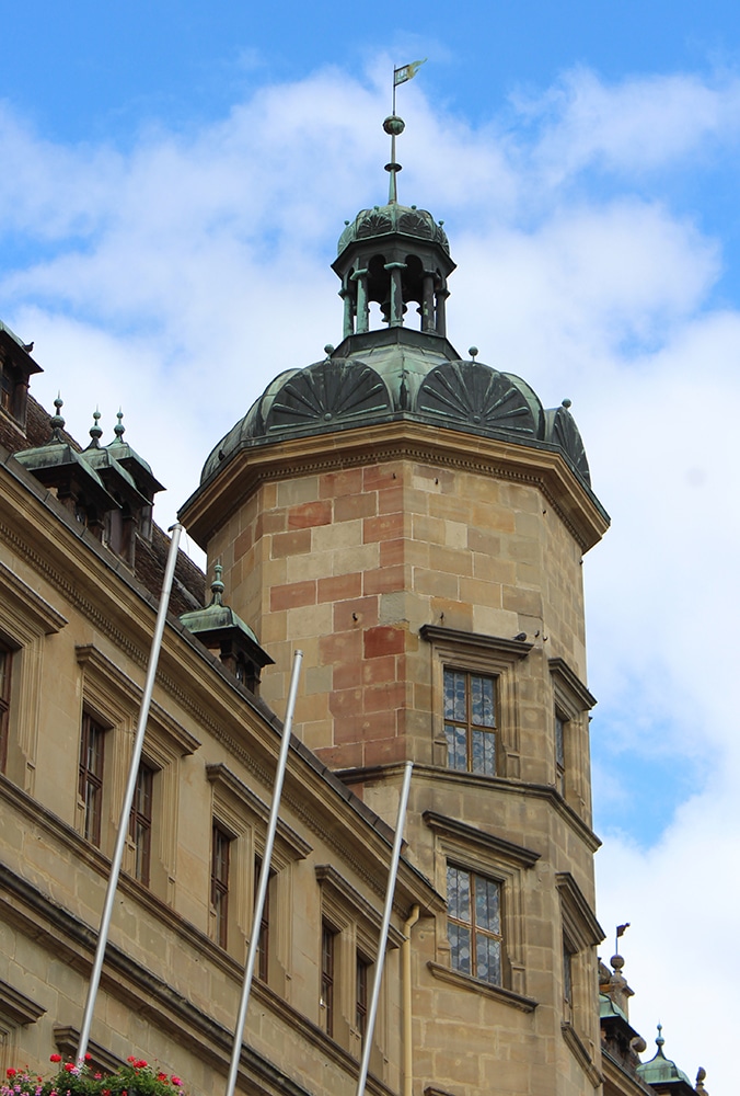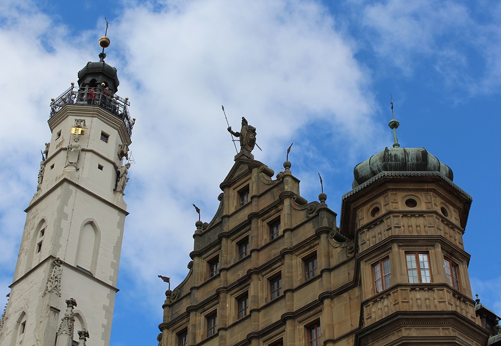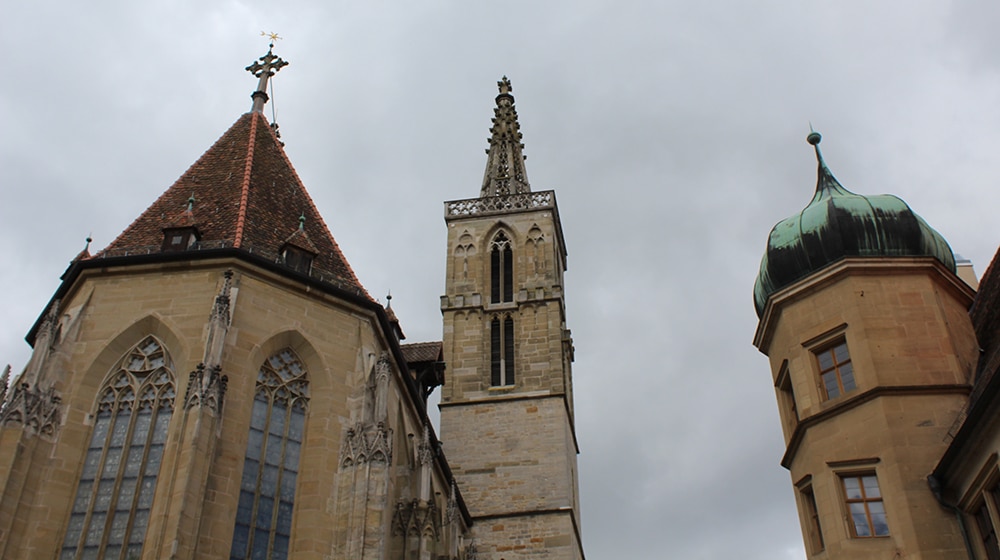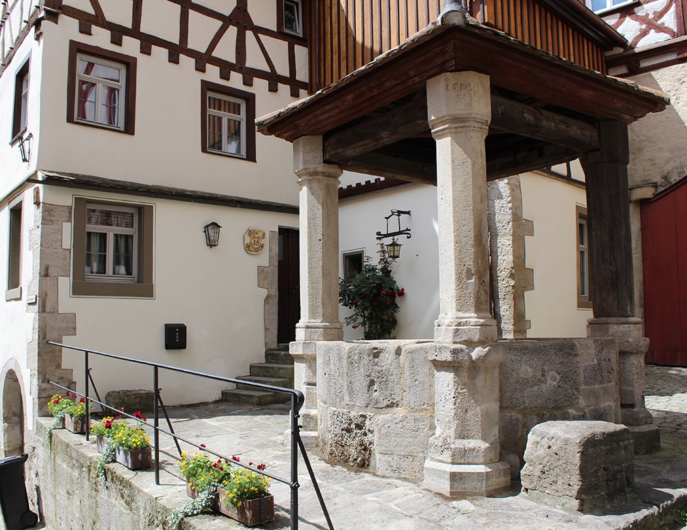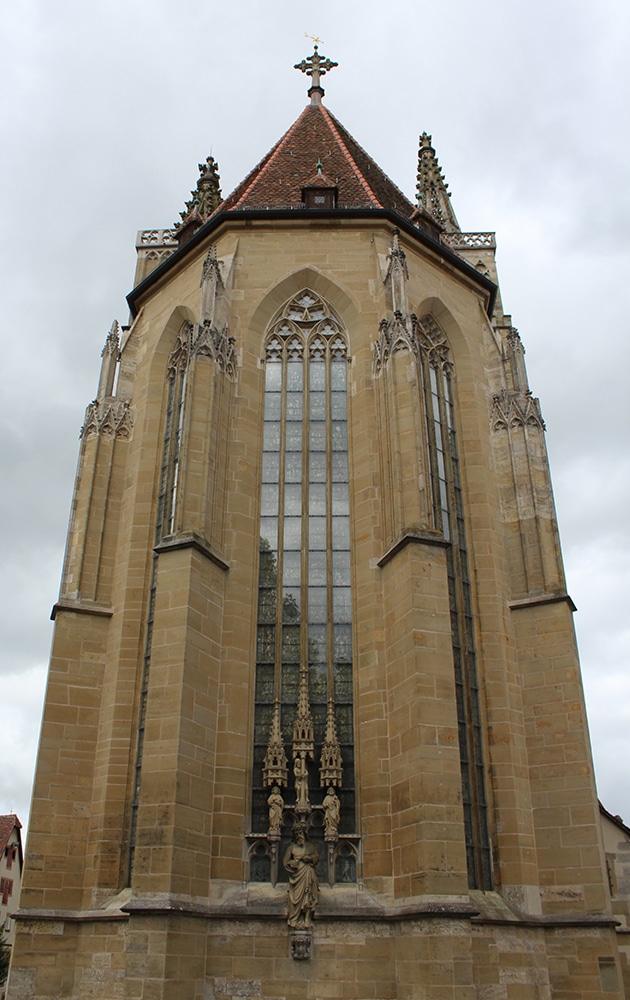 The Town Hall consists of two parts and three architectural styles, which blend beautifully. The white portion was originally a Gothic Doppelbau (double-building) built around 1250. Only the slender, almost 200-foot tall bell tower and its Imperial Hall survived when the rest was destroyed by a fire in 1501. You can climb to the top for a great view of Rothenburg. The most dominating part of the building – with its Renaissance facade – was added in the 1570s. With the help of the oriel windows (turret) and a few other tweaks, the architect joined the two buildings together pretty harmoniously. The Baroque archway, which provides cover and also a foundation for the patio with lovely flowers up top, was added in 1681.