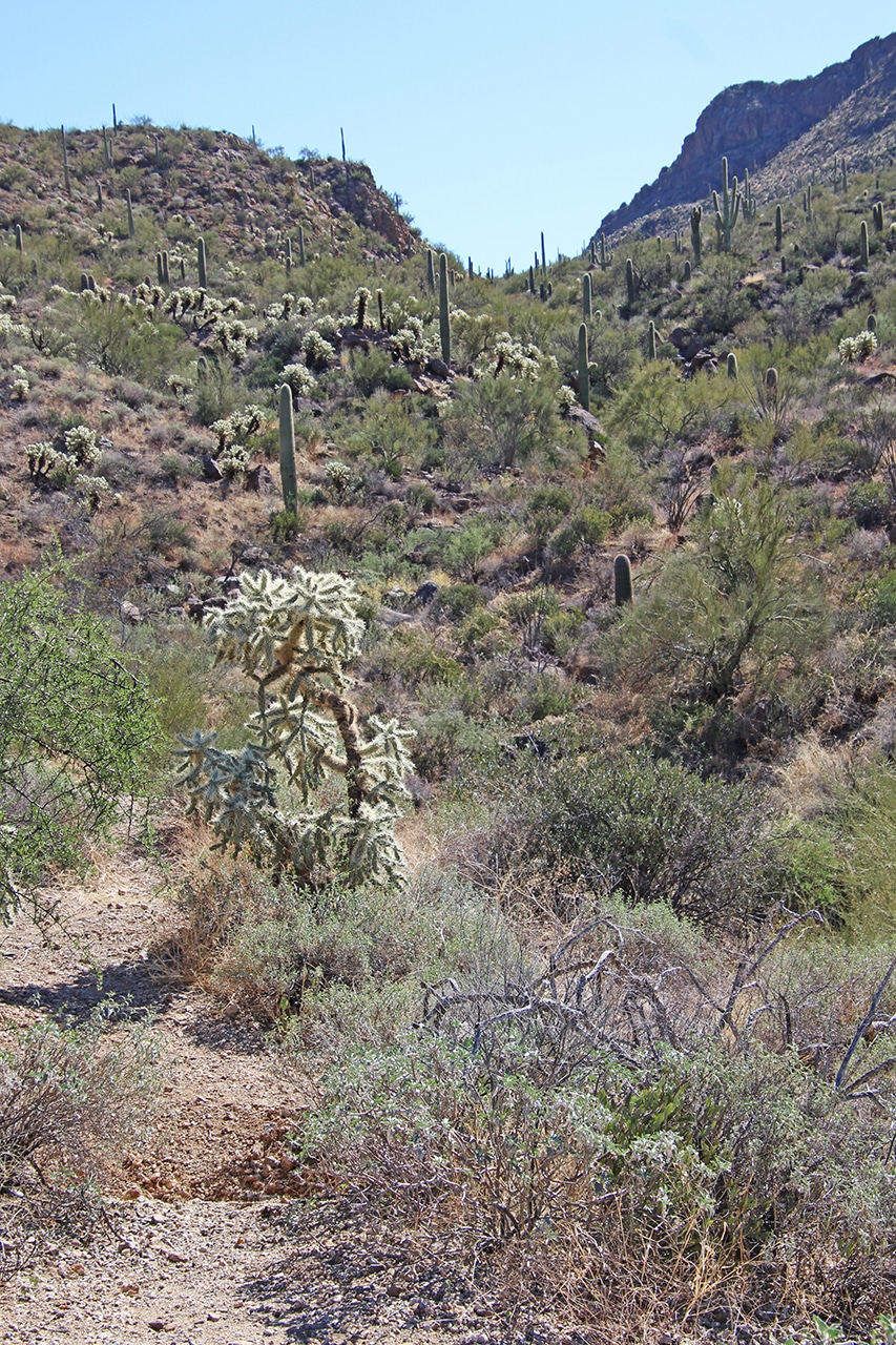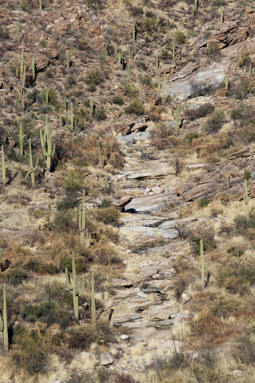The saguaros in this section are large, but less plentiful than those at the TMD in the west, with lots more shrubbery and other vegetation. As the elevation rises a bit, numerous saguaros love the south side of the gently sloping hillside, but since cacti do not grow at the higher elevations – which make up the majority of the RMD – there are fewer saguaros in the Rincon District.