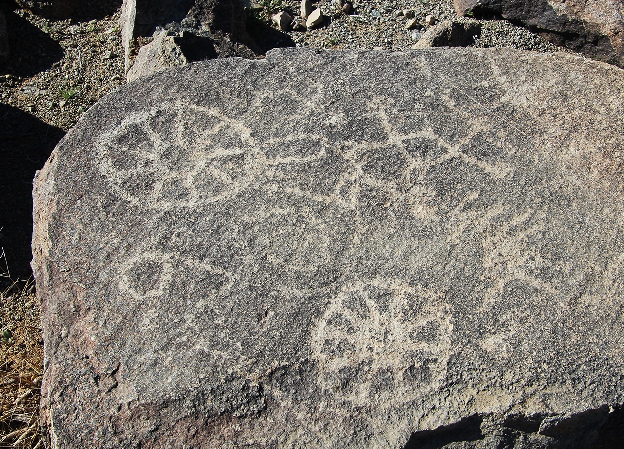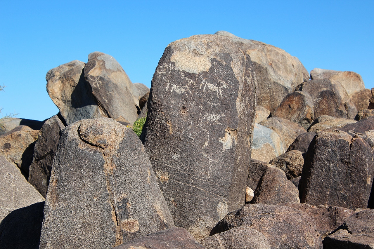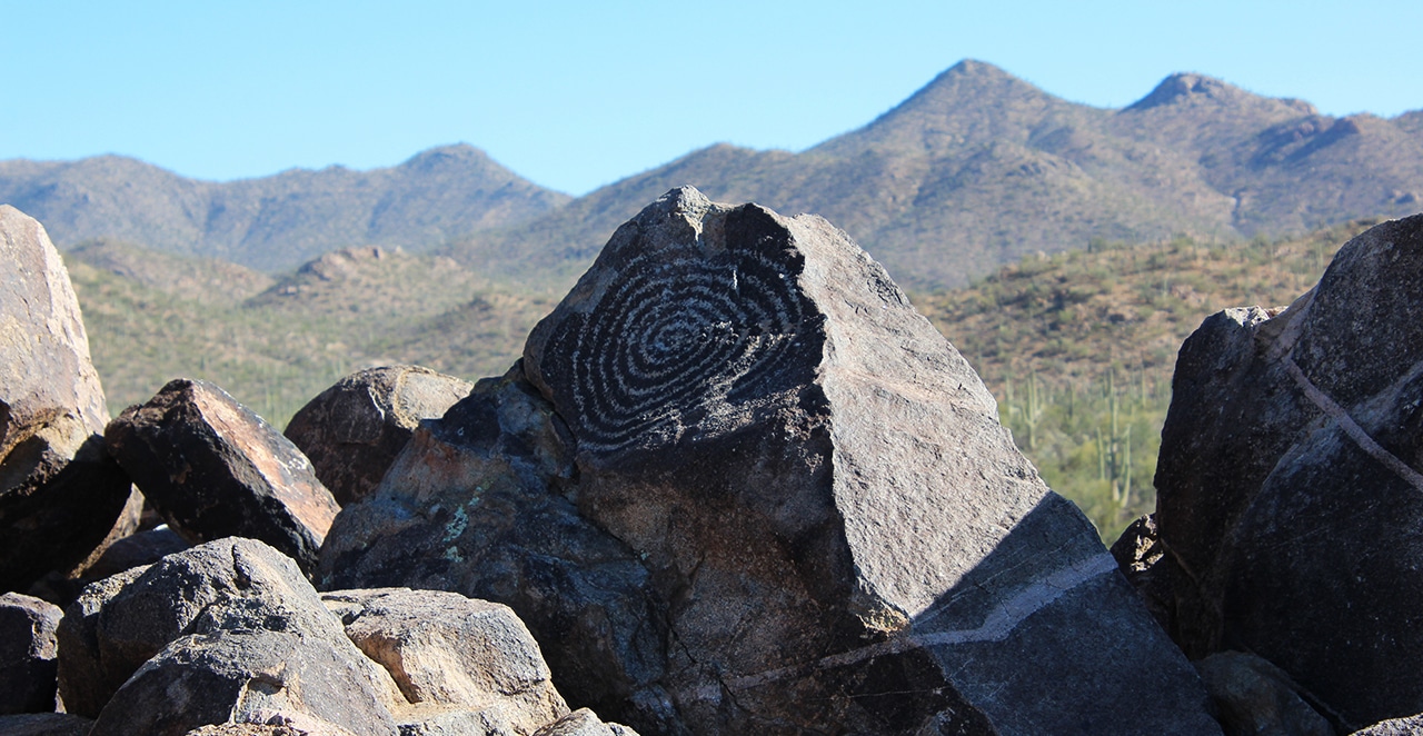 Signal Hill petroglyphs site offers dozens of images viewable from a short trail. The large spiral image in the fourth photo is located at the top of the hill. In the background is Wasson Peak and Sombrero Peak and a dense Saguaro forest.