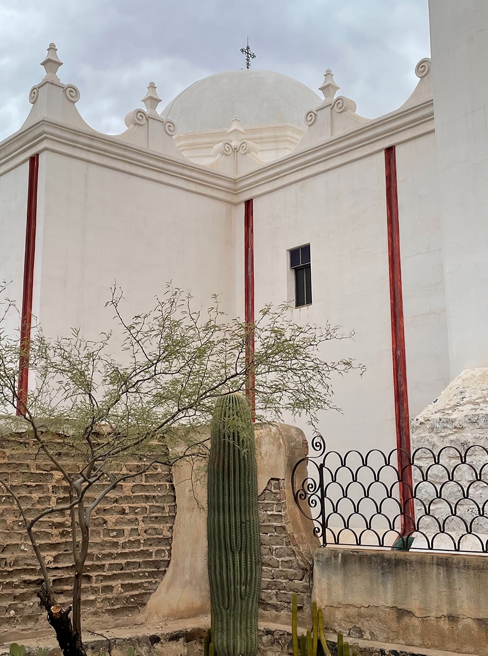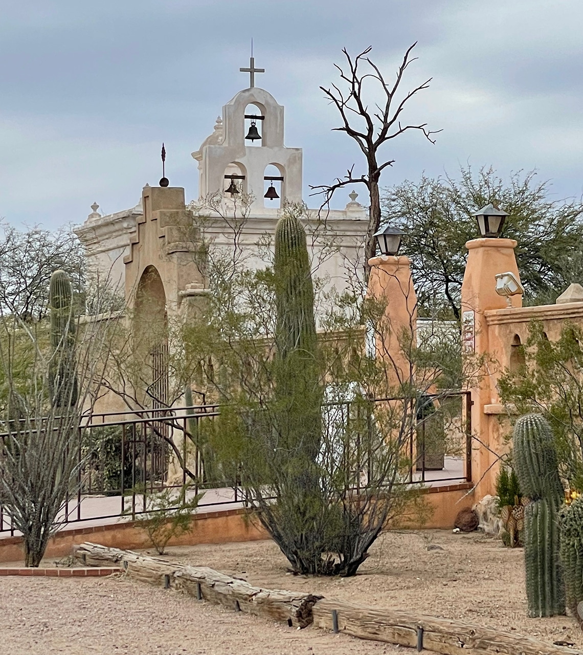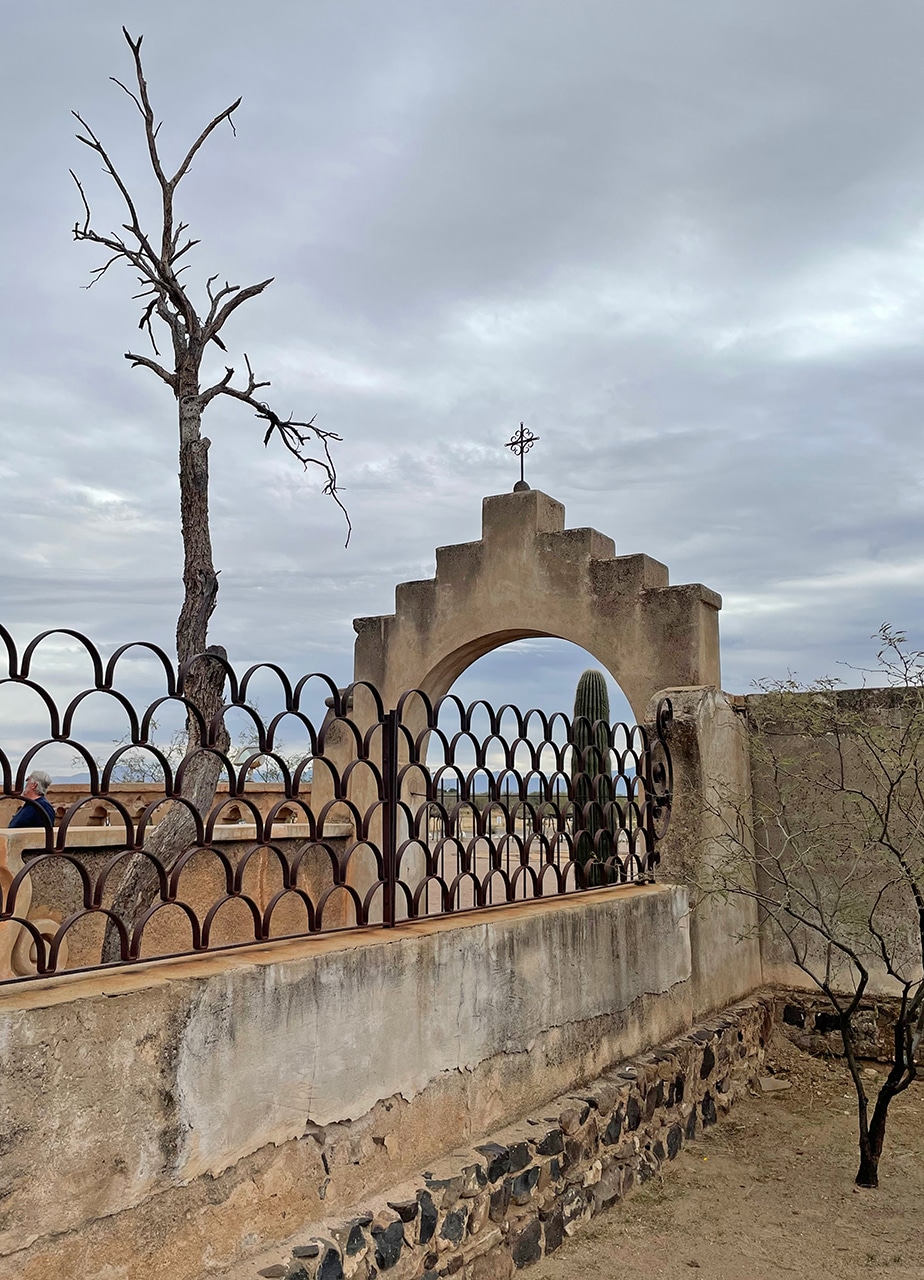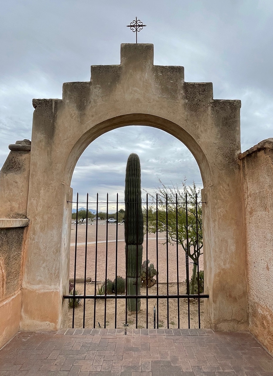 We were able to explore a courtyard to the right of the larger church, which contained a little color and more desert landscaping. Just beyond our reach today was Grotto Hill, located just to the east of the Mission on the Tohono O’odham Nation. Grotto Hill is named for a small religious shrine tucked into the rocks and also known for the white cross on its peak. Your gifts for winding around the hill on this easy, quarter-mile trail are a great overview of the grounds, big vistas, and 360° views of the Santa Catalinas, the Rincons, the Santa Ritas and the Tucson Mountains. It was closed today, but note to Jim: next time!