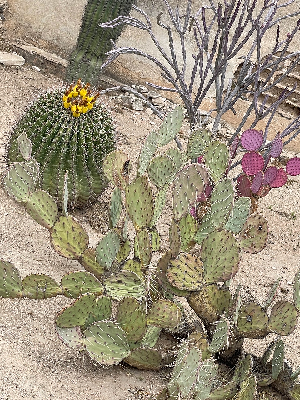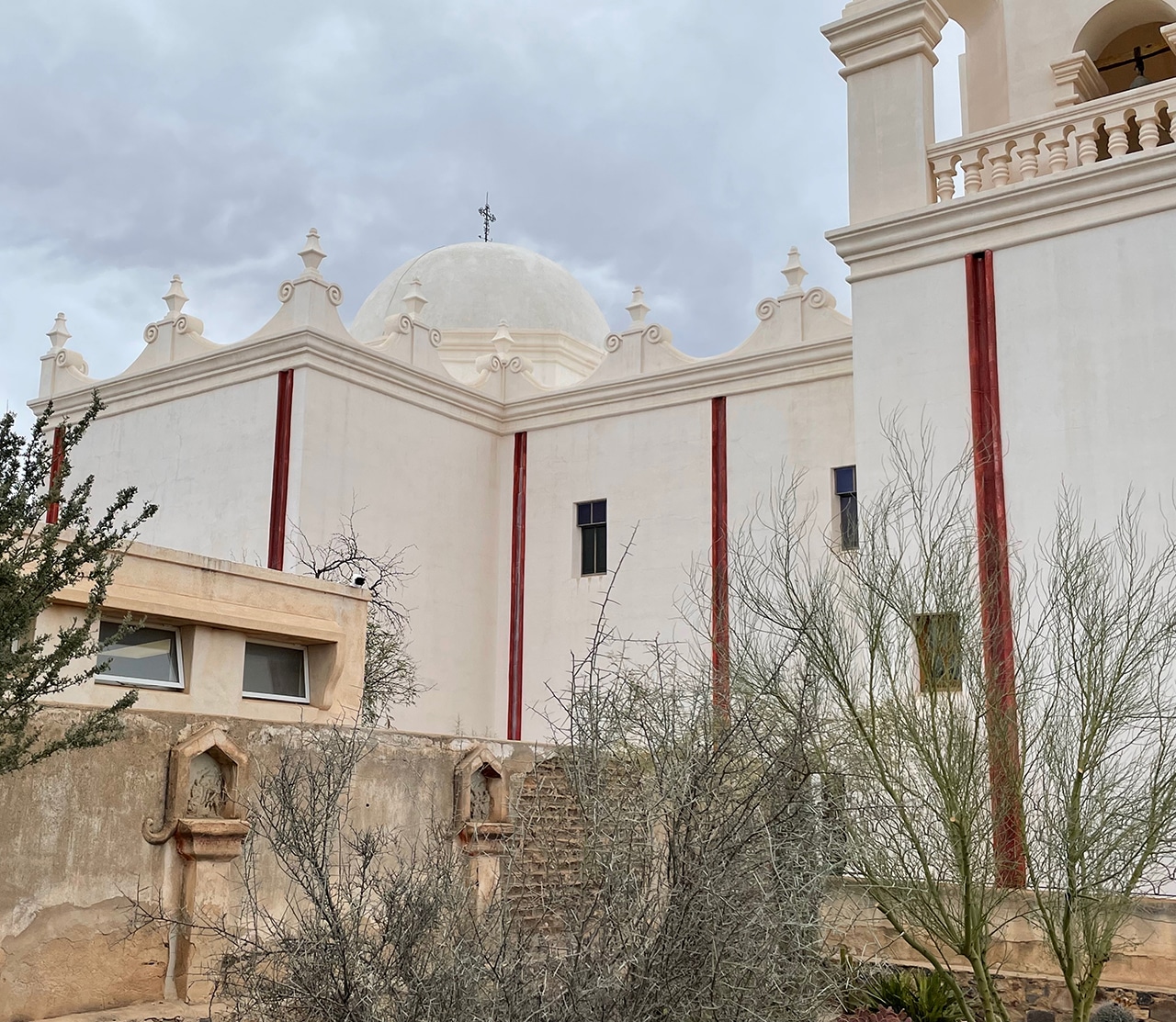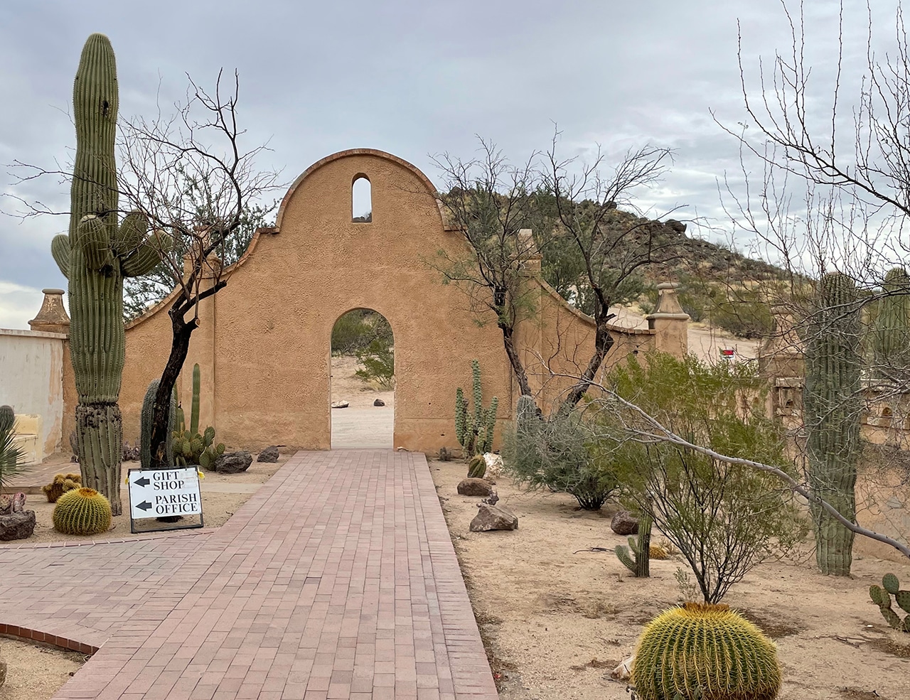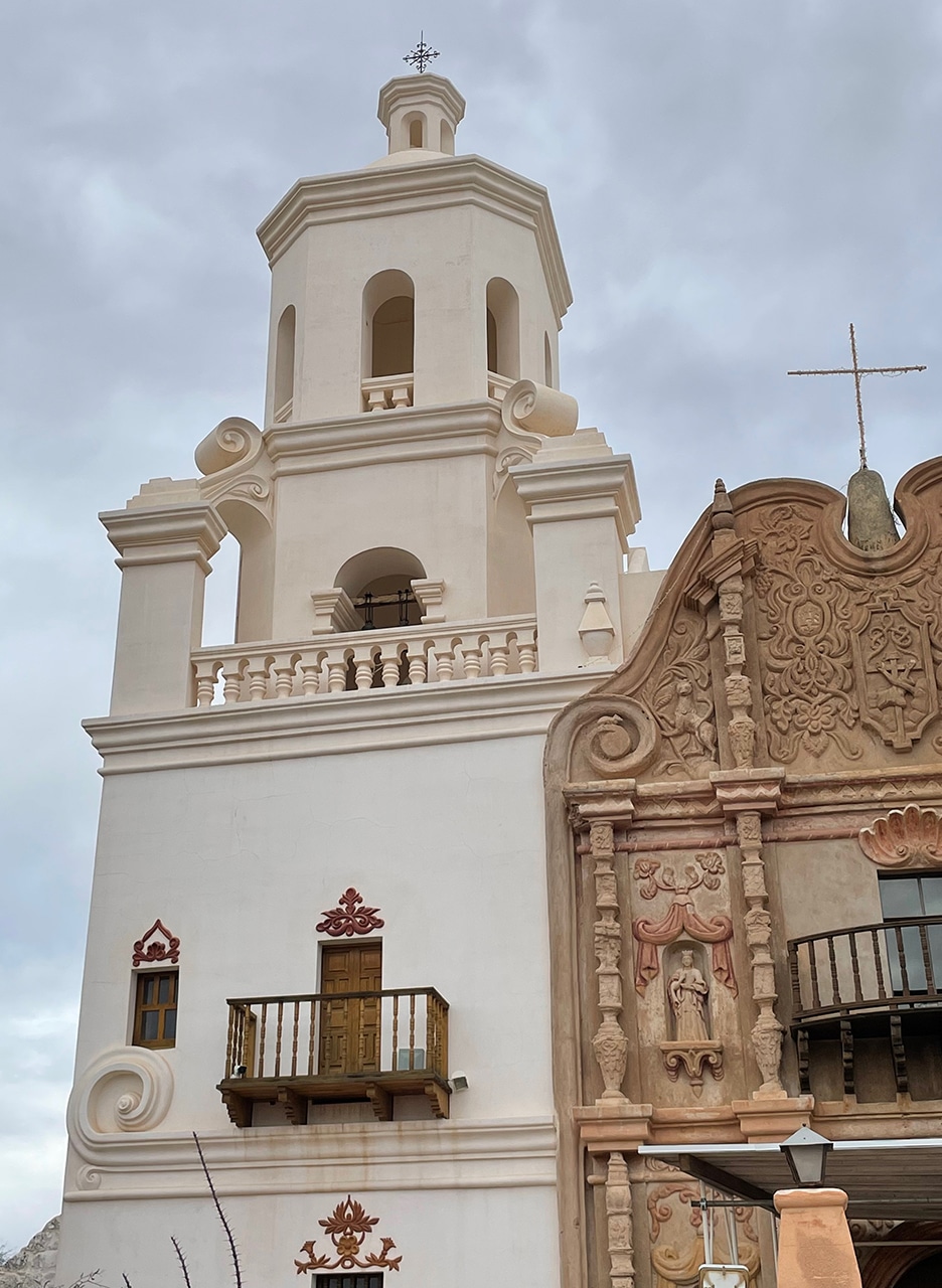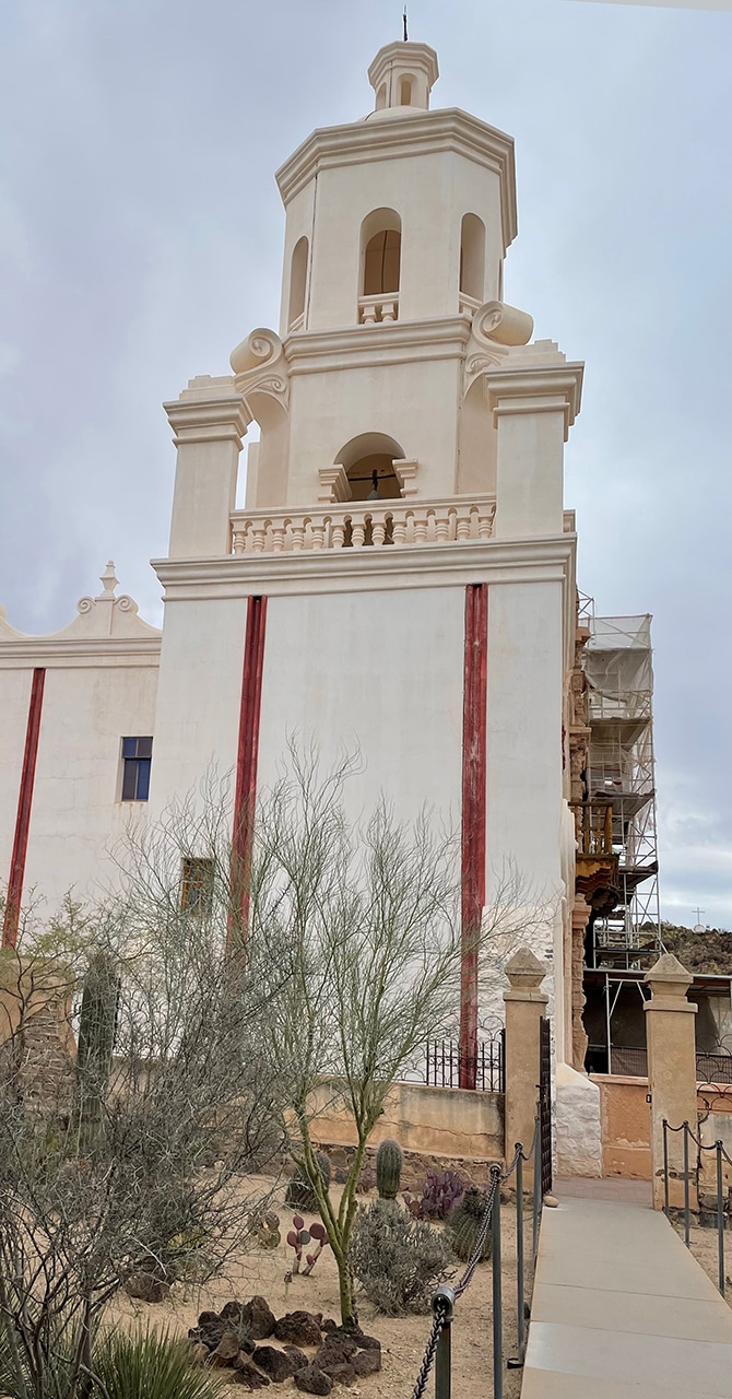 We were able to explore a courtyard to the right of the larger church, which contained a little color and more desert landscaping. Just beyond our reach today was Grotto Hill, located just to the east of the Mission on the Tohono O’odham Nation. Grotto Hill is named for a small religious shrine tucked into the rocks and also known for the white cross on its peak. Your gifts for winding around the hill on this easy, quarter-mile trail are a great overview of the grounds, big vistas, and 360° views of the Santa Catalinas, the Rincons, the Santa Ritas and the Tucson Mountains. It was closed today, but note to Jim: next time!