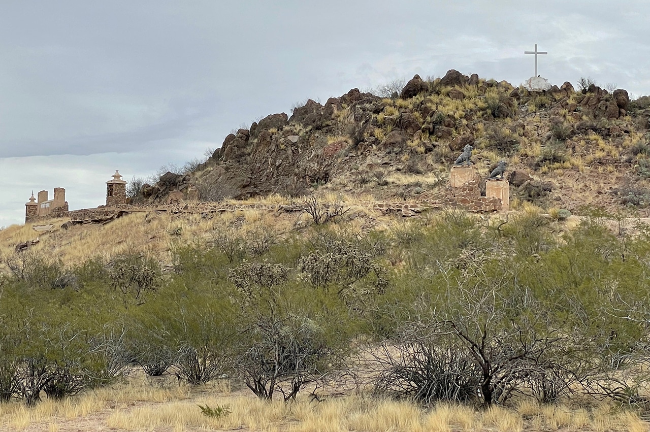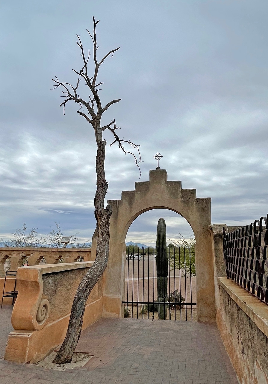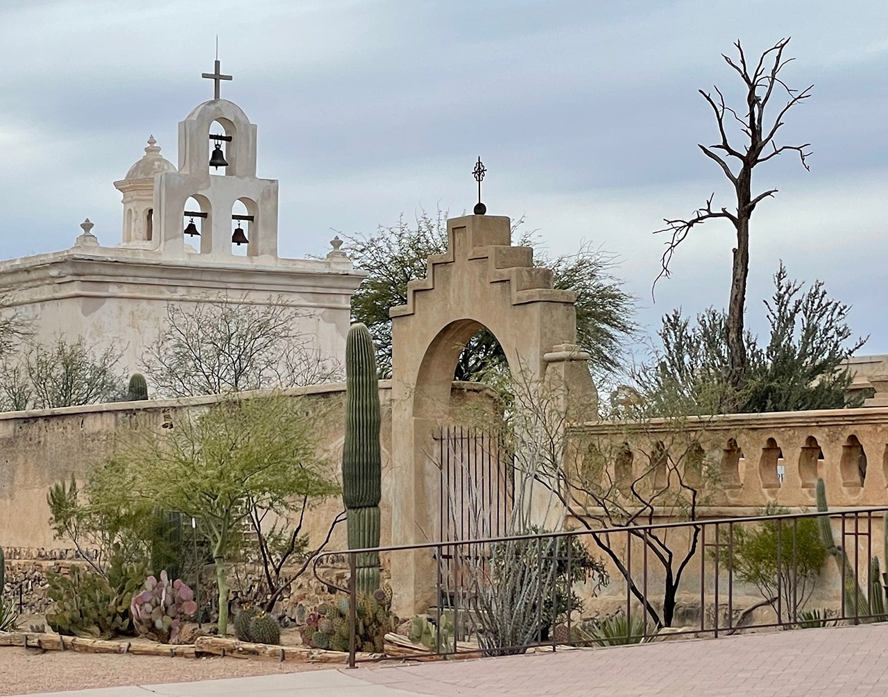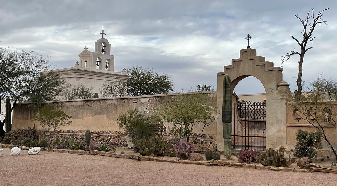 We were able to explore a courtyard to the right of the larger church, which contained a little color and more desert landscaping. Just beyond our reach today was Grotto Hill, located just to the east of the Mission on the Tohono O’odham Nation. Grotto Hill is named for a small religious shrine tucked into the rocks and also known for the white cross on its peak. Your gifts for winding around the hill on this easy, quarter-mile trail are a great overview of the grounds, big vistas, and 360° views of the Santa Catalinas, the Rincons, the Santa Ritas and the Tucson Mountains. It was closed today, but note to Jim: next time!
