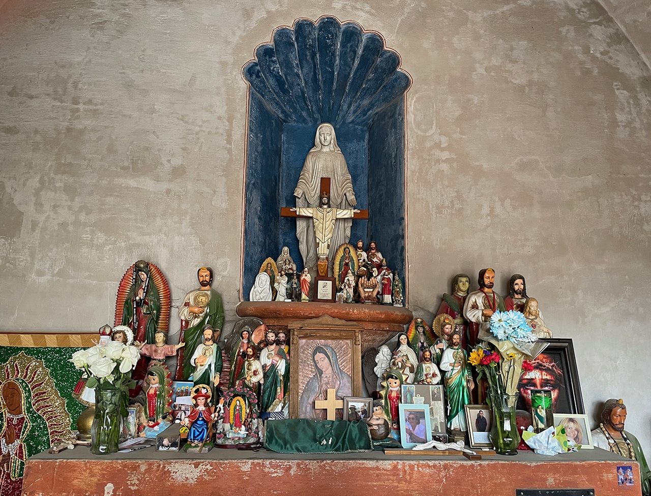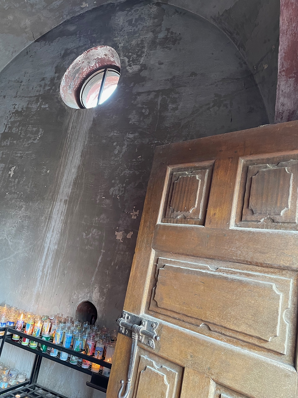 We were able to enter the smaller chapel, where candles could be lit for loved ones (or a country) who may need a prayer. Many statues were in and around the beautiful blue niche and there was room to kneel and pray should you so desire. A beautiful courtyard between the churches contained some desert landscaping, memorials, photos and great views of the exterior of the larger church and the dark skies.