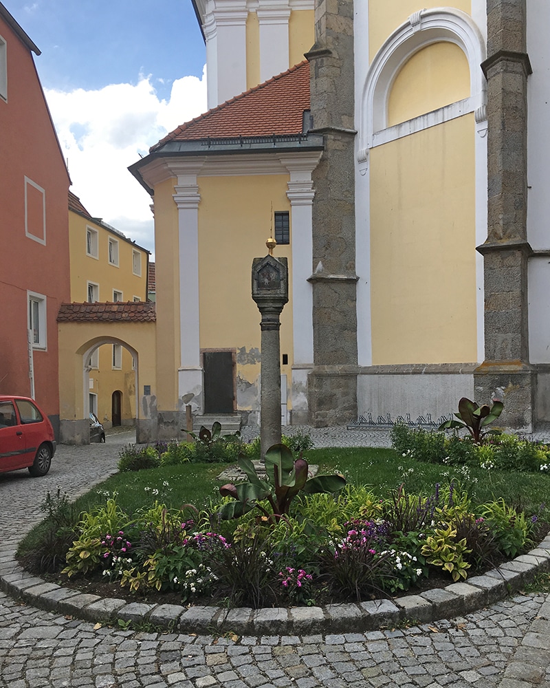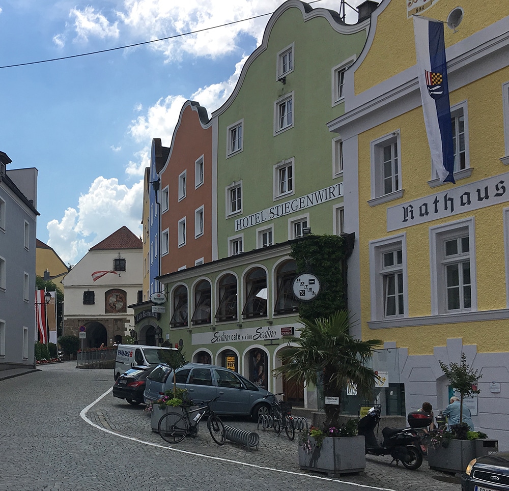Schärding is a beautiful place with lots of color, flowers, curved gabled roofs and cobblestones (of course). A very neat and tidy place, with rows of differently-colored houses which used to reflect the types of businesses within.