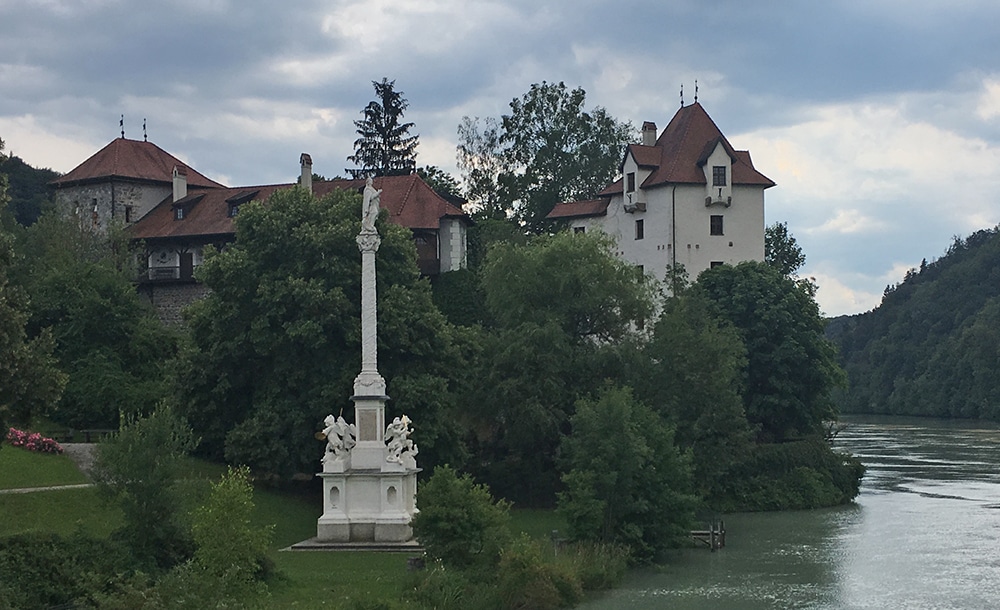 In the photo on the right, the Landhotel zur Mariensaule stands close to the river’s edge and the Marian Column stands in the forefront, with the Wernstein Castle behind. That last link will show some gorgeous photos from all angles of this entire area.