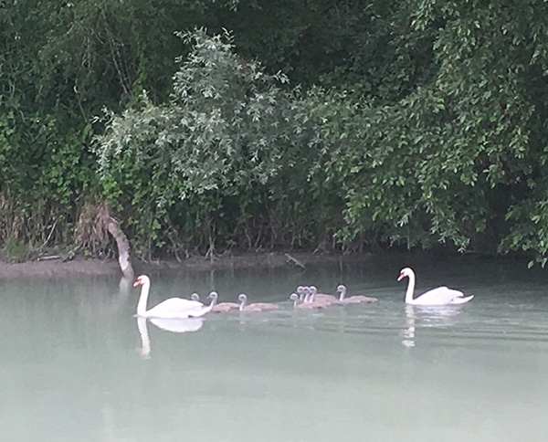 The entire trip wasn’t really what we were expecting. Touted as a float through a nature preserve, our only wildlife viewings were several swan families. Not that I don’t love swans and their cygnets. Who knew that swan babies are grey like the photo below or were called cygnets! Maybe we’re getting spoiled. Just shut up and relax and enjoy the float.
