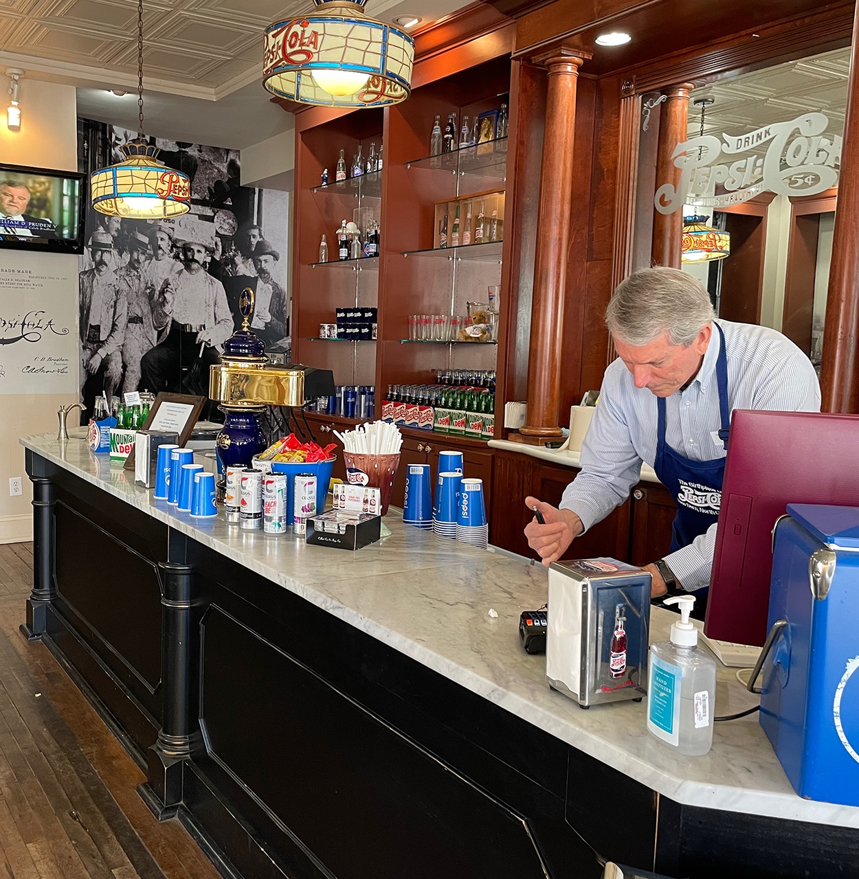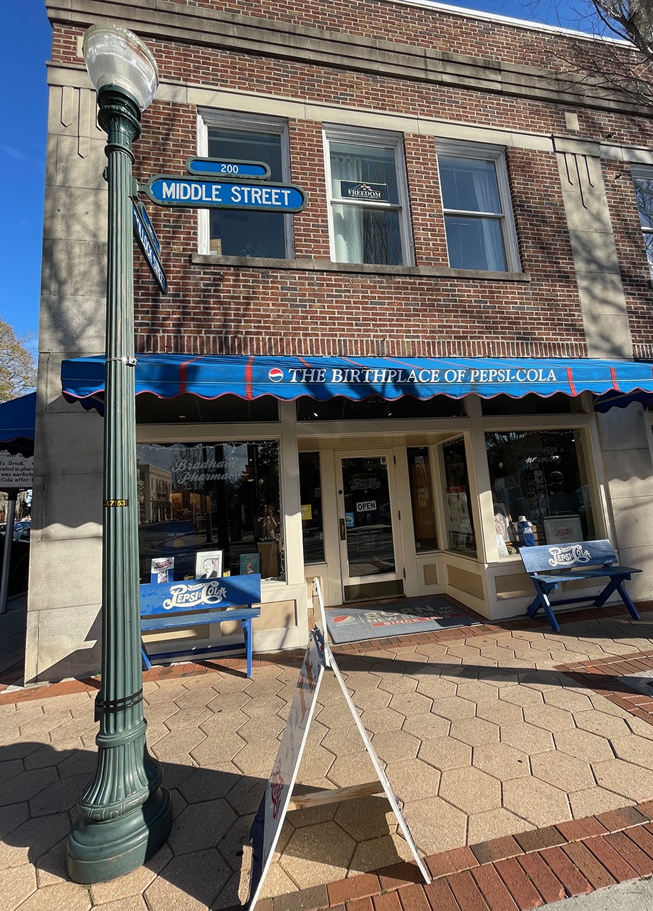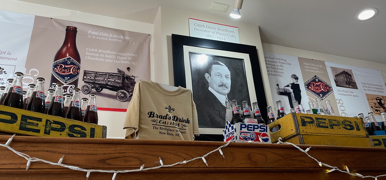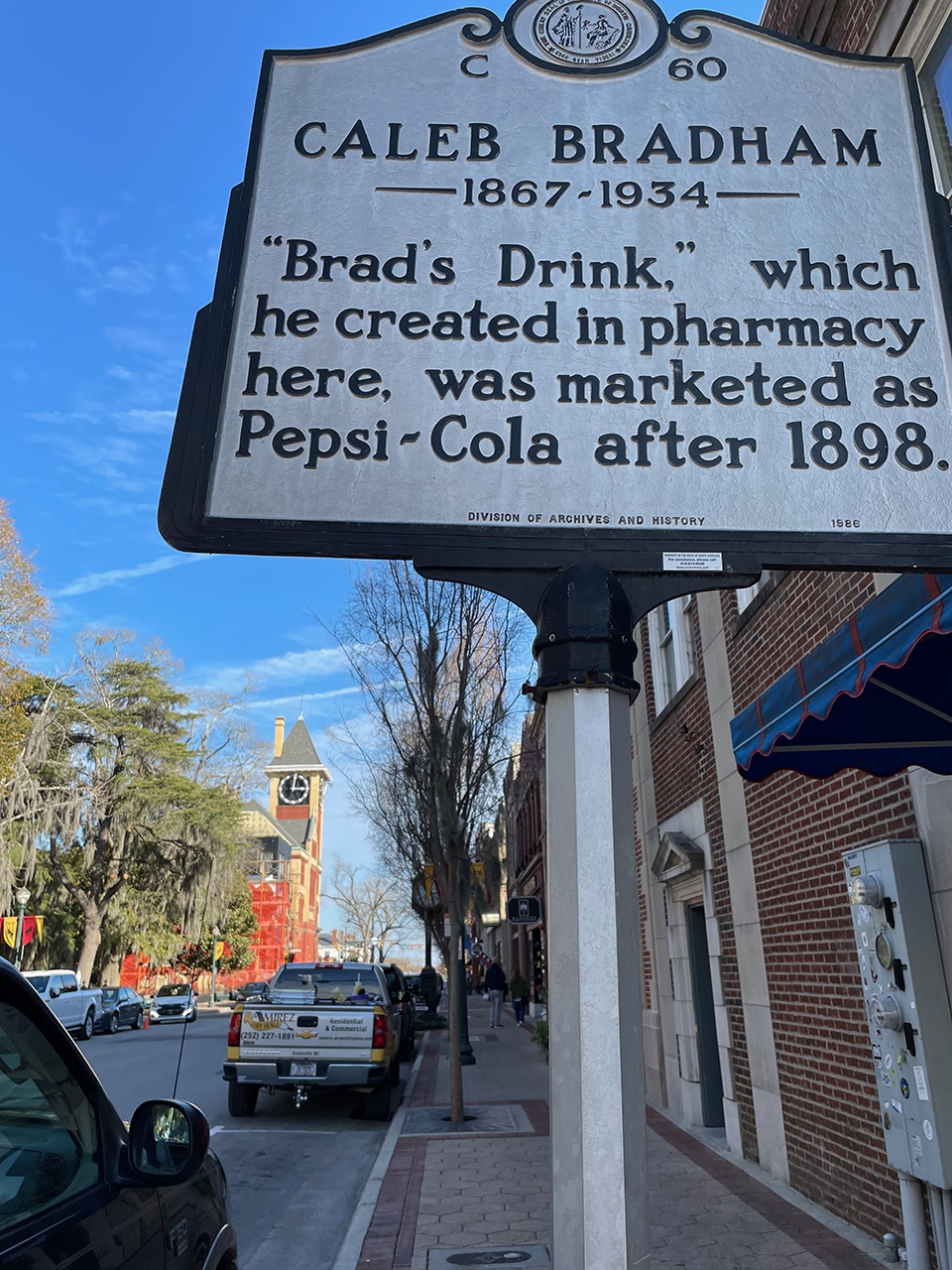 “Beginning in 1893, New Bern pharmacist Caleb Bradham developed and began serving a carbonated drink he called “Brad’s Drink.” He served the beverage from the soda fountain in his pharmacy at the corner of Pollock and Middle Streets.