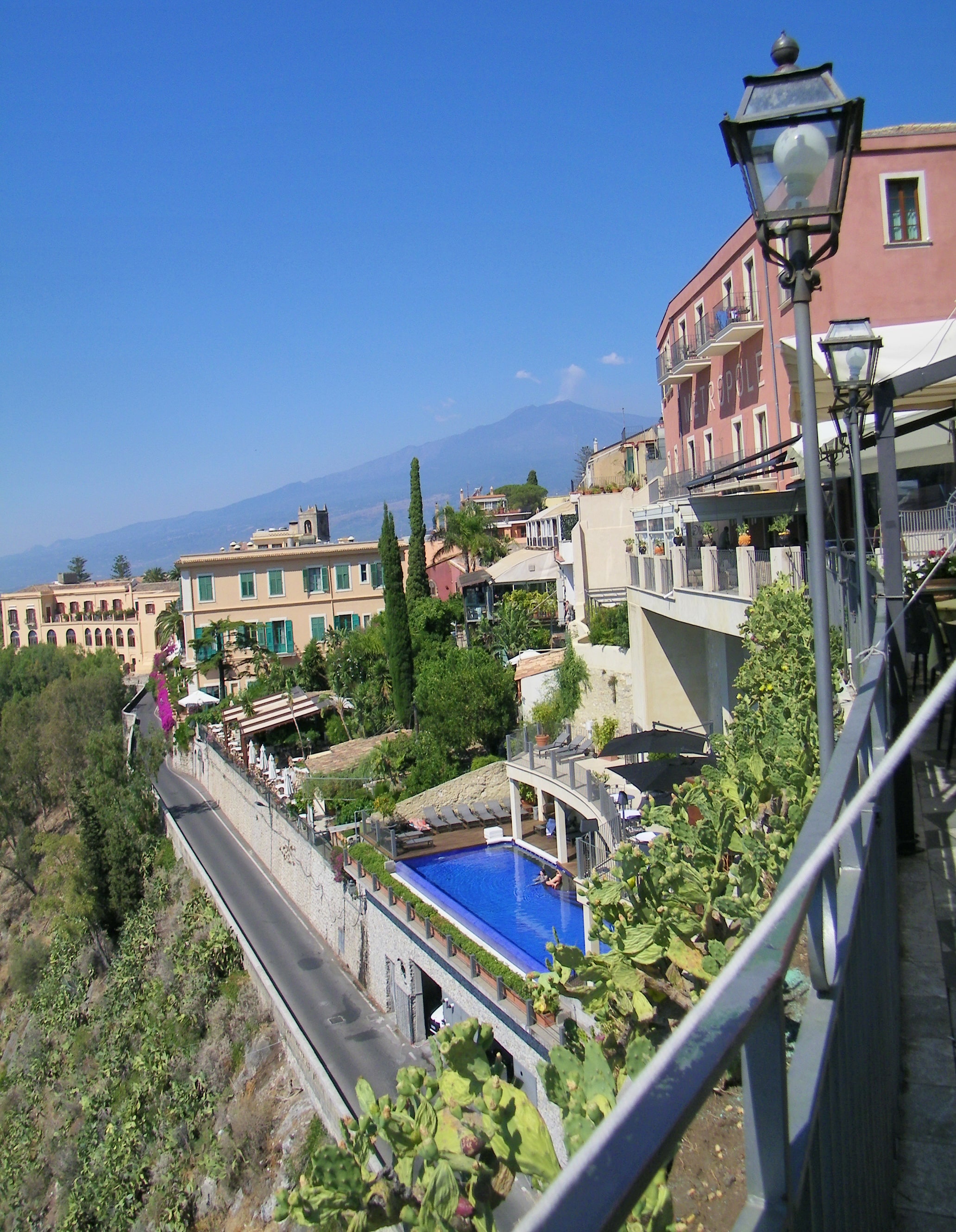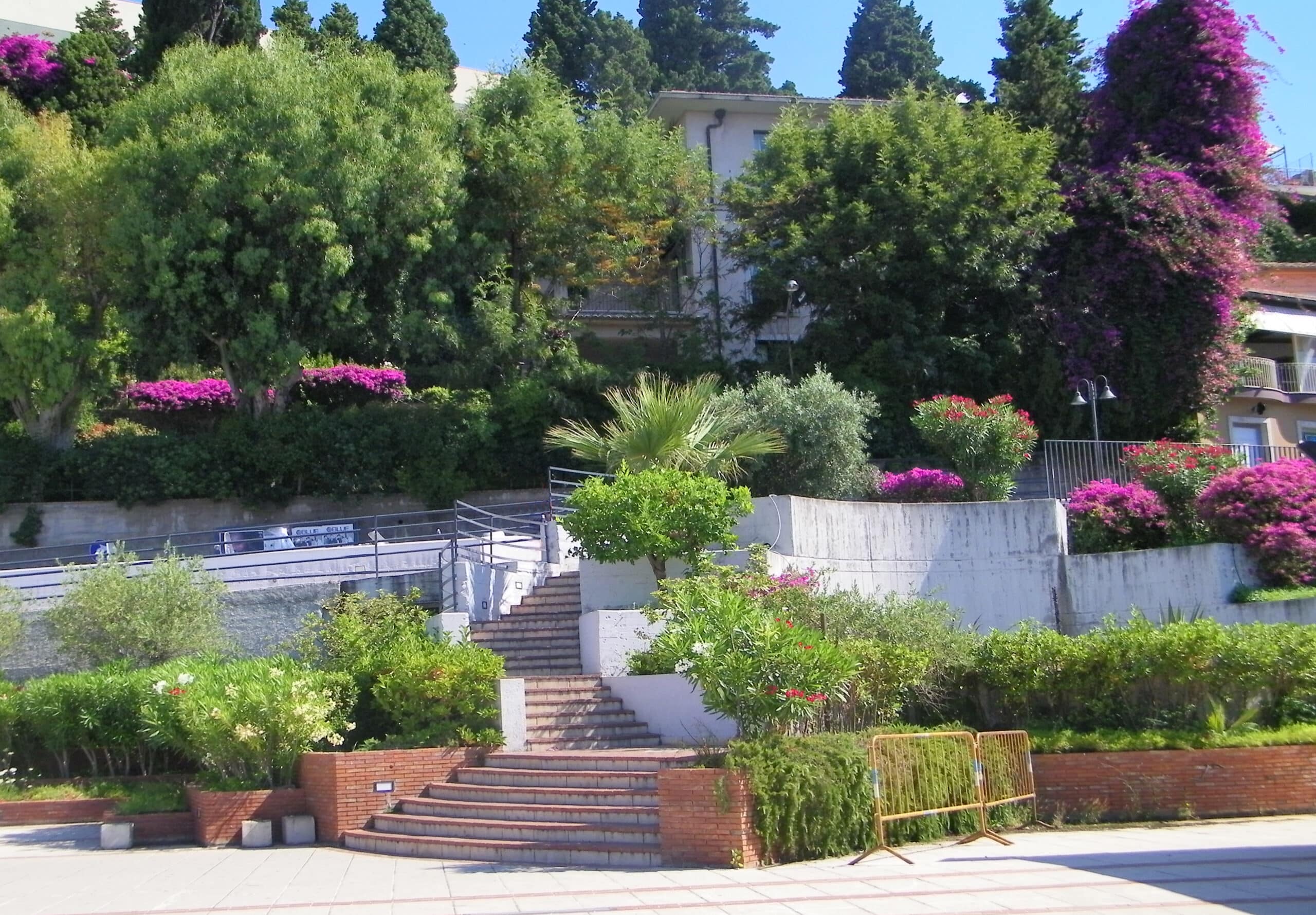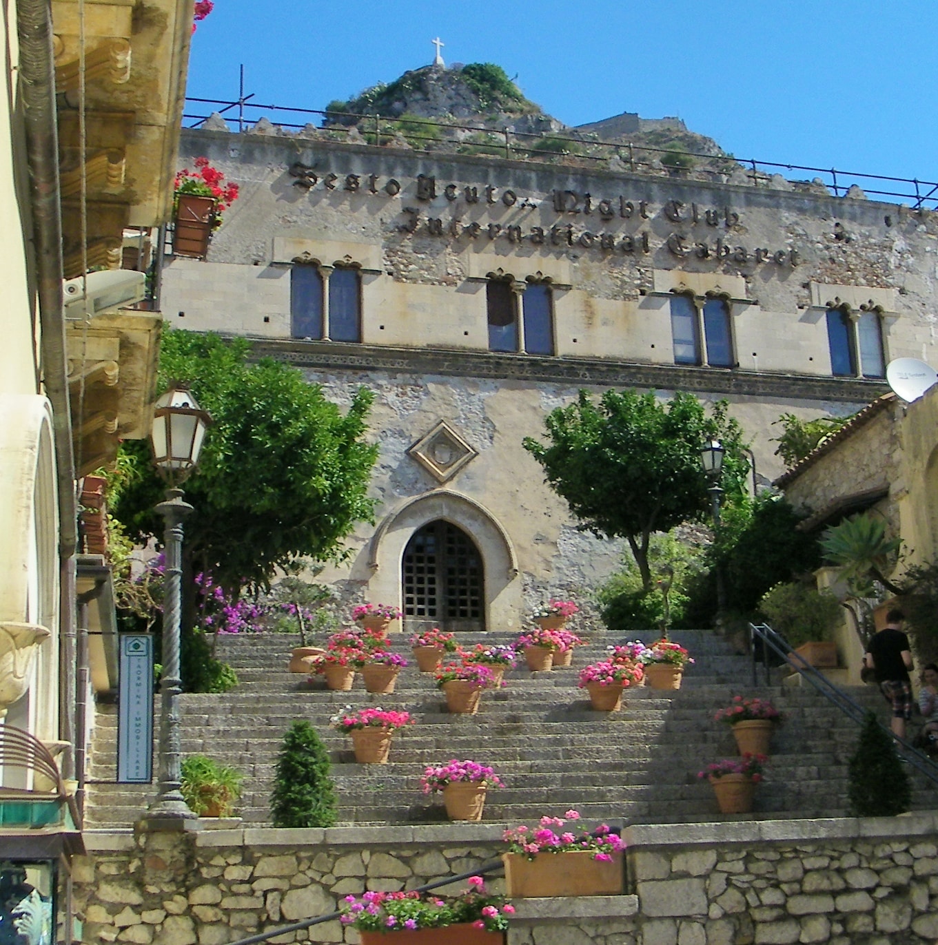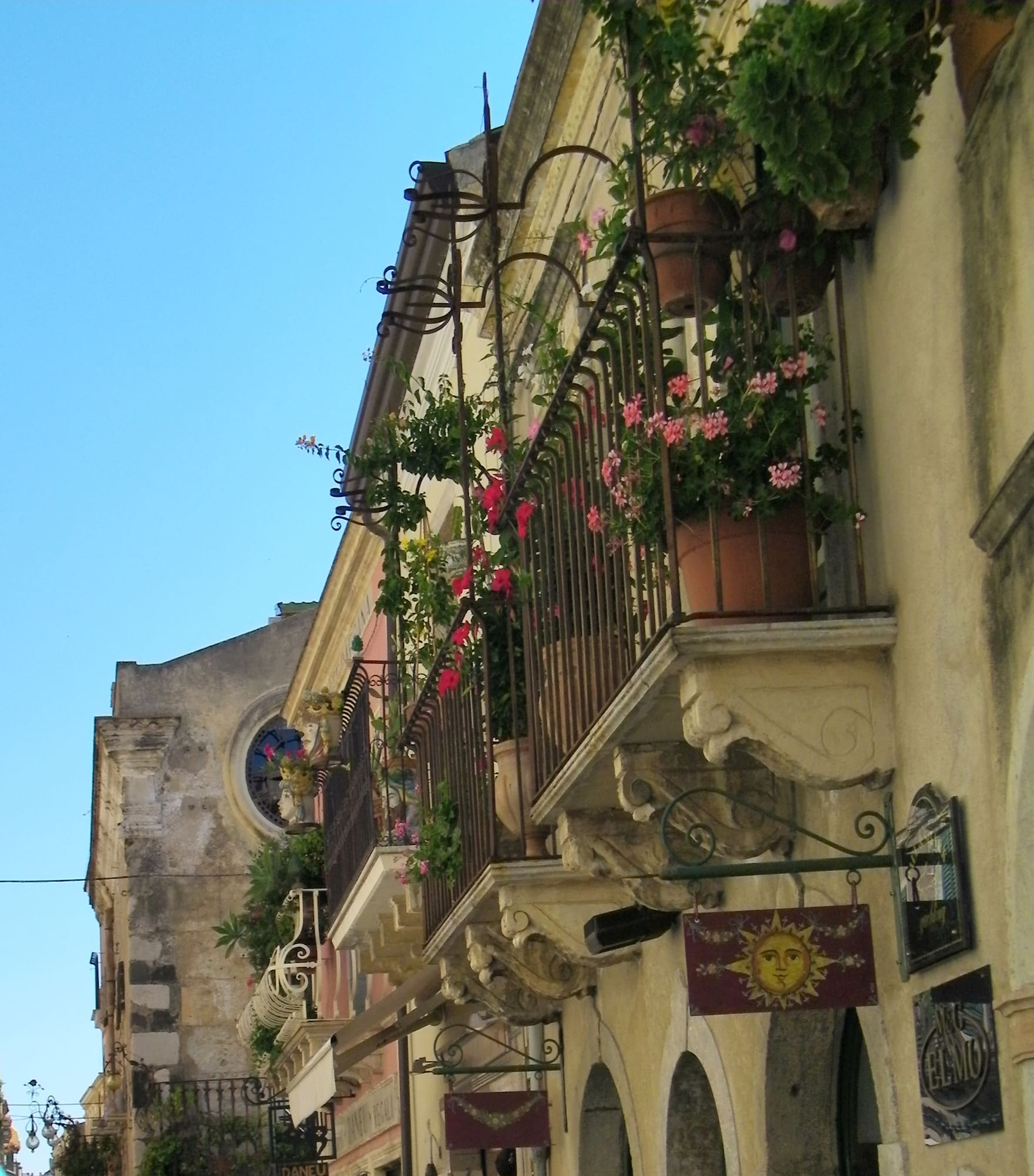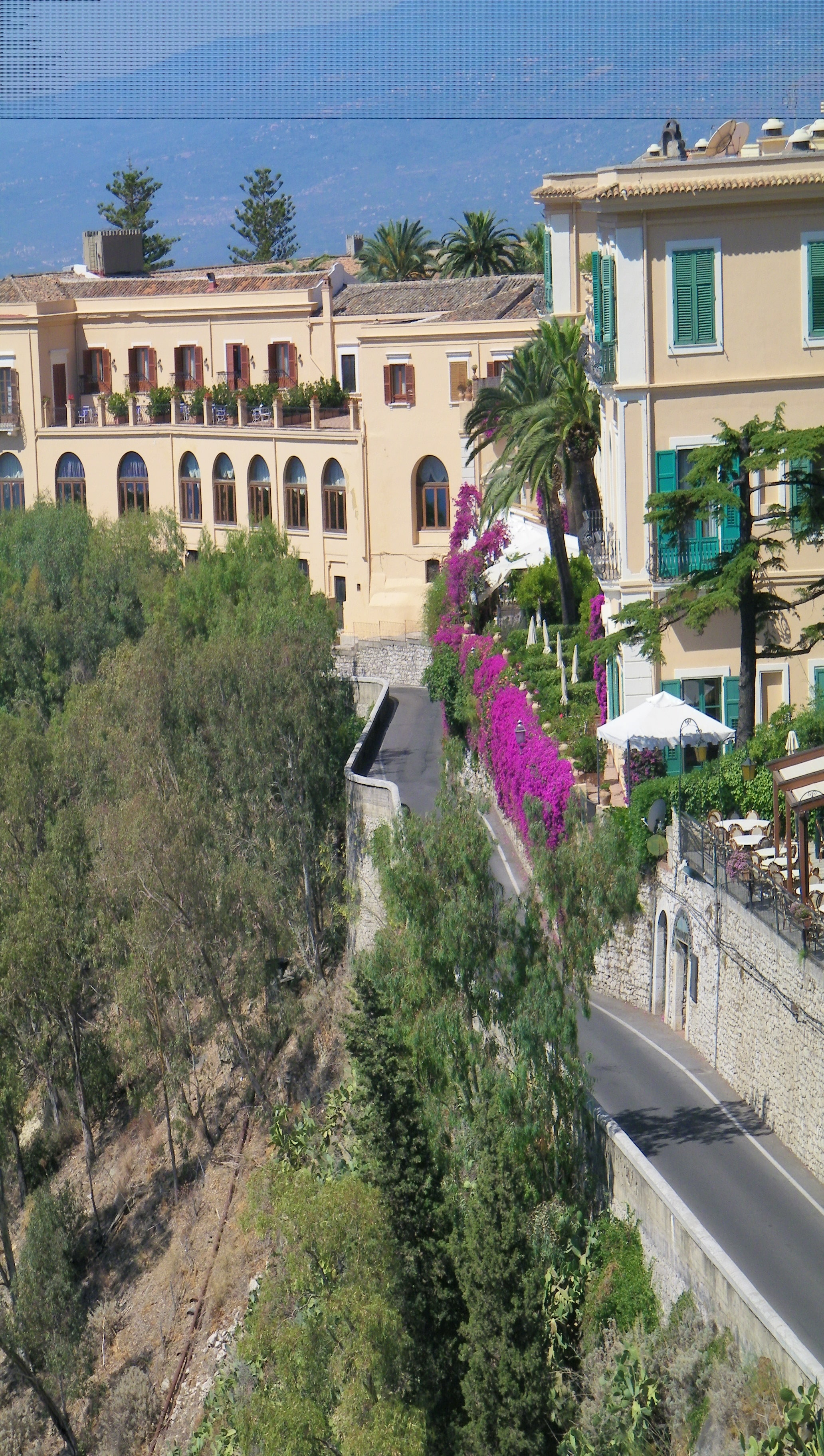 Our walking tour began with our arrival in Taormina near an exhibition center called Palazzo Corvaia, where the Sicilian Parliament of Nobles met In 1410. We walked past lovely flowers and fabulous old architecture. And whenever we could catch a glimpse of the Mediterranean, we gazed in awe.
