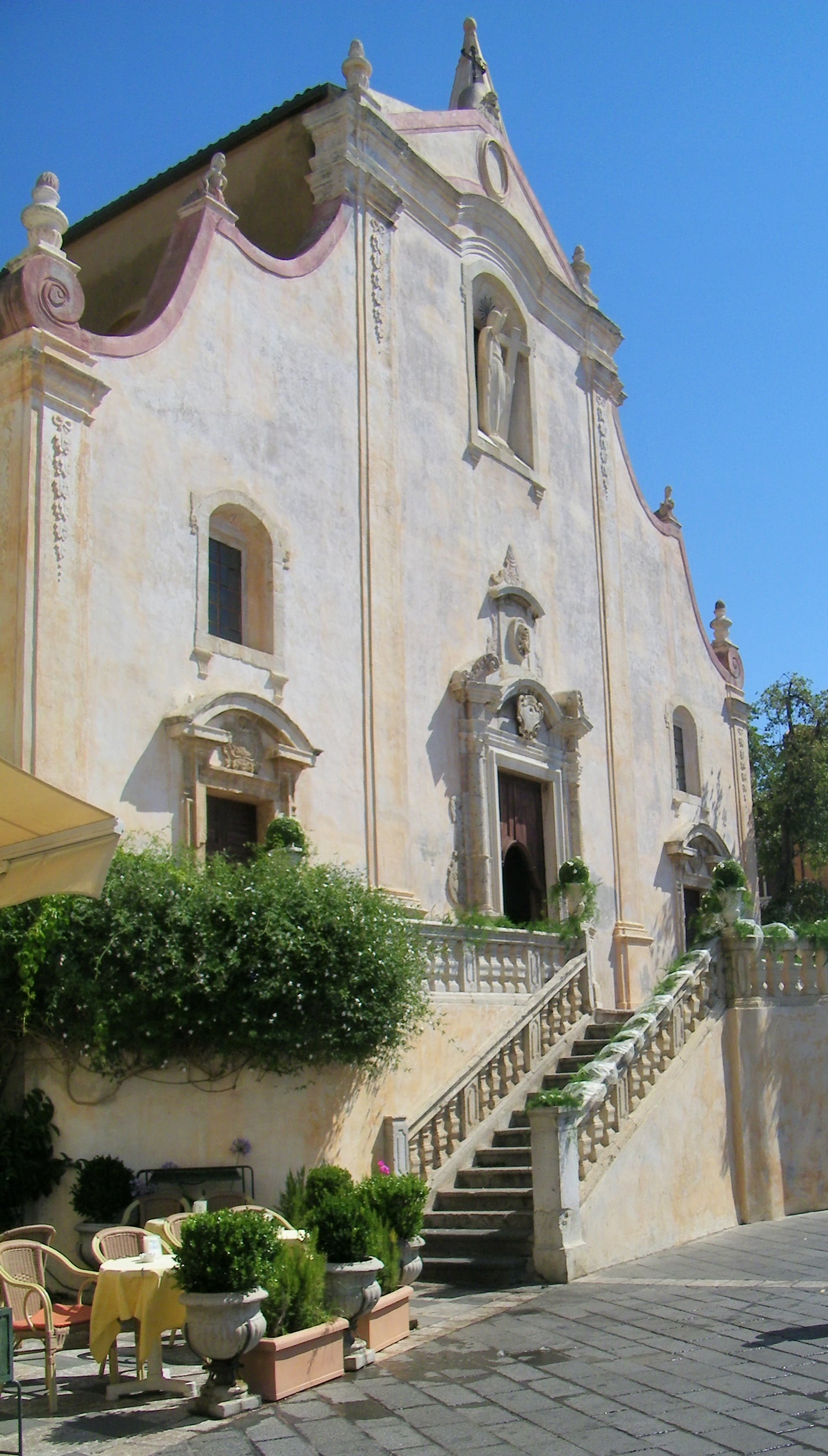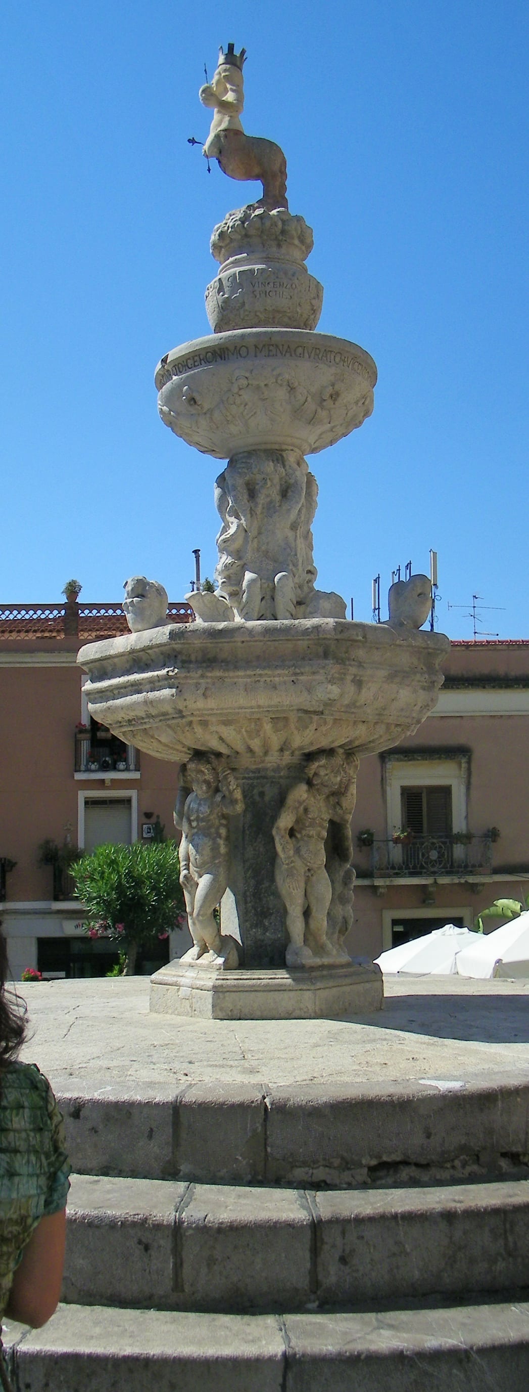 This was in the year 42 after the Apostle Paul visited Messina in hopes of converting the Sicilians to Christianity. Great numbers were persuaded and The Holy Mother was pleased by their devotion and granted them perpetual protection with the words “Vos et opossum civitatem benedicimus” – now inscribed on the base of the statue. We didn’t get any closer than the photo shows at the left, but what a marvelous story!