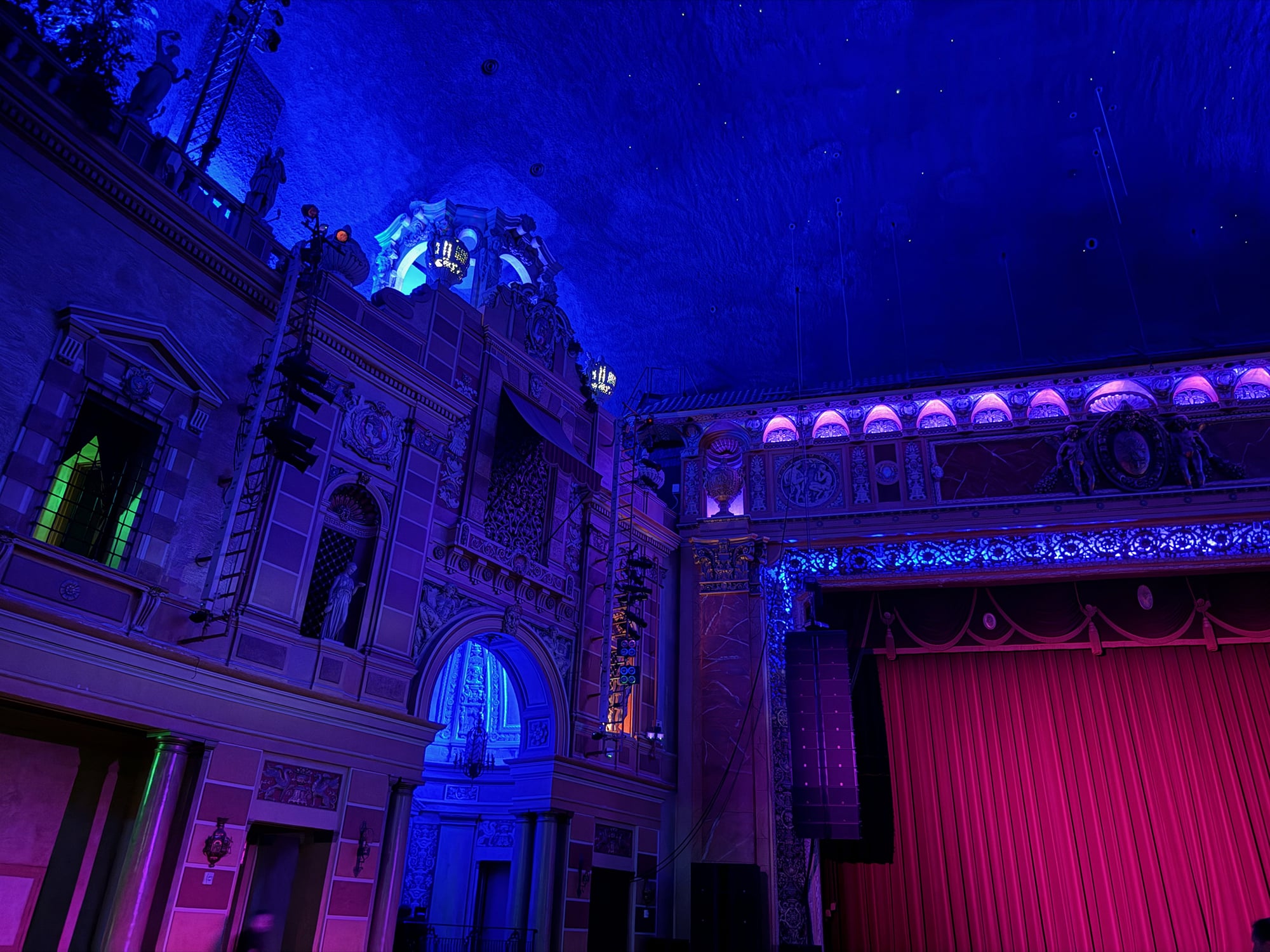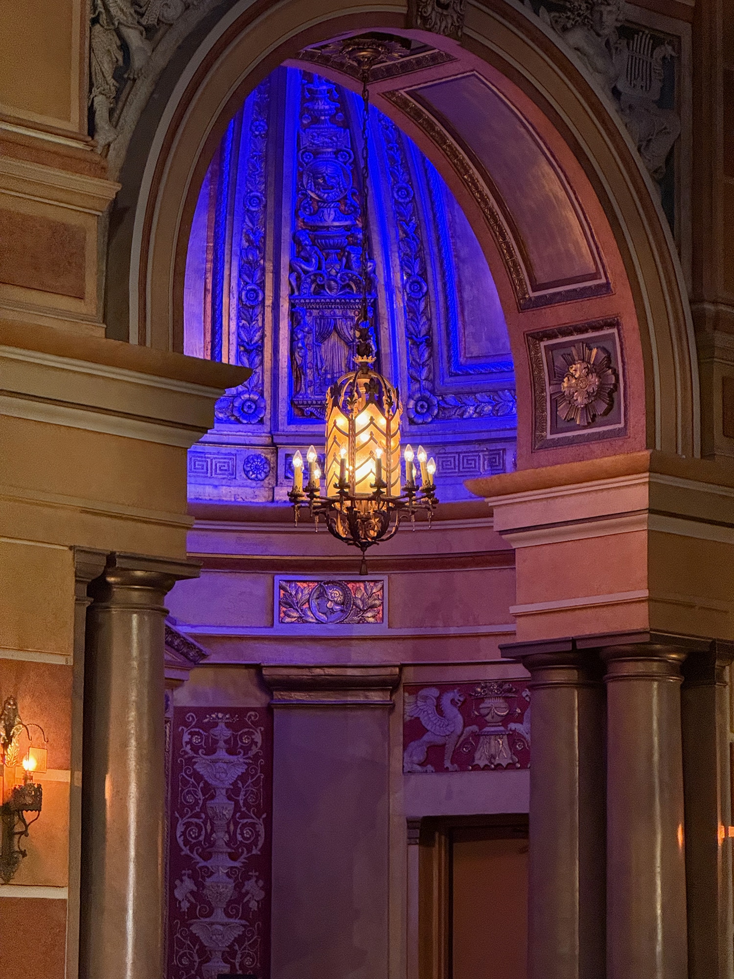 First of all, what can I say about the fantastic Saenger Theatre! The lobby and hallway had a very stately feel with shiny marble floors, rounded arches and subdued lighting by fantastic chandeliers. The theatre’s multi-color lighting near the ceiling provided a beautiful backdrop to statues and building facades of Roman times. And the ceiling was black with thousands of twinkling stars! This evening was just as much about this historic theatre as it was the music. But together, they made for a wonderful evening.