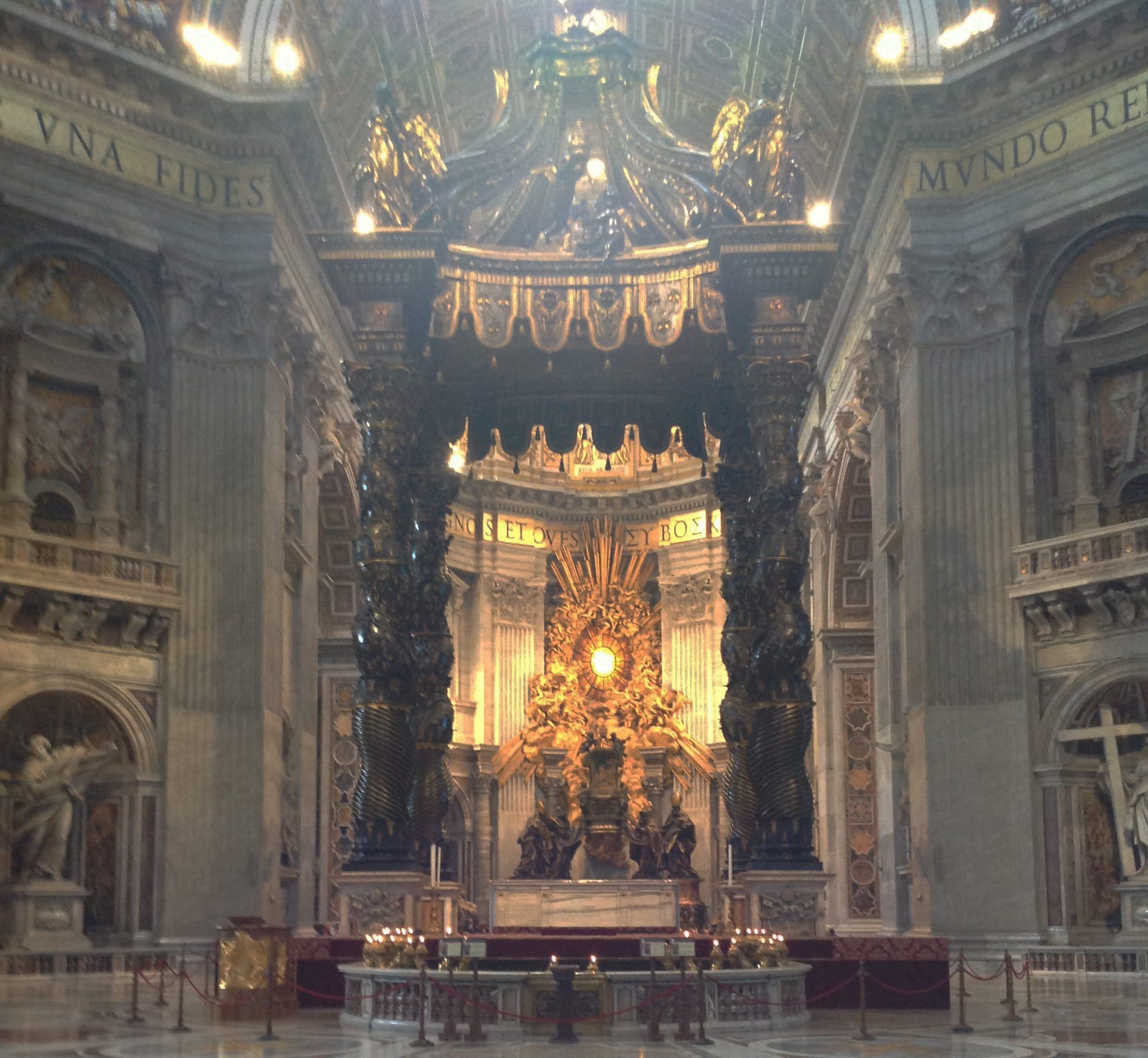 - Bernini’s baldacchino – the 98 ft tall bronze structure over the high altar which marks the place of St. Peter’s tomb beneath.