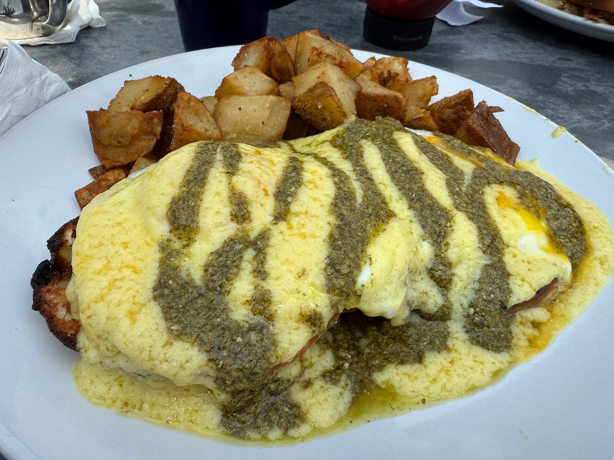 It was a lovely morning in August, so we decided to sit outside at the Blue Moon Restaurant. Since I am a huge fan of eggs benedict (and Dr. Seuss), when I saw Green Eggs and Ham on the menu I had to have it – with a side of great views of Lake Onalaska just across the road.