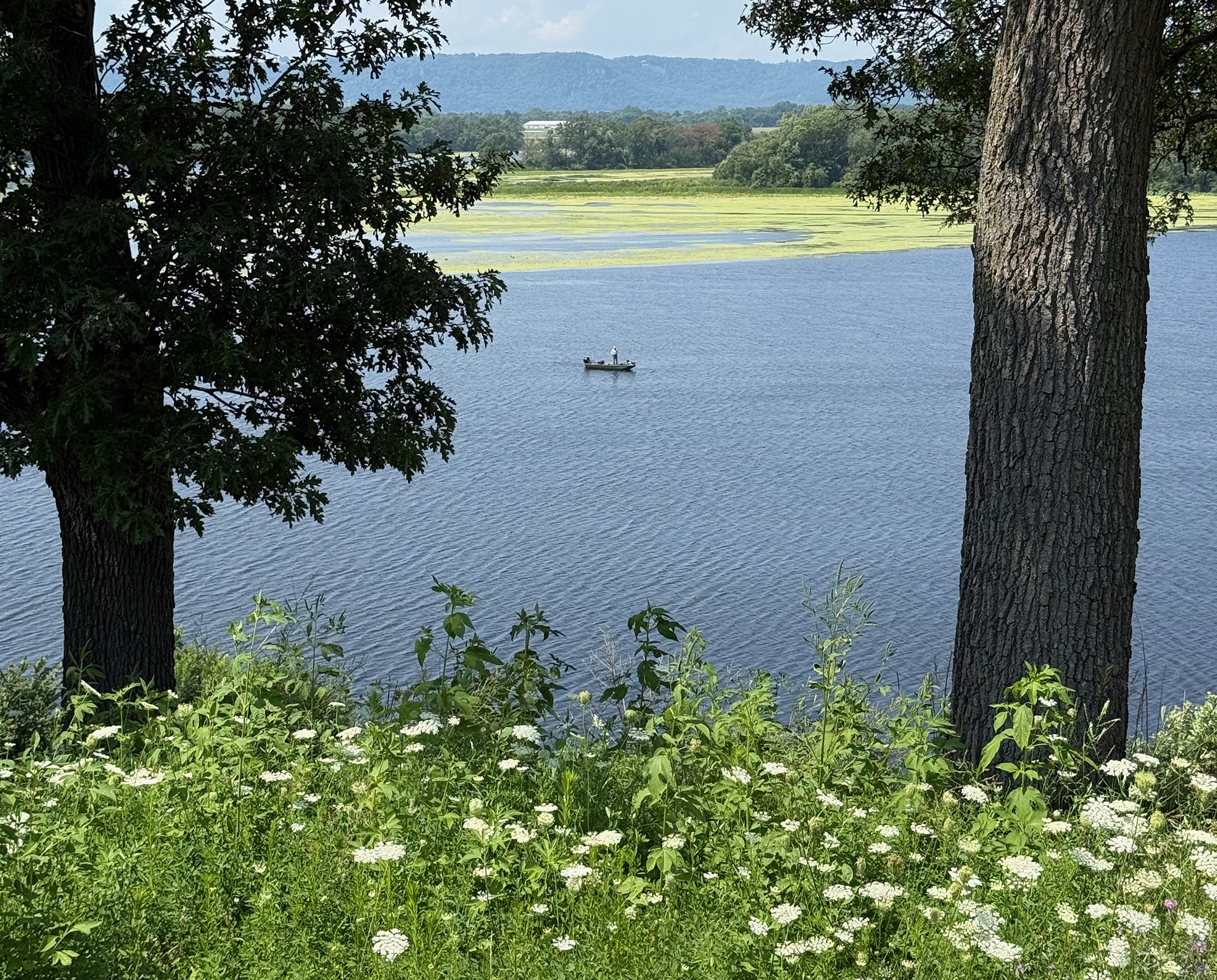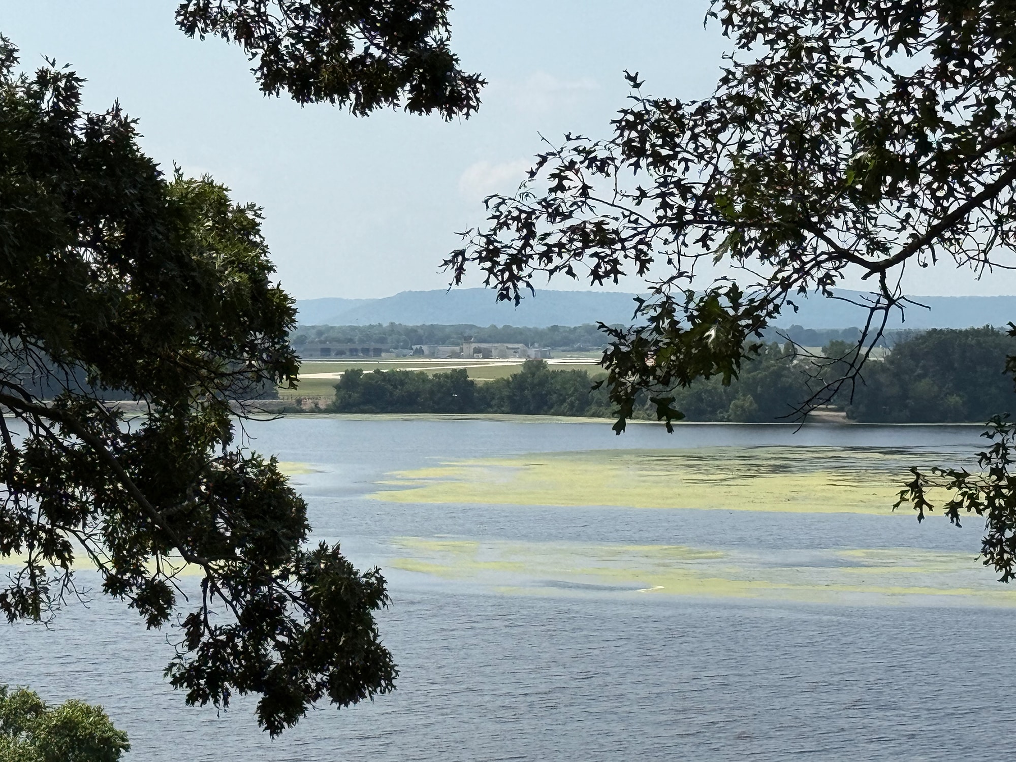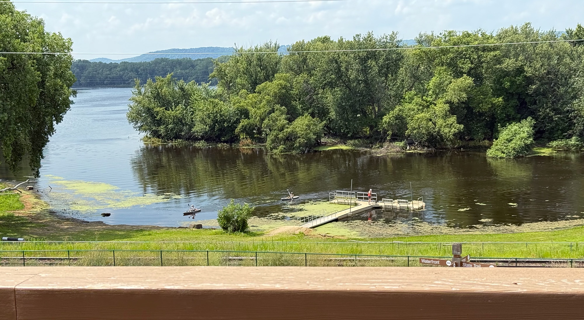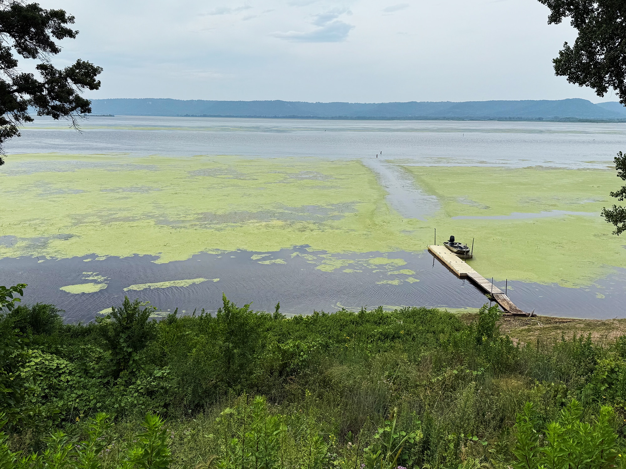 The next morning (after another stop at the Blue Moon), we worked our way north to our two-night stay in Trempealeau – with a few stops on the way. Part of the Upper Mississippi River National Wildlife and Fish Refuge, the Lake Onalaska Overlook seemed a little odd at first – located on a single lot in a row of houses along the waterway. But the presentation was beautiful with some ironwork for privacy (probably for the neighbors), and a nice panoramic view of the waters of Lake Onalaska. But what’s that green stuff?