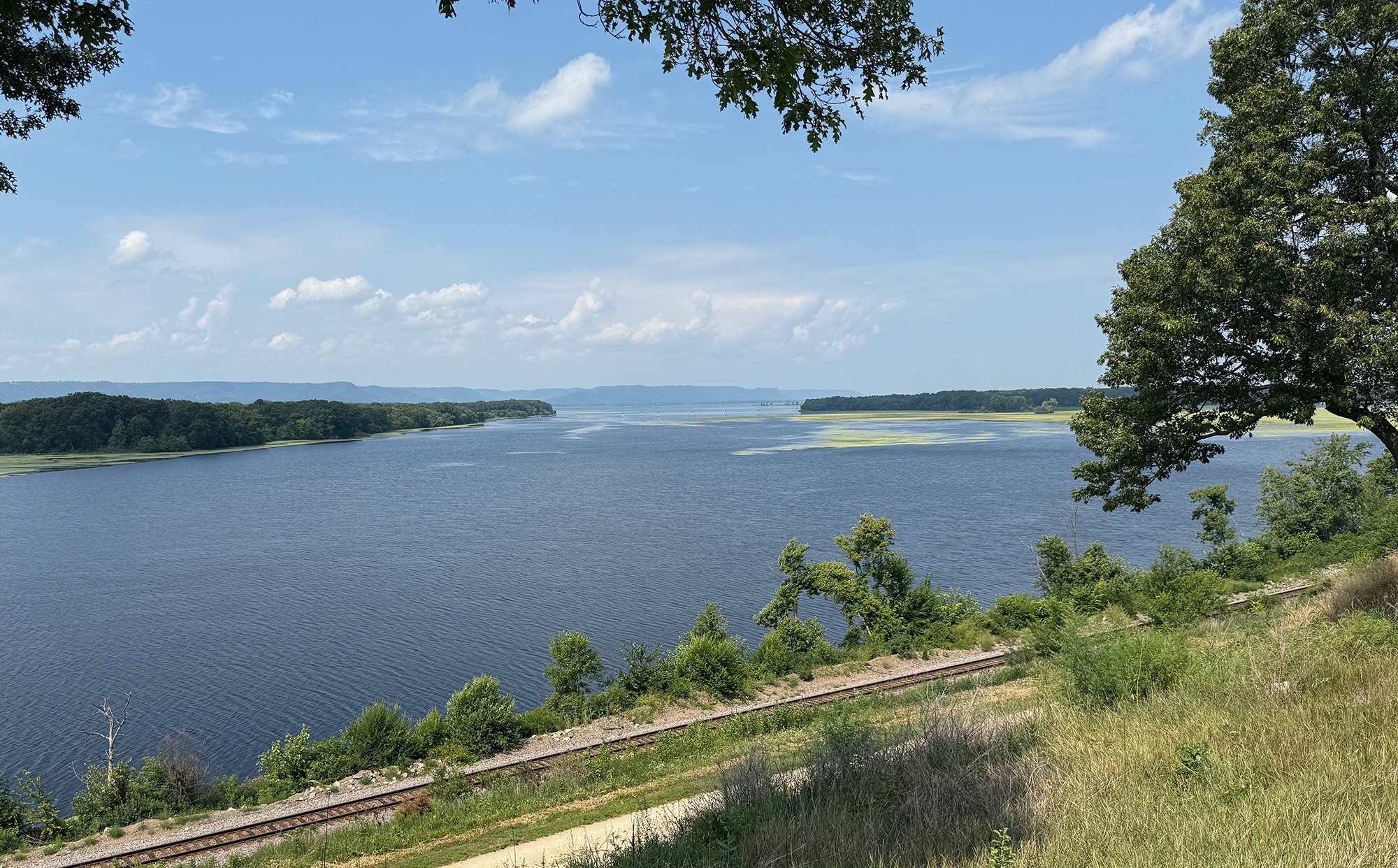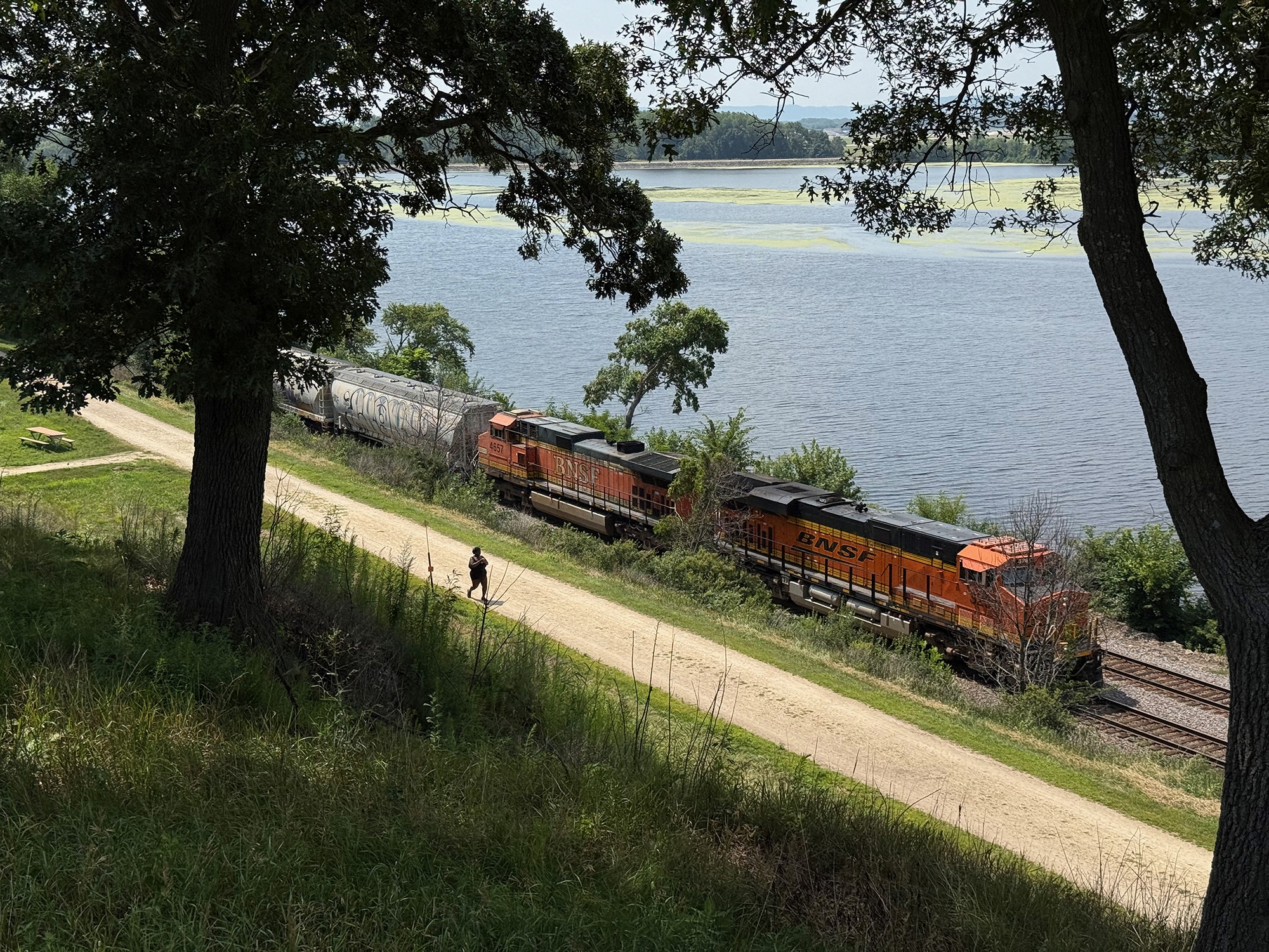 While we were gawking at the view, we could hear a train in the distance, and I was able to get a picture as it passed us by. Trains became regular occurrences on this trip, since the upper Mississippi is a key corridor for railroads – both passenger and large freight trains.