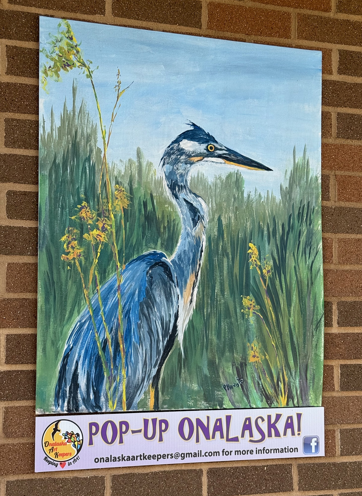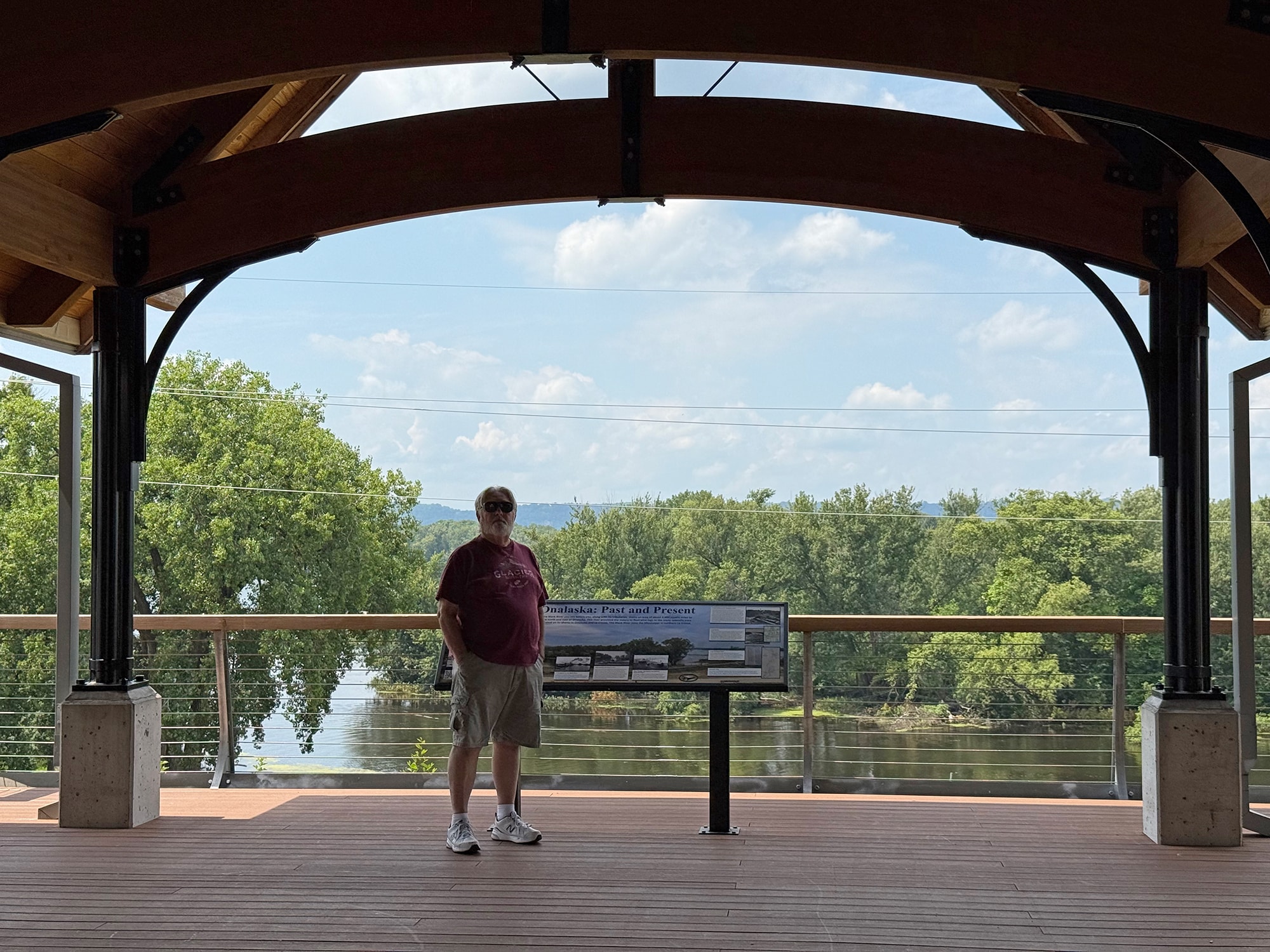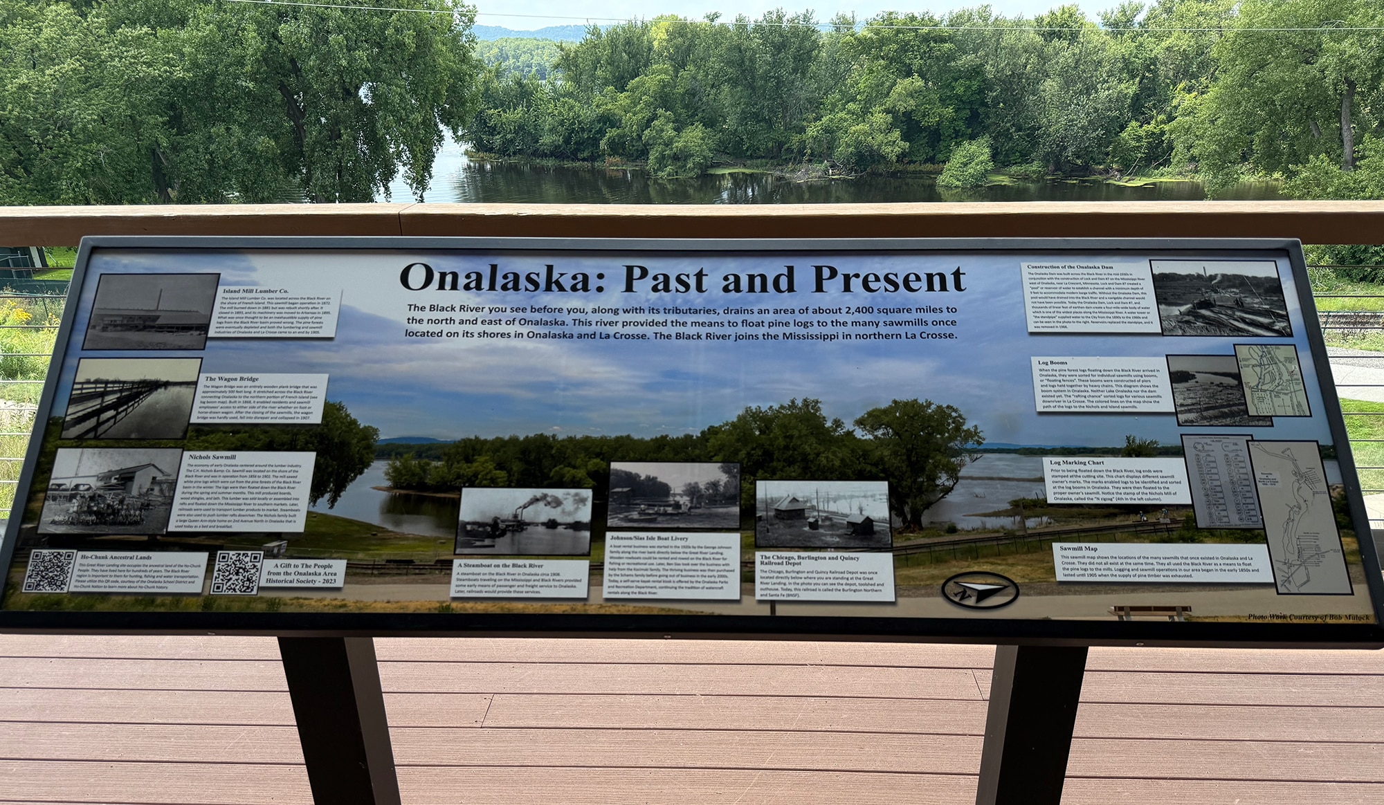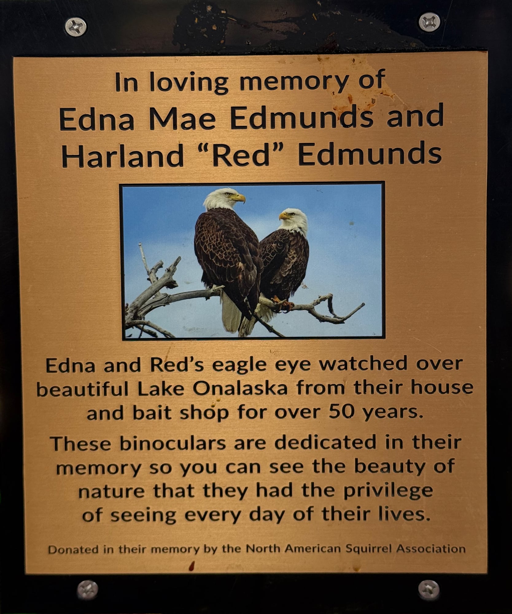 When Onalaska celebrates its annual Sunfish Days, Sunny is the guest of honor – mounted near a fantastic deck overlooking the Onalaska River. Views are amazing from this vantage point, especially with viewing binoculars that were donated by a couple who lived nearby for years (see photo below).