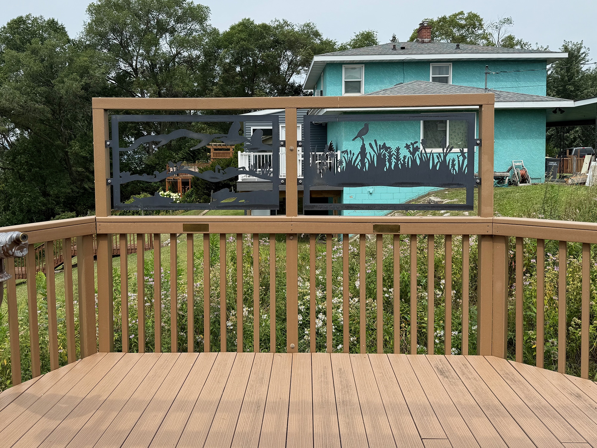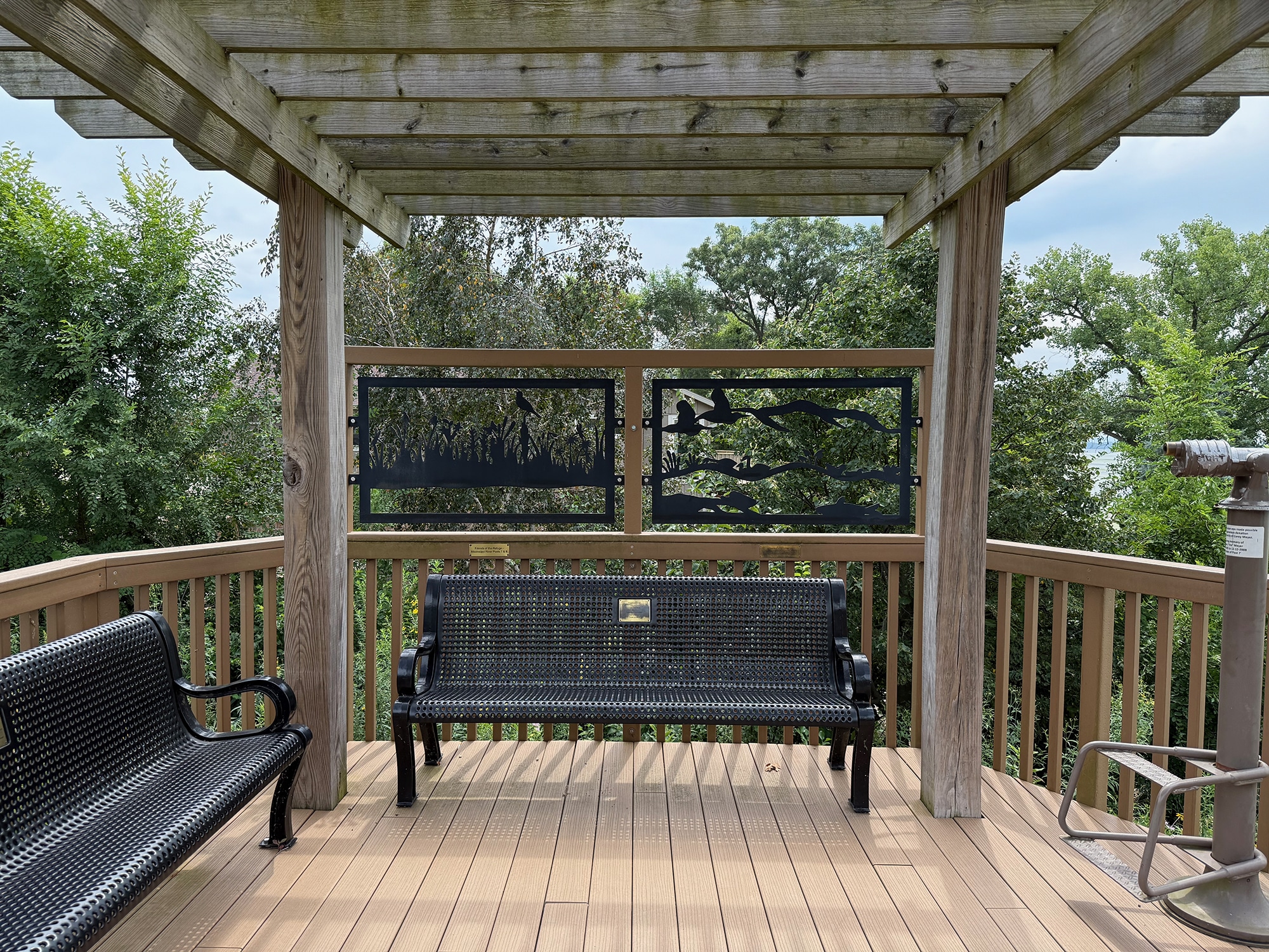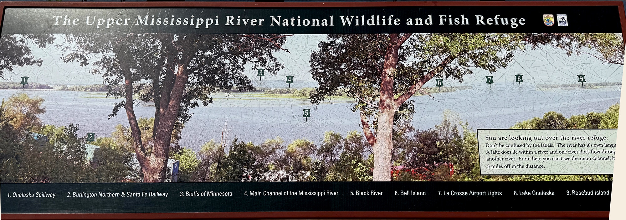 If you click on the photo just above, you can see a numbered list of nine natural landmarks that can be seen from this beautiful red deck. 1) Onalaska Spillway; 2) Burlington Northern & Santa Fe Railway; 3) Bluffs of Minnesota; 4) Main Channel of the Mississippi River; 5) Black River; 6) Bell Island; 7) La Crosse Airport Lights; 8) Lake Onalaska and 9) Rosebud Island.