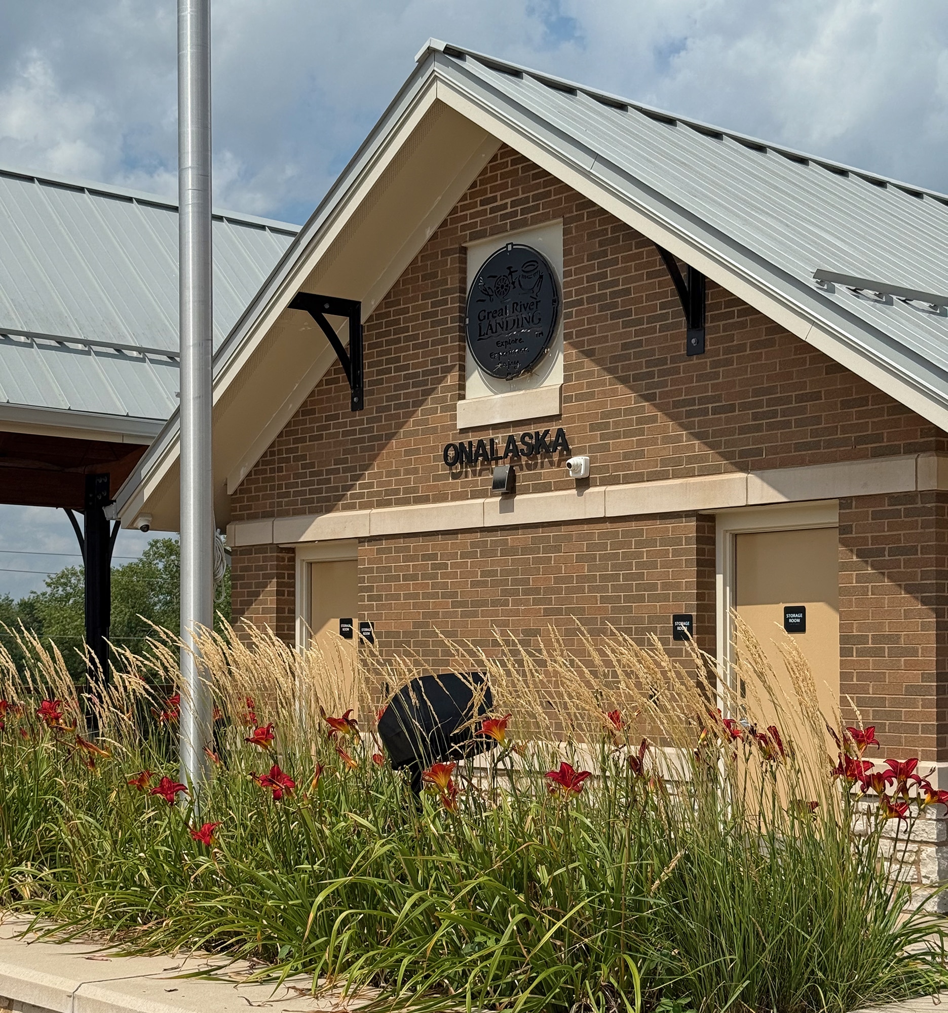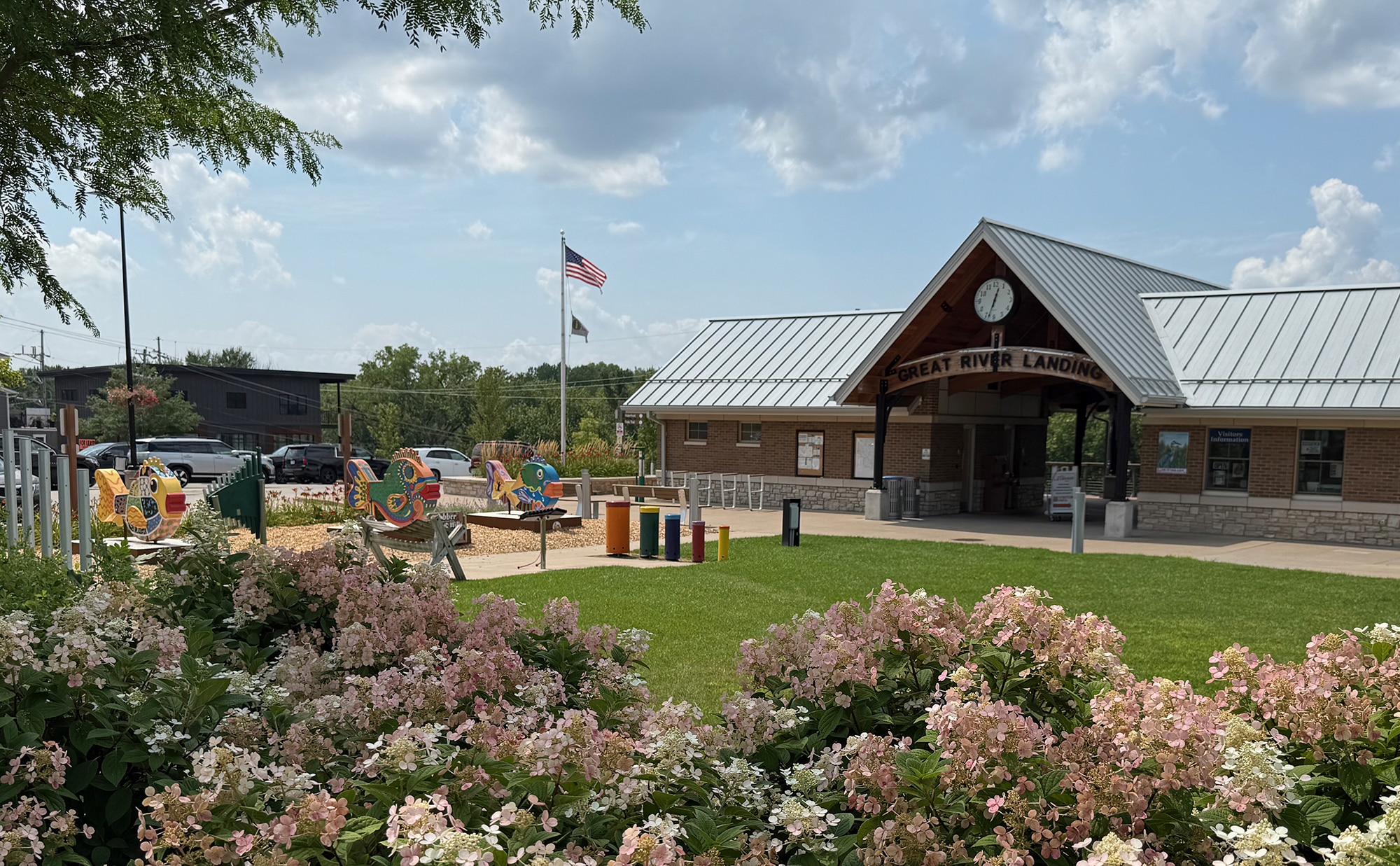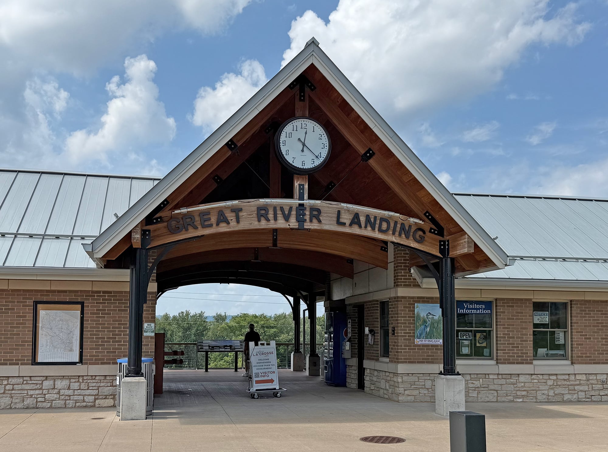 “The Great River Landing in Onalaska, WI plays host to the trailhead of the Great River State Trail with showers and locker rooms for bicyclists enjoying the 101 miles of interconnecting state trails. A new visitor center allows for beautiful views of Lake Onalaska and the Black River. Great shore fishing near the Onalaska Spillway, and a waterfront that plays host each year to the Three Rivers Roleo log rolling championship.”