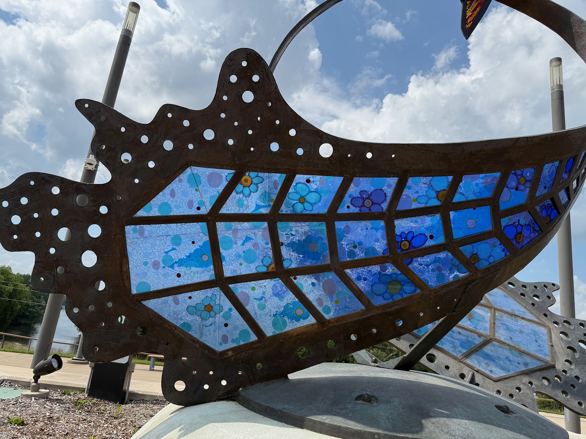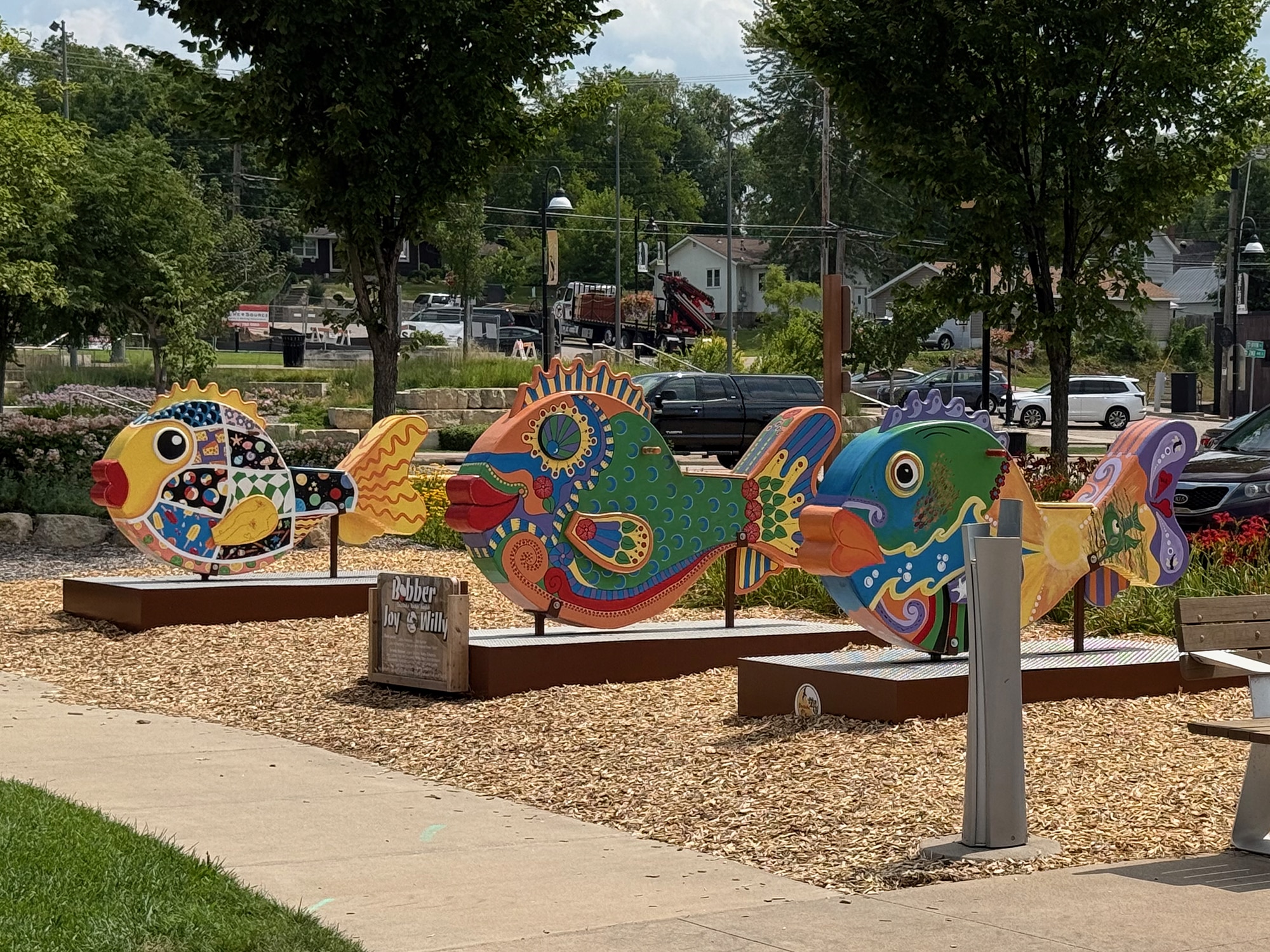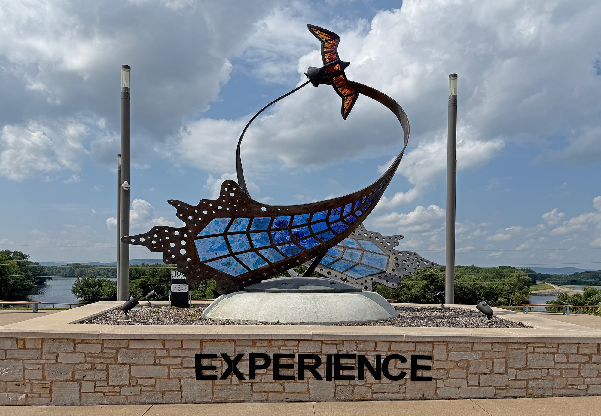 A quick walk around the Visitor Center offered more cool stuff – including Bobber, Joy, and Willy – Onalaska’s Rockin Sunfish in a children’s playground. And of course, beautiful flowers and a lovely stained glass art installation. We really enjoyed this stop, and if you’re into biking, this is a great stopping point while enjoying 101 miles of interconnecting state trails.