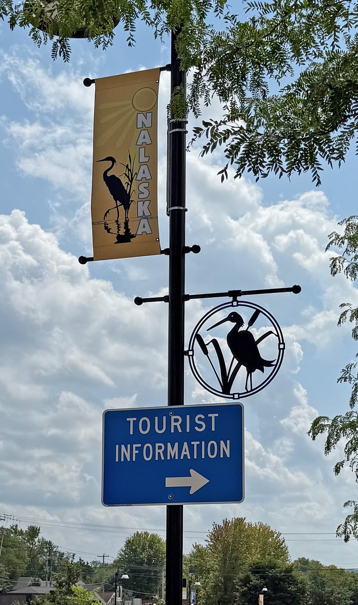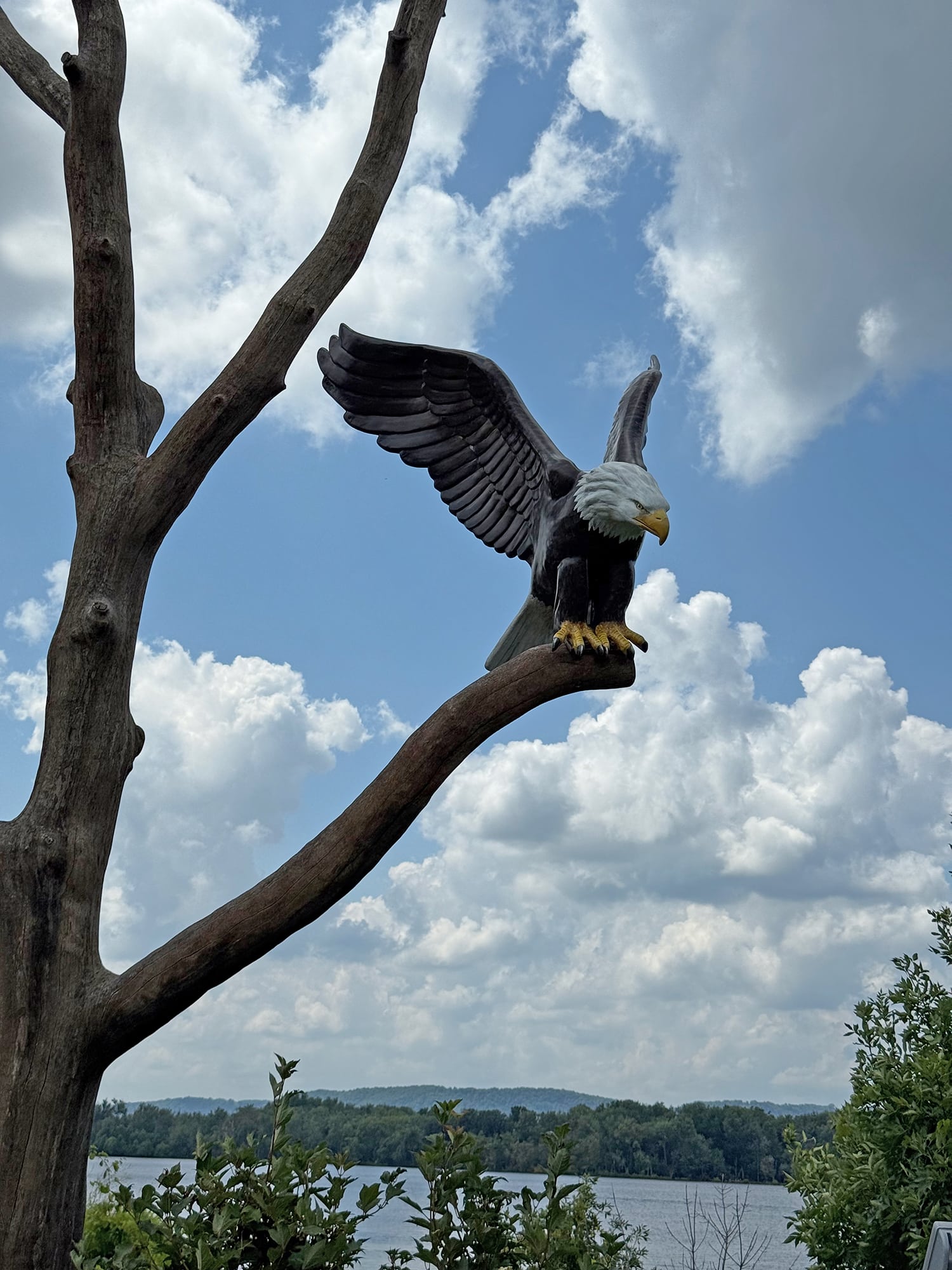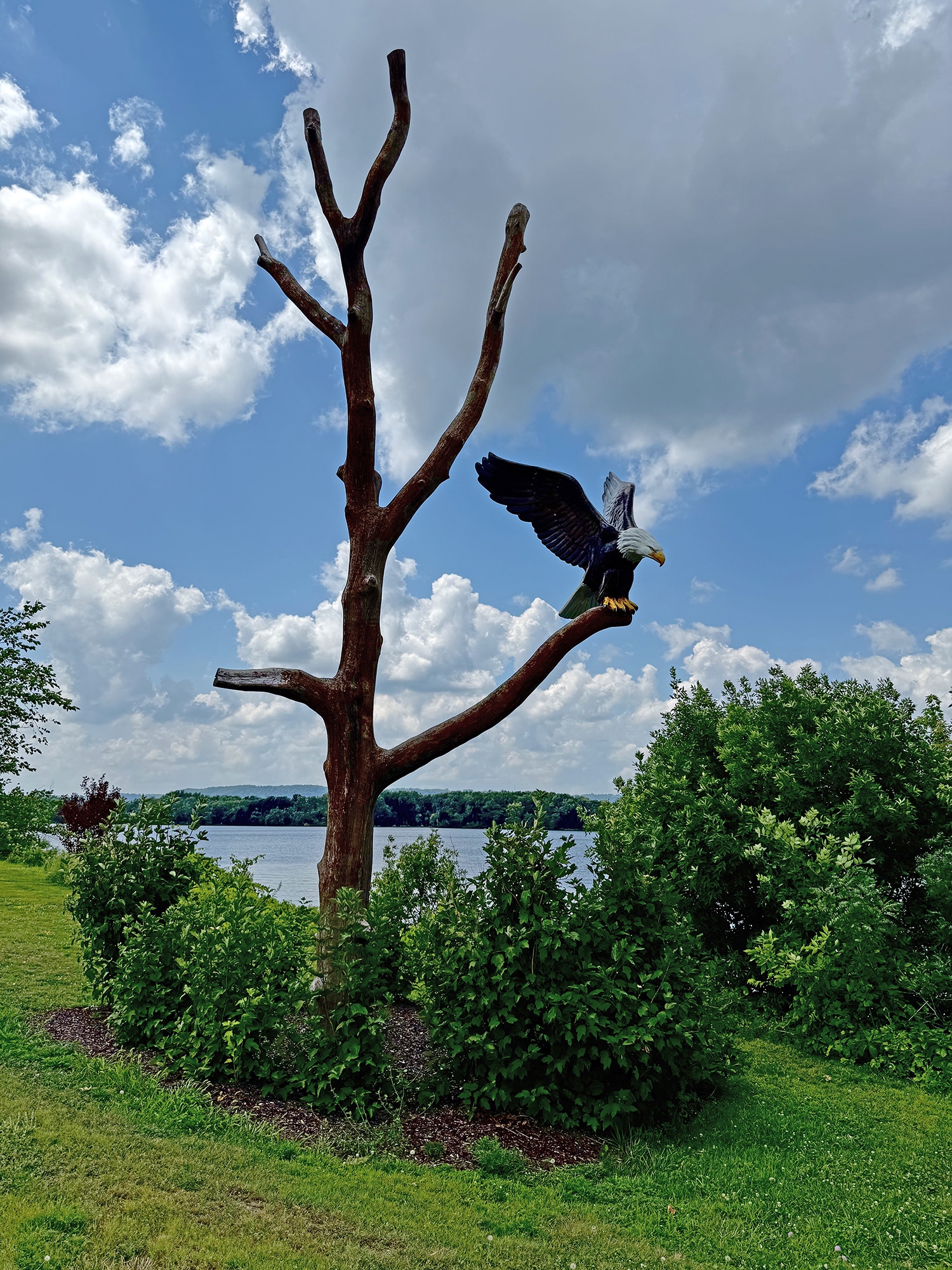 One post on Reddit says that March is the best month to see eagles here, especially after a long freeze when the river is opening up. With plenty of great fishing spots, it’s possible to see from twenty to a hundred eagles on a visit during this “peak” time. For folks like us – who visit in August – a sculpture would have to suffice.