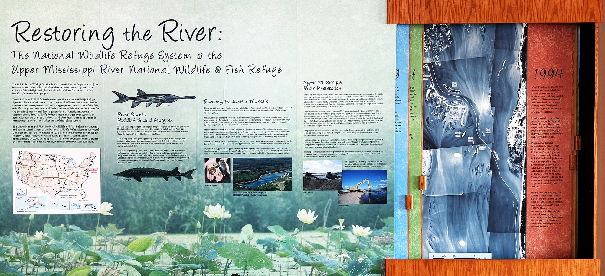 The Mississippi River provides safe resting, feeding, breeding, and nesting areas in the form of open water pools, backwater tributaries, prairies, and forests.” ~ from the map illustration below