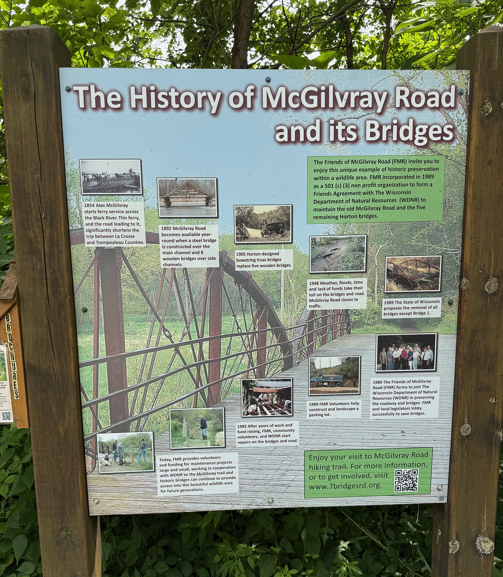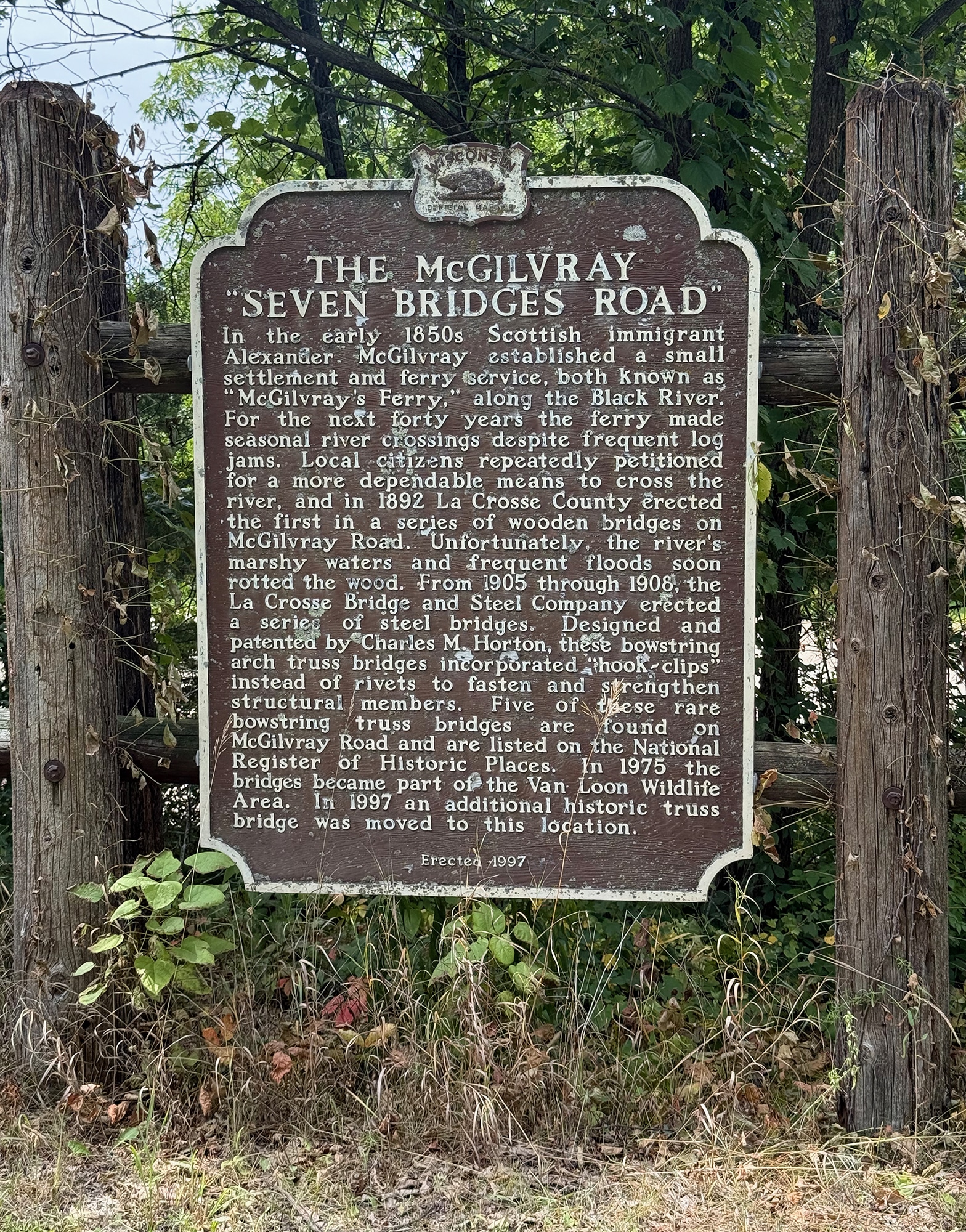 “McGilvray Road is located in Northwest La Crosse County, Wisconsin, in the Van Loon Wildlife Area. Located on a former vehicular road is a unique combination of five rare bowstring arch truss bridges and one low truss bridge. They represent two styles of bridge construction popular in the nineteenth and early twentieth centuries which are quickly being replaced due to deterioration or inability to meet today’s greater traffic requirements. Currently the McGilvray Road and its bridges are open only to pedestrian traffic.