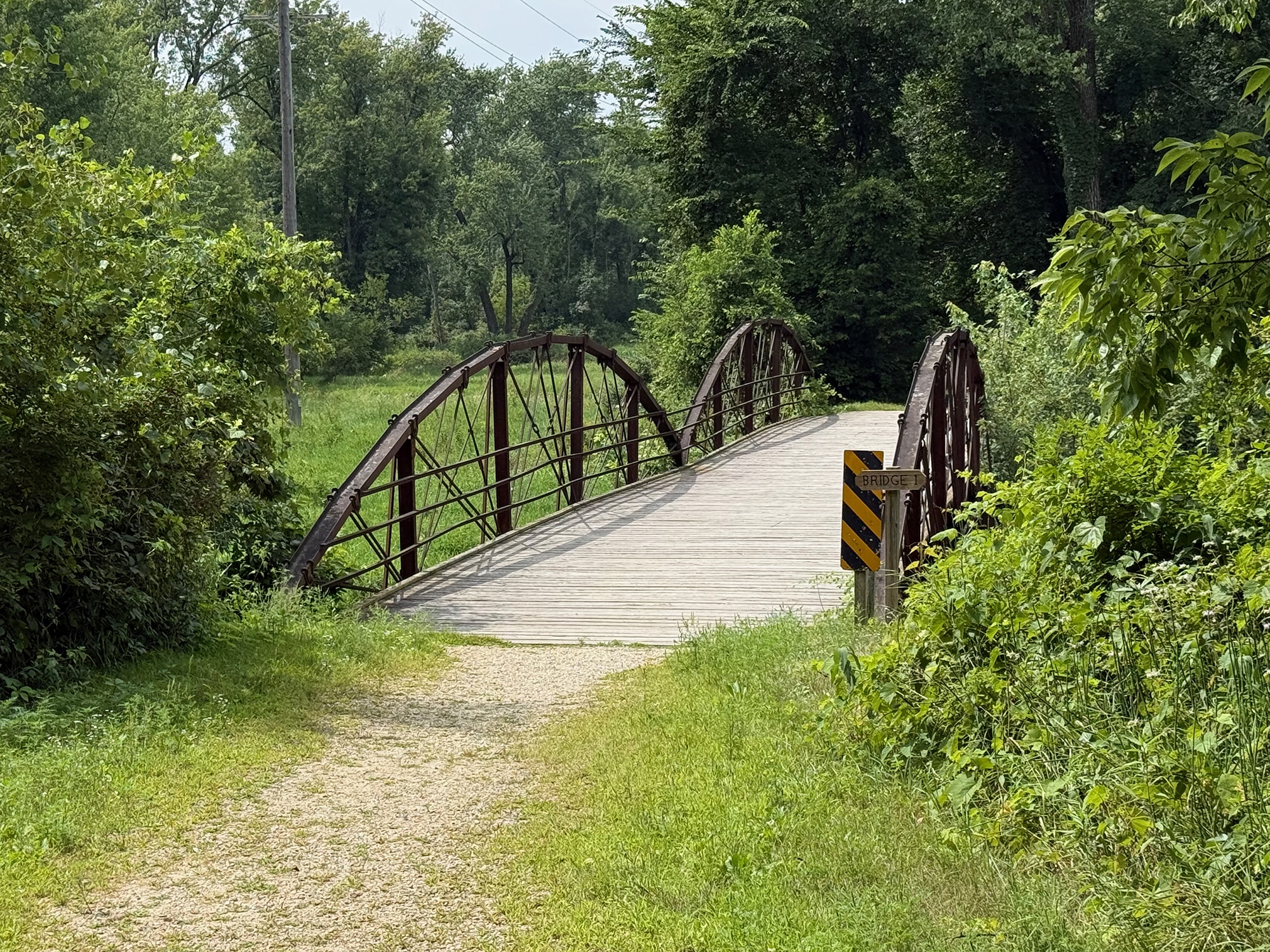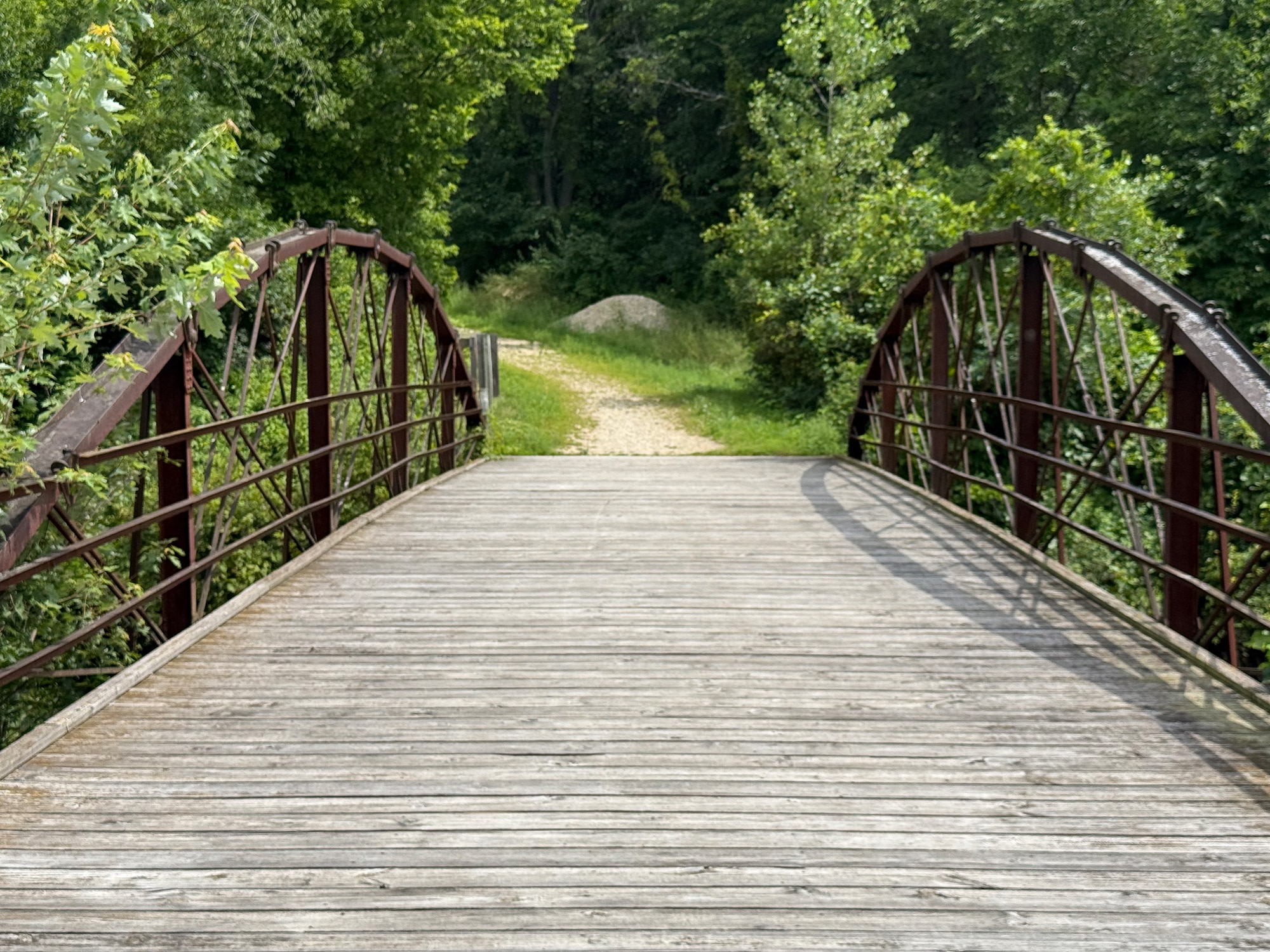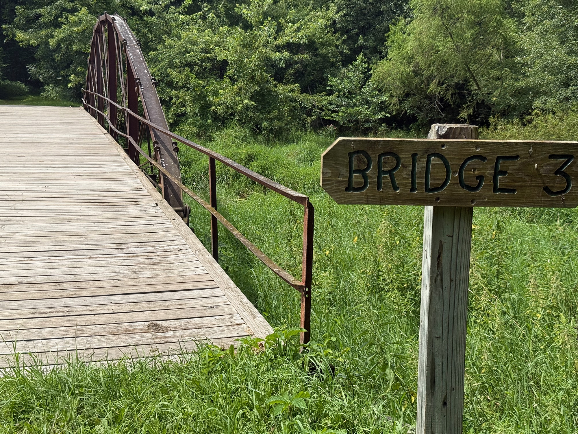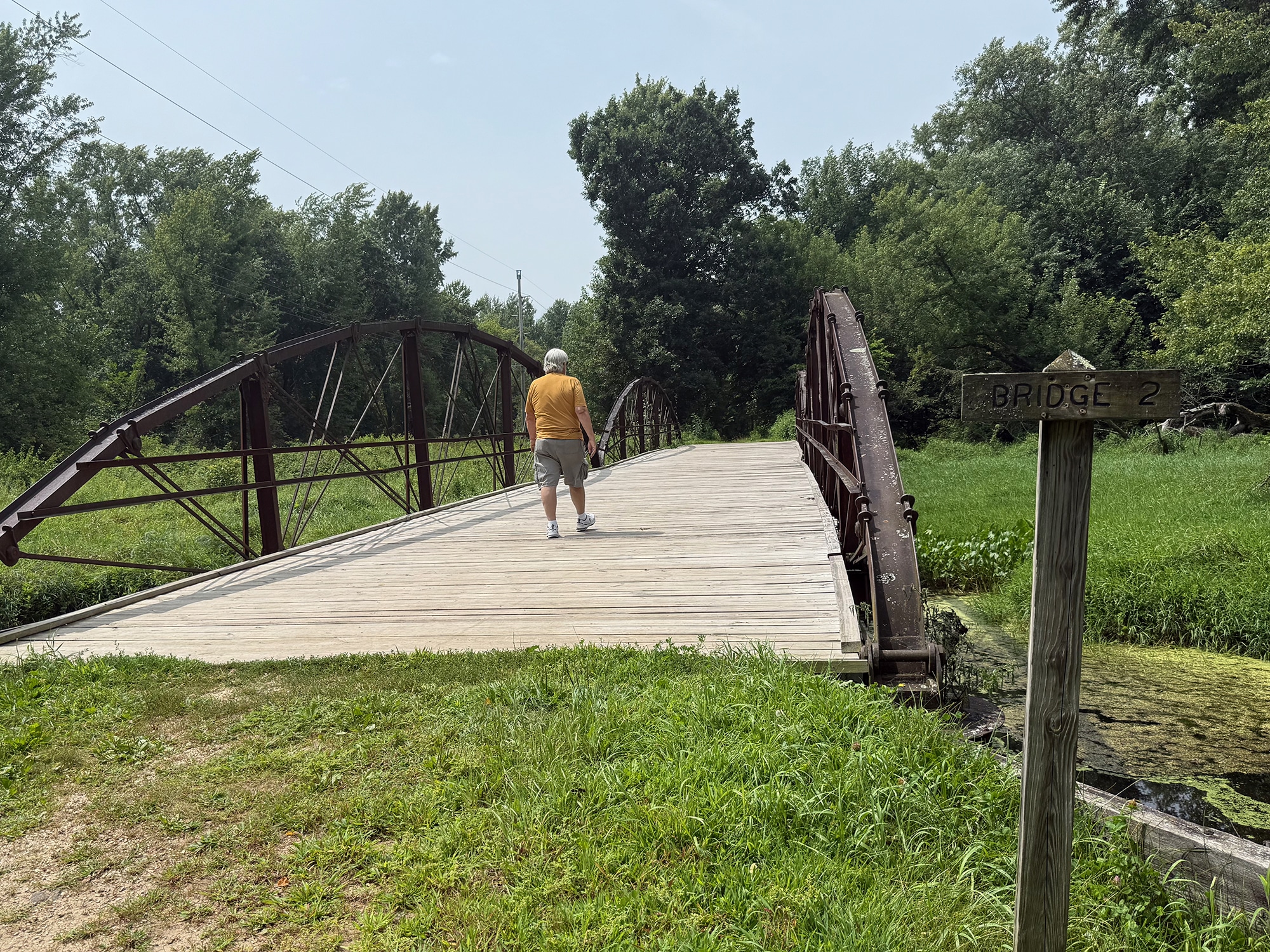 Jim decided he’d walk a few and maybe sit down and read his book while I finished the rest. And most walks in the woods are shaded, which would feel pretty good on one of the hottest days of the trip so far. So we started our journey and came up to Bridge 1. Although there wasn’t much water under the bridge, it was pretty cool.