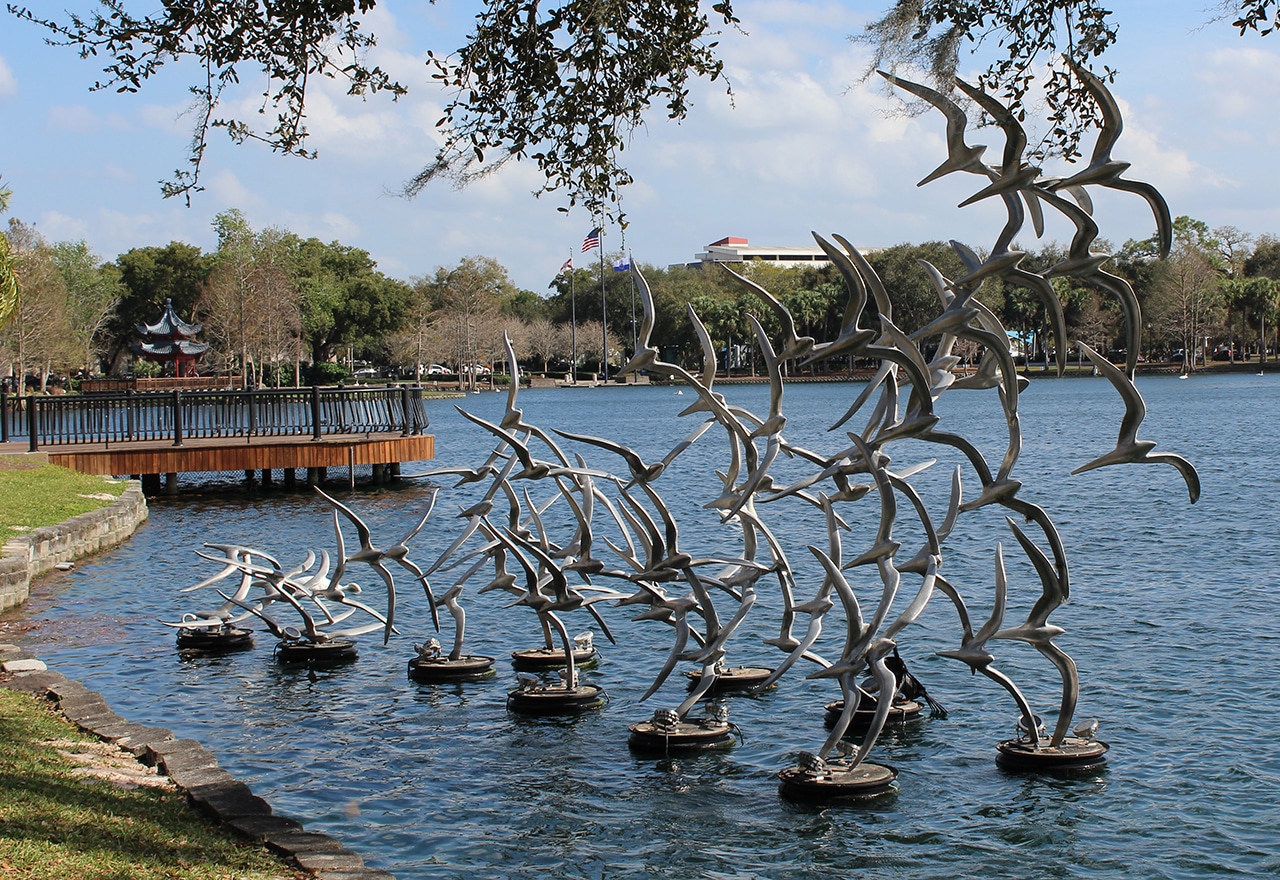 Take Flight by Douwe Blumberg depicts a flock of birds during take-off. “Capturing a fleeting moment of beauty and defying gravity, Take Flight embodies a spirit of freedom and transcendent joy.” – from See Art Orlando