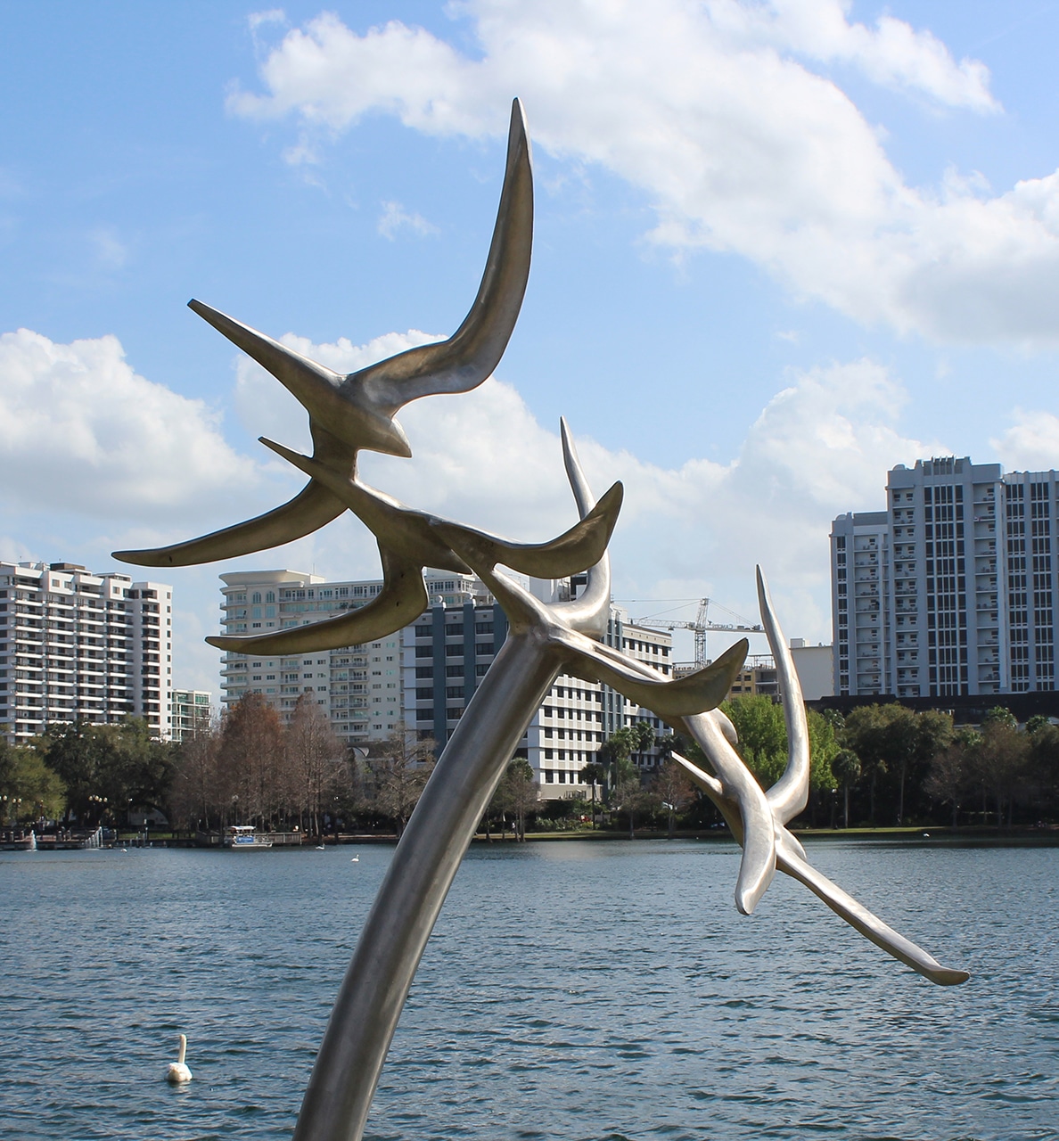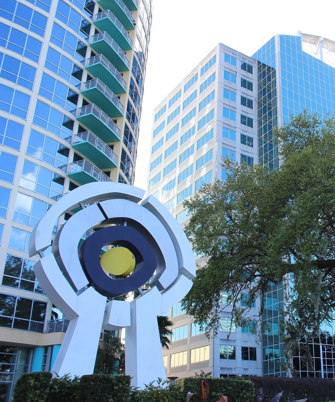 “The fabulous Centered (by C.J. Reach) is a bold monumental sculpture made of eight individual forms arching in perfect balance with a kinetic yellow center able to spin in the wind. Centered makes reference to how Orlando is the center of family fun, experiences and memories. The yellow form in the center also pays tribute to Orlando’s clear and sunny weather.” – from See Art Orlando