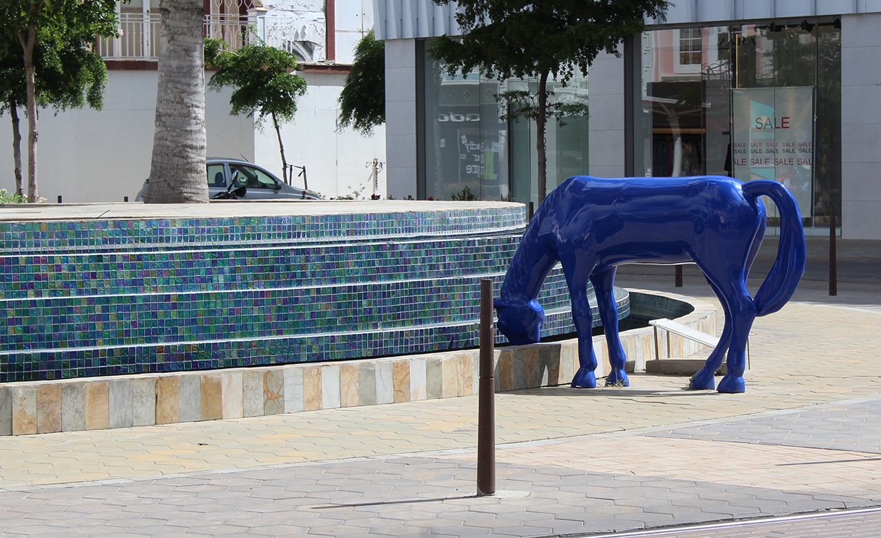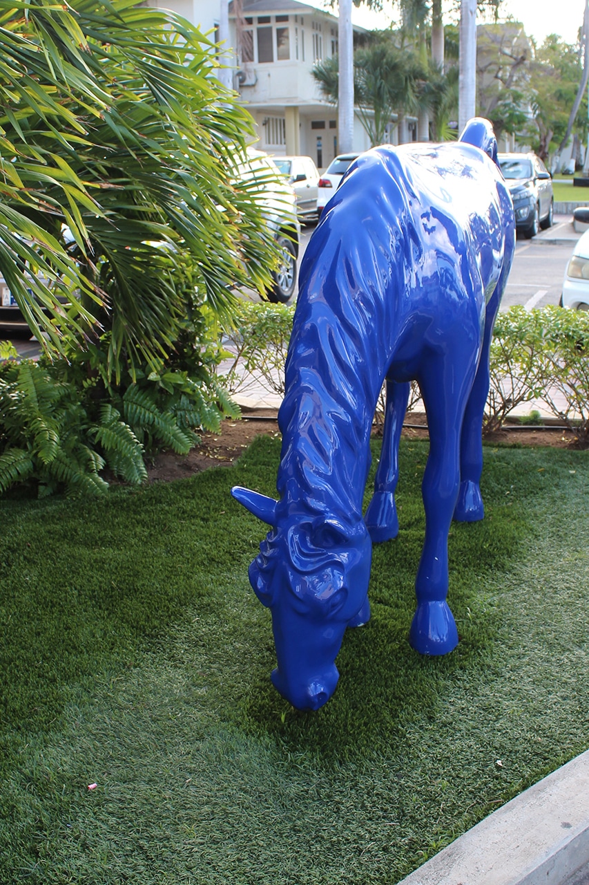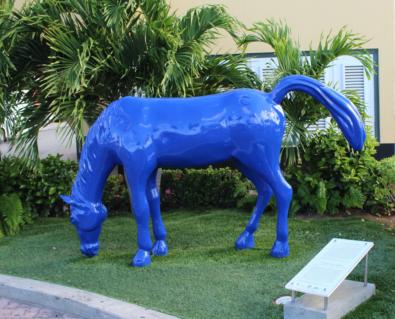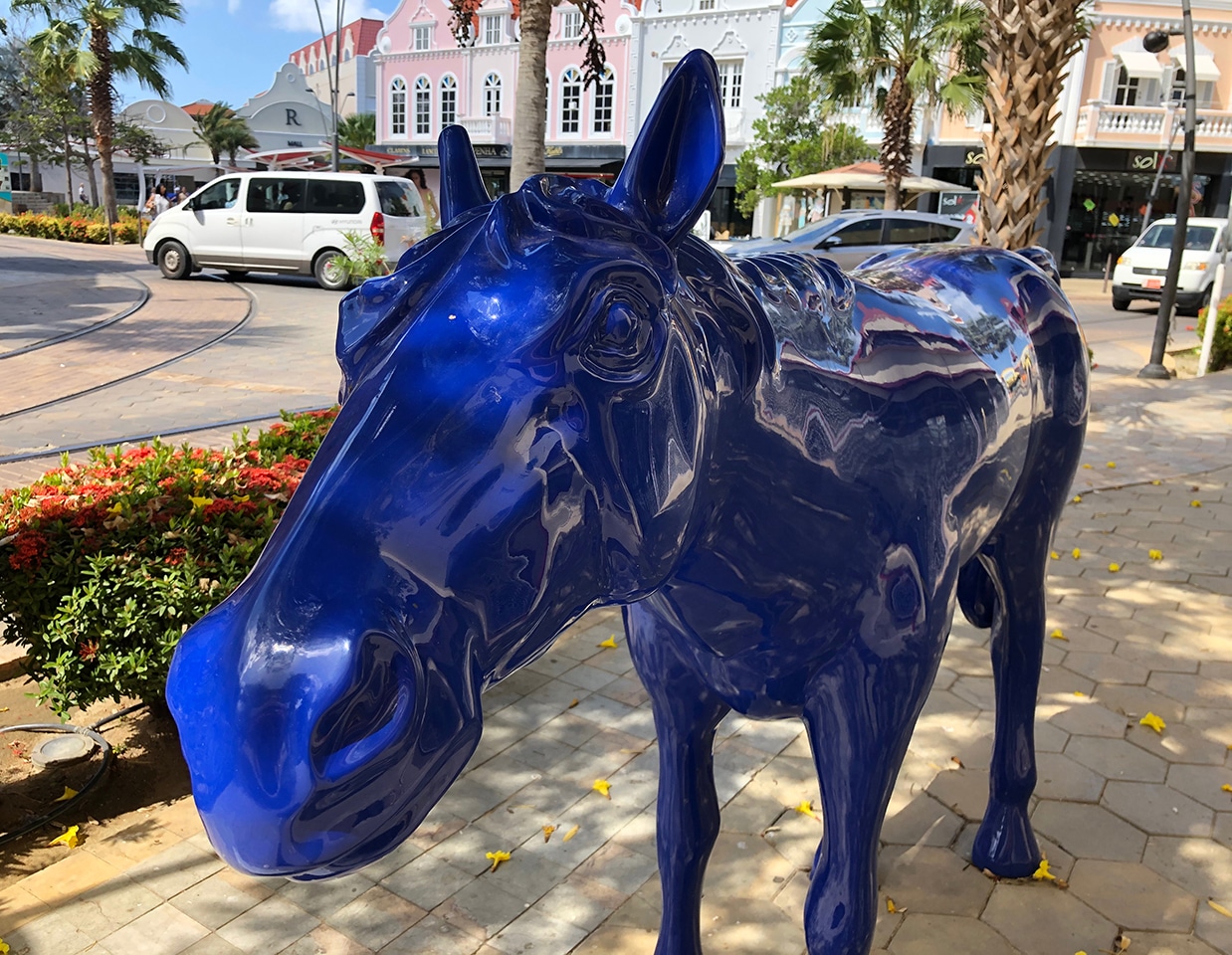 Speaking of blue horses – I have photos of seven of the eight blue horse sculptures around town. Oranjestad was originally named Paarden Baai (Horses Bay) in the 17th century when selling horses to Europeans was a major source of income. In 2015, this Blue Horse exhibit was created and represents an important historical moment where the horses jumped from the ship deck into the Caribbean Sea and swam to the Aruban Bay. Each horse represents a different strength and are shiny and blue as if they are still wet from the waters of the Caribbean.