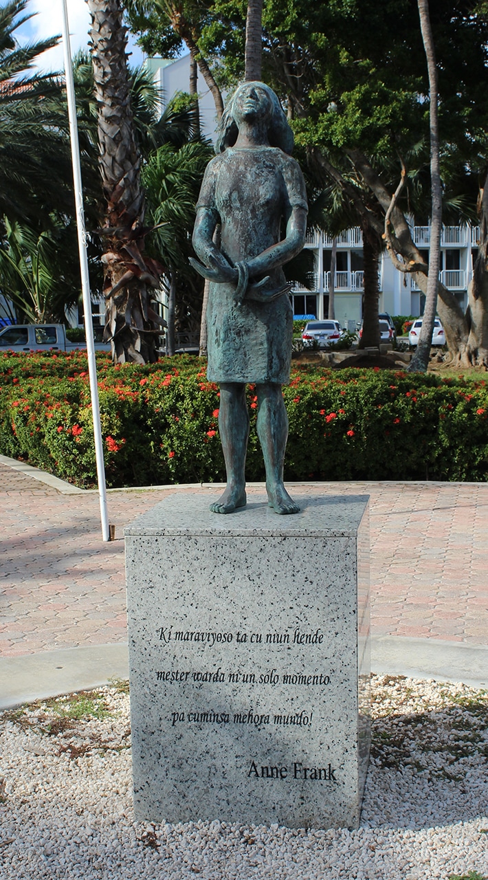 Just a few feet from Wilhelmina is a statue of Anne Frank. The statue shows Anne looking up at the sky with her wrists bound. Dedicated in 2011, it symbolizes tolerance of all religions, colors and creeds. On one of the four sides of its square base are her words in English: How wonderful it is that nobody need wait a single moment to improve the world!