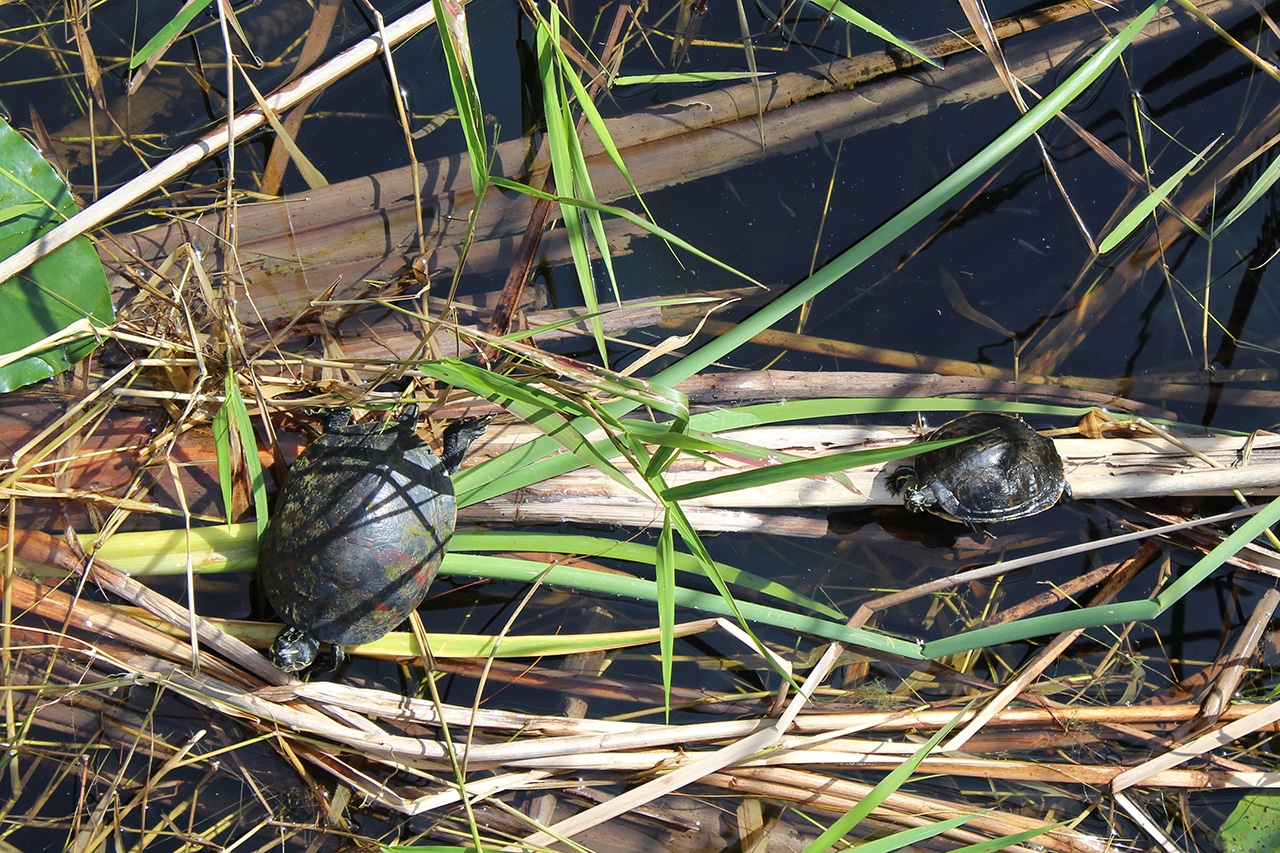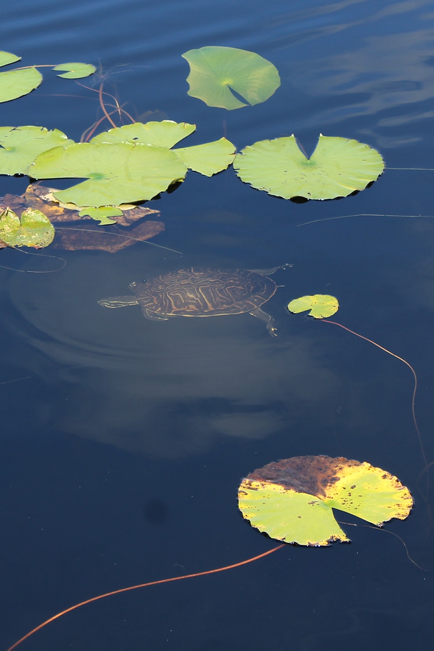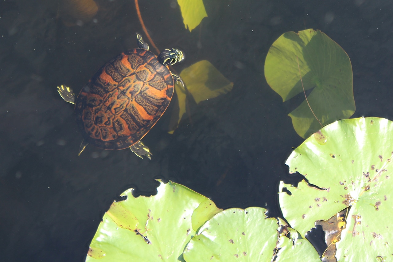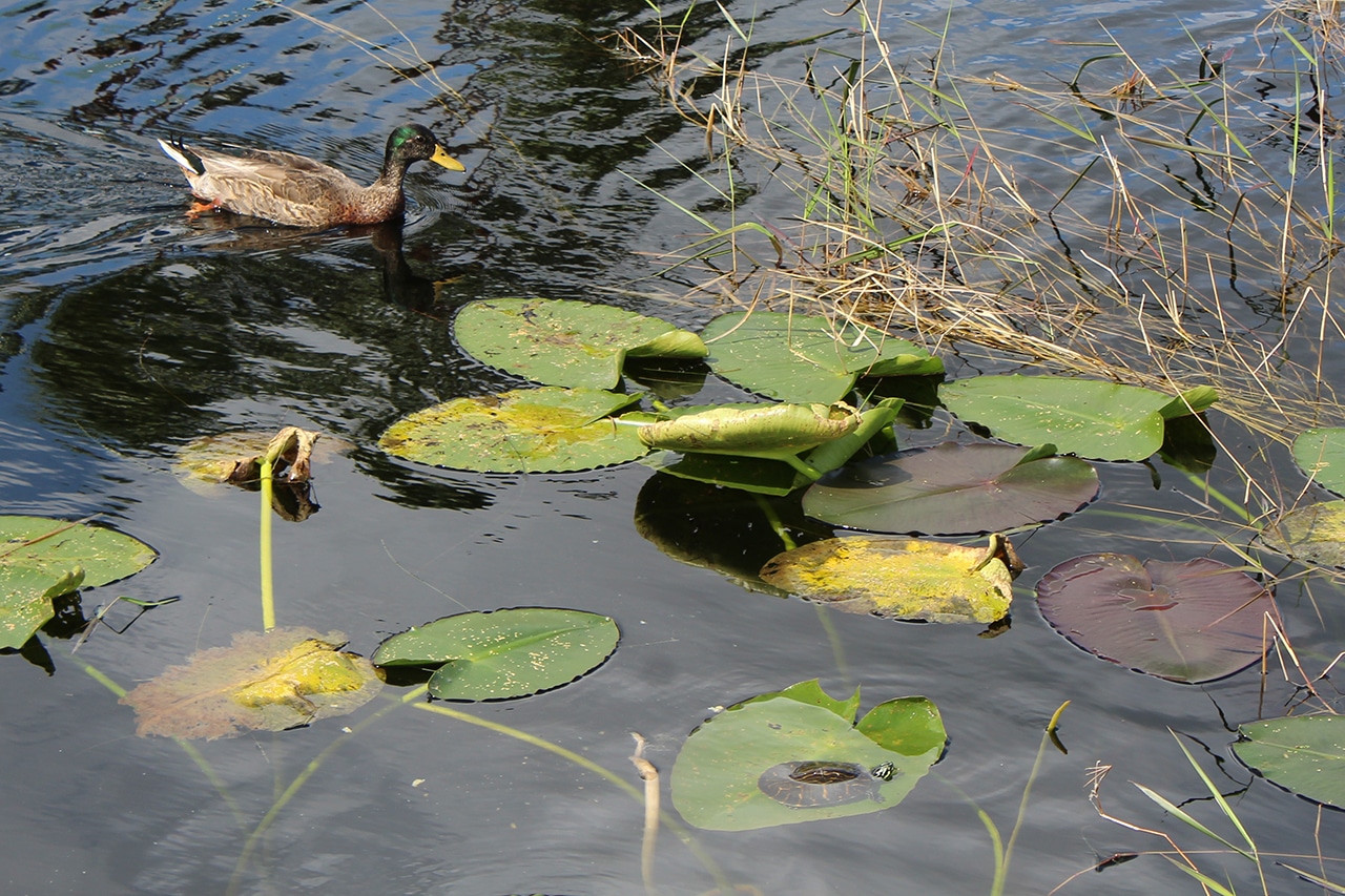 According to a sign, “Lake Eve is an Environmentally Protected Lake. All fish caught must be returned to the lake. PLEASE HELP US SAVE THE WILDLIFE.” Ducks and fish were abundant in the lake, and lily pads provide a splash of color as well as lunch and a place to rest for turtles.