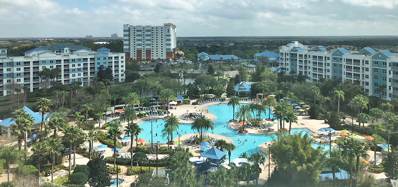 Once we checked into the Fountains, we could feel ourselves relax. In the past, we’ve stayed in a presidential or two-bedroom units in one of the buildings that encircle the big pool. This time ours is the tall building just left of center in the photo below.