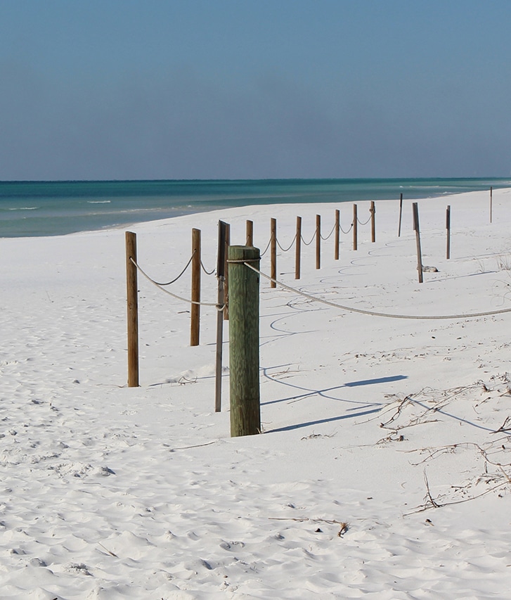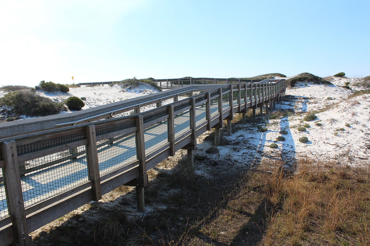 Our first day trip took us along the gulf coast toward Destin on Hwy 98, with a stop at Grayton Beach State Park. With the temp a chilly 43°, we walked along the beach in our winter coats and gloves. We had them stowed in the car with hopes of not seeing them again for at least another ten weeks – but looking on the bright side – the sun was shining brightly and we were on the Emerald Coast in Florida for heaven’s sake. We sucked it up, moved on, and let a beautiful boardwalk guide us down to the beach.