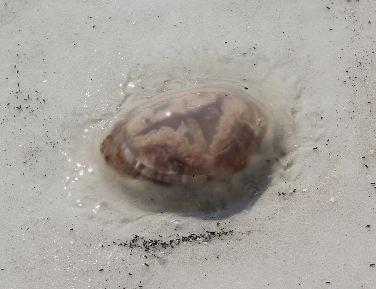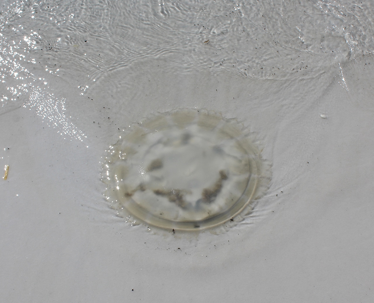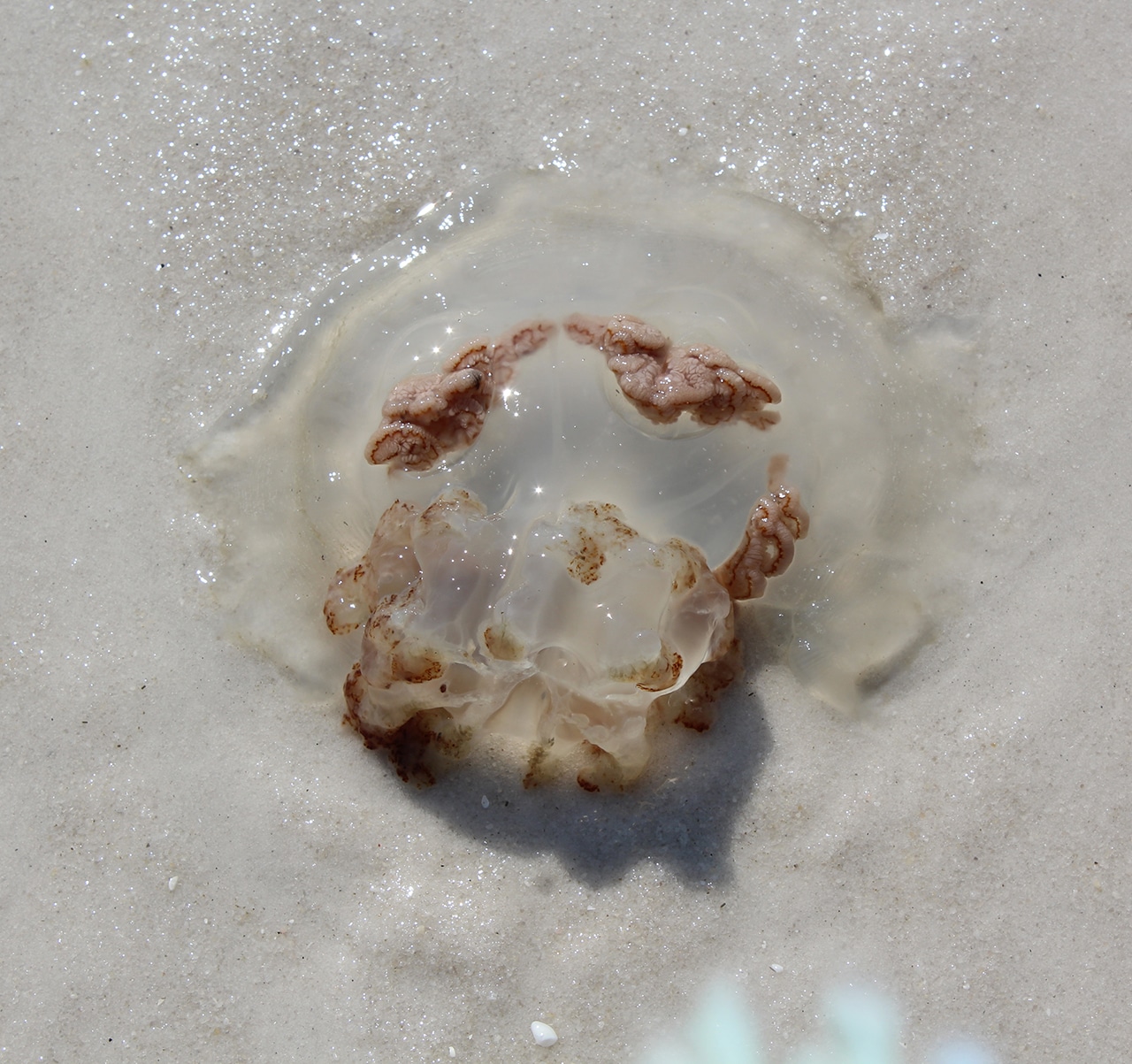 We came upon three jellyfish that had washed ashore, which was quite an adventure. When I posted these photos on Facebook, I got all kinds of replies from gross to beautiful to alien-like. Whatever you see in these washed-up creatures, you have to marvel at the complexity of nature. I was amazed and took a lot of pictures to get good ones, since the waves kept washing them up and back.