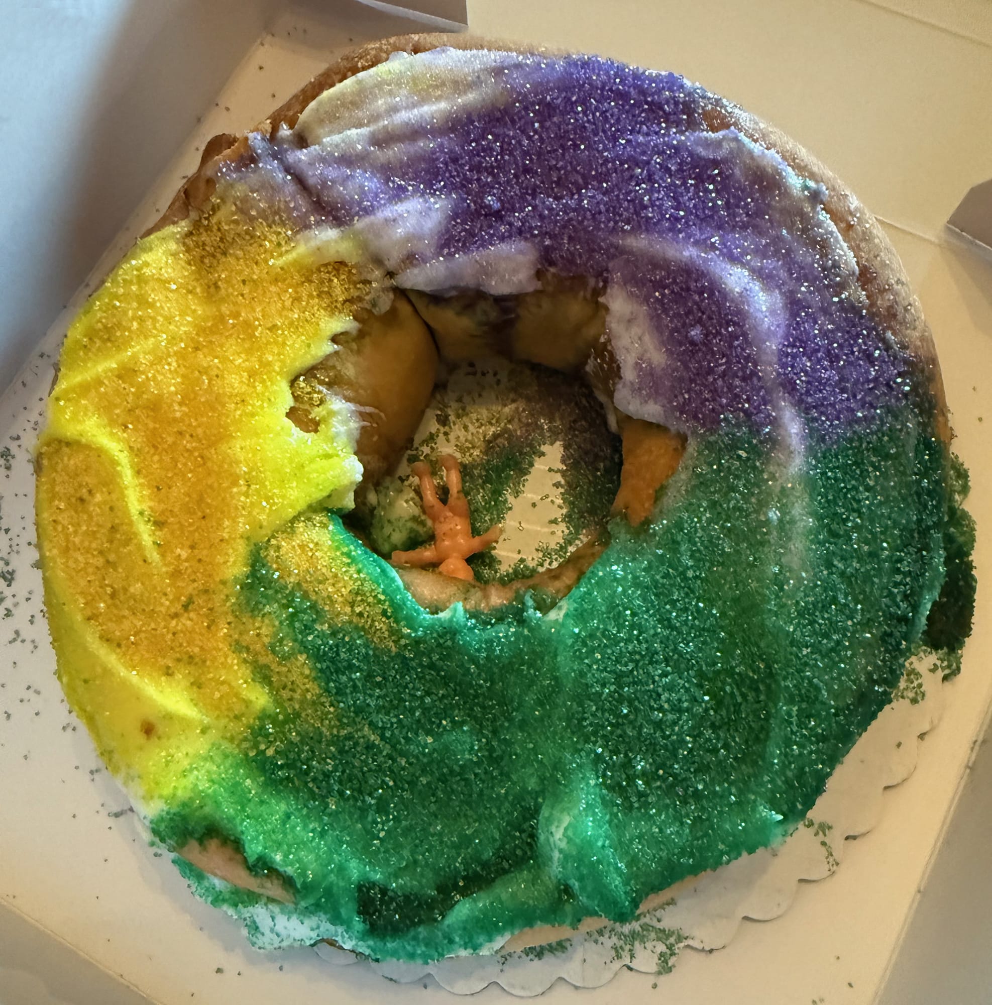 With our first-ever upgrade to a two-bedroom, my cousin decided to stay with us for a couple of nights. She arrived early afternoon and – like last time – brought a King Cake! Although this was a praline instead of the Kringle-like one we had last time, it was still slathered with frosting and sprinkled with sugar the colors of Mardi Gras! If you want to read a little more about the King Cake tradition (and about the baby they bake inside), visit this link.