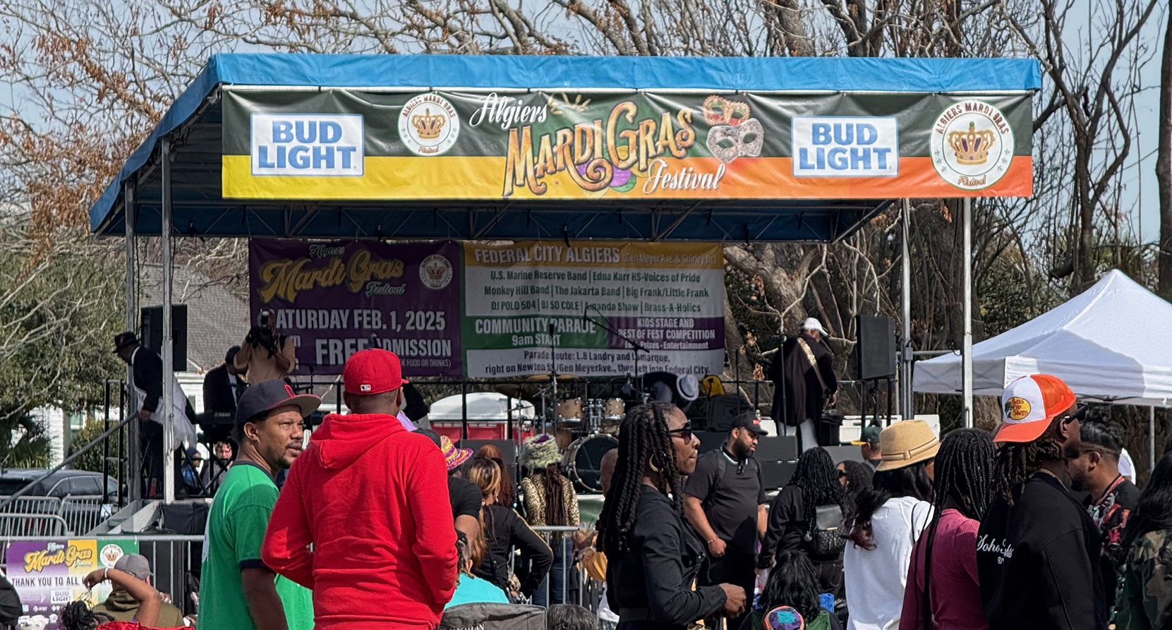 Algiers is a historic neighborhood of New Orleans and is the only Orleans Parish located on the West Bank of the Mississippi River. Last time we were here, we took the ferry across the Mississippi to Algiers Point. Today we took our car, since it would have been quite a walk to the location of the Algiers Mardi Gras Festival at the festival grounds in Federal City.