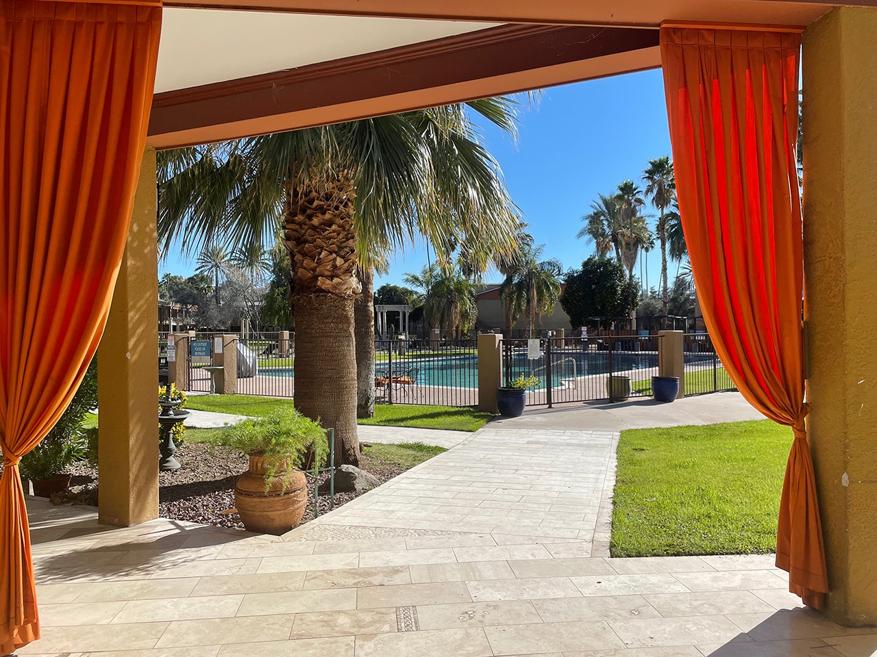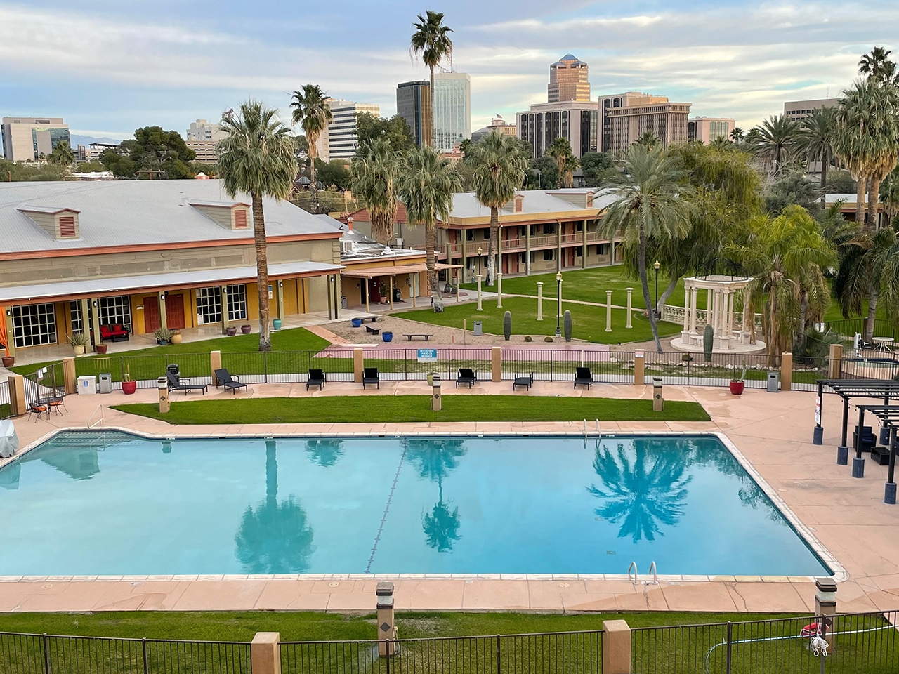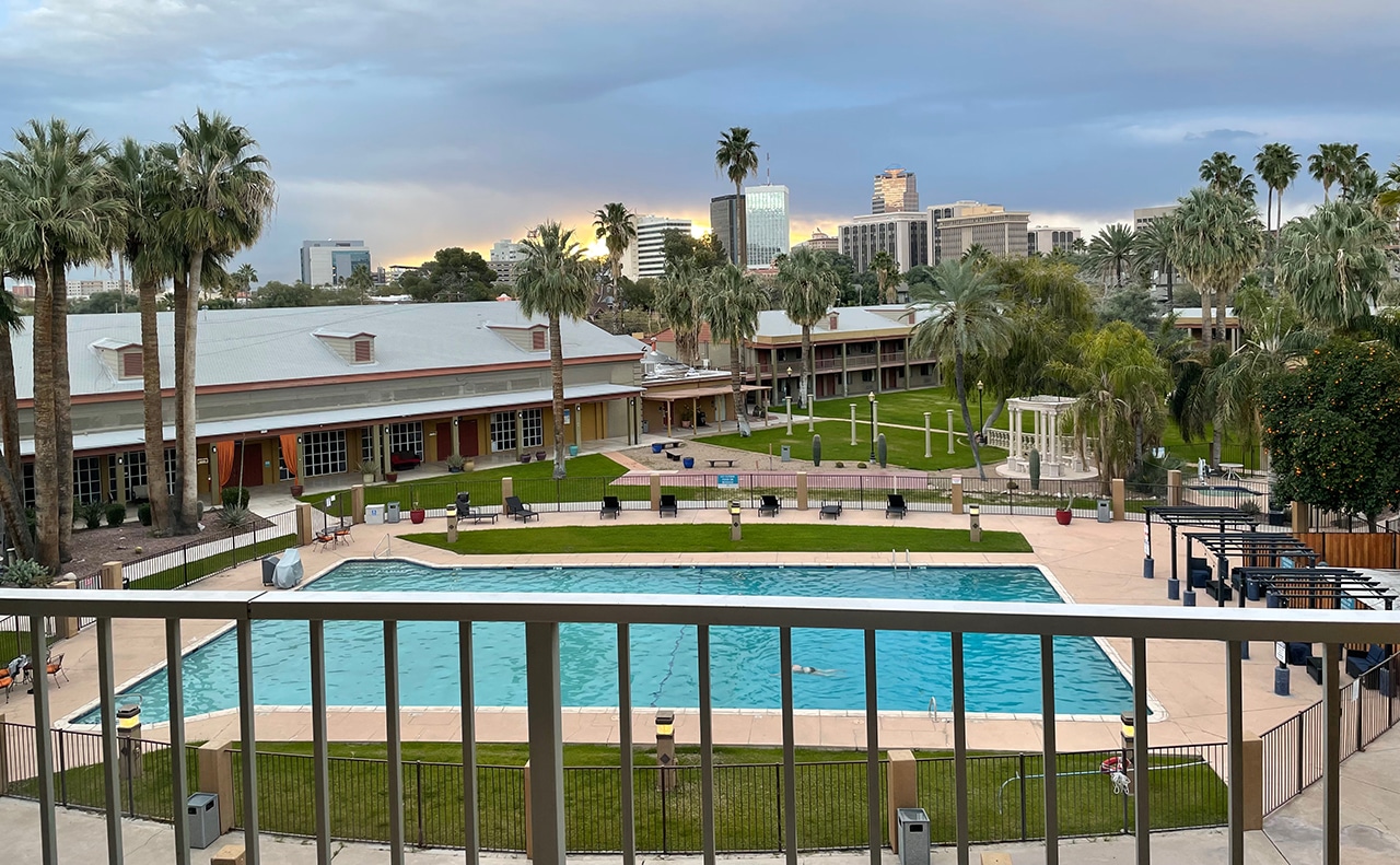 Timeshares are somewhat hard to secure in the southwest (at least through Bluegreen), so we ended up at the Hotel Tucson City Center. Our very spacious king suite had a balcony, living room, kitchen table and a bird’s-eye view of a beautiful pool. Although someone is swimming in the photo below, we did not partake.
