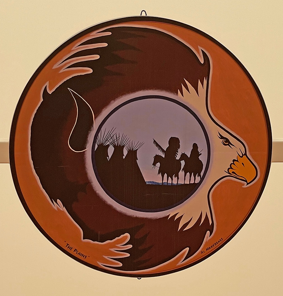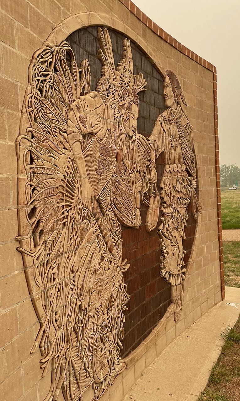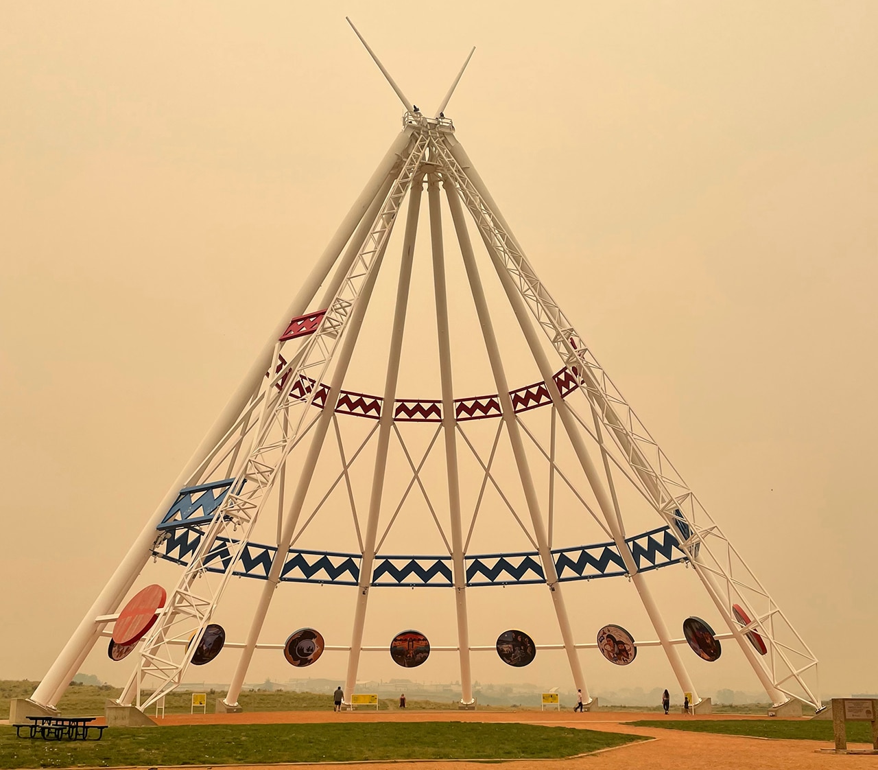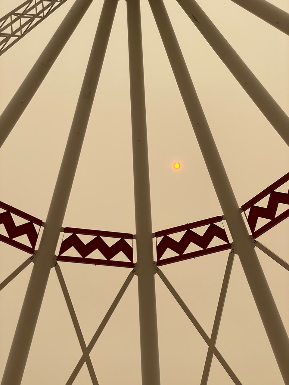 At the Saamis Teepee and Visitor Center in Medicine Hat, AB, the world’s tallest tepee has masts measuring 215 feet, a diameter of 160 feet, and its foundation weighs 800 metric tons! Each of the ten masts feature a large storyboard depicting aspects of native culture and history. A close-up of two of the ten disks encircling the teepee show just how beautiful they are. Please visit the website for much better pictures, although I have to admit I like these very much. The sun was just a glowing spec in the sky surrounded by smoke – and it was very eerie.
