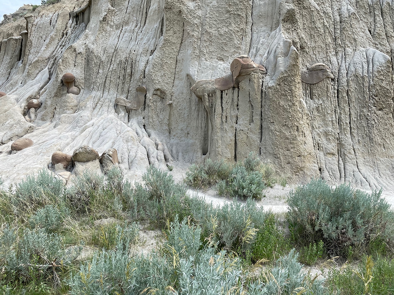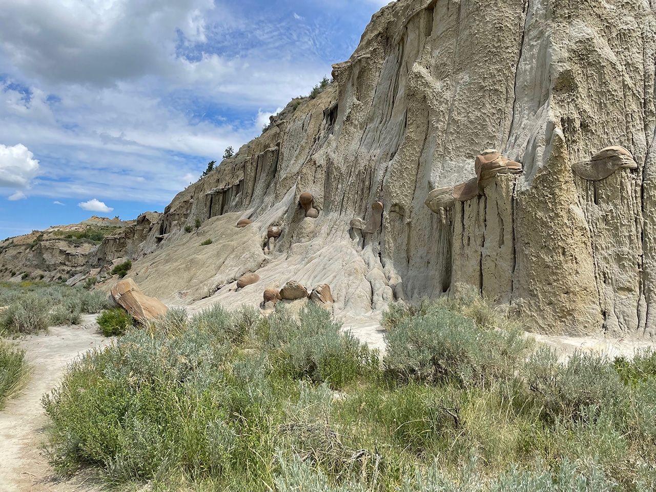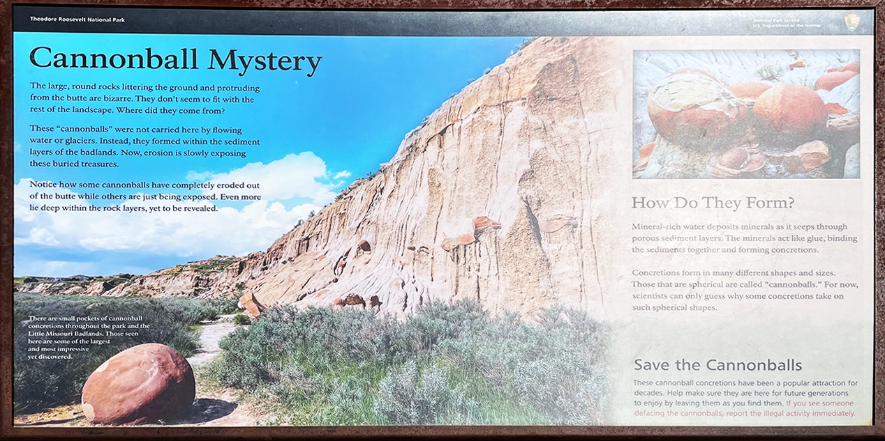 Notice how some cannonballs have completely eroded out of the butte while others are just being exposed. Even more lie deep within the rock layers, yet to be revealed.” ~ from the sign below