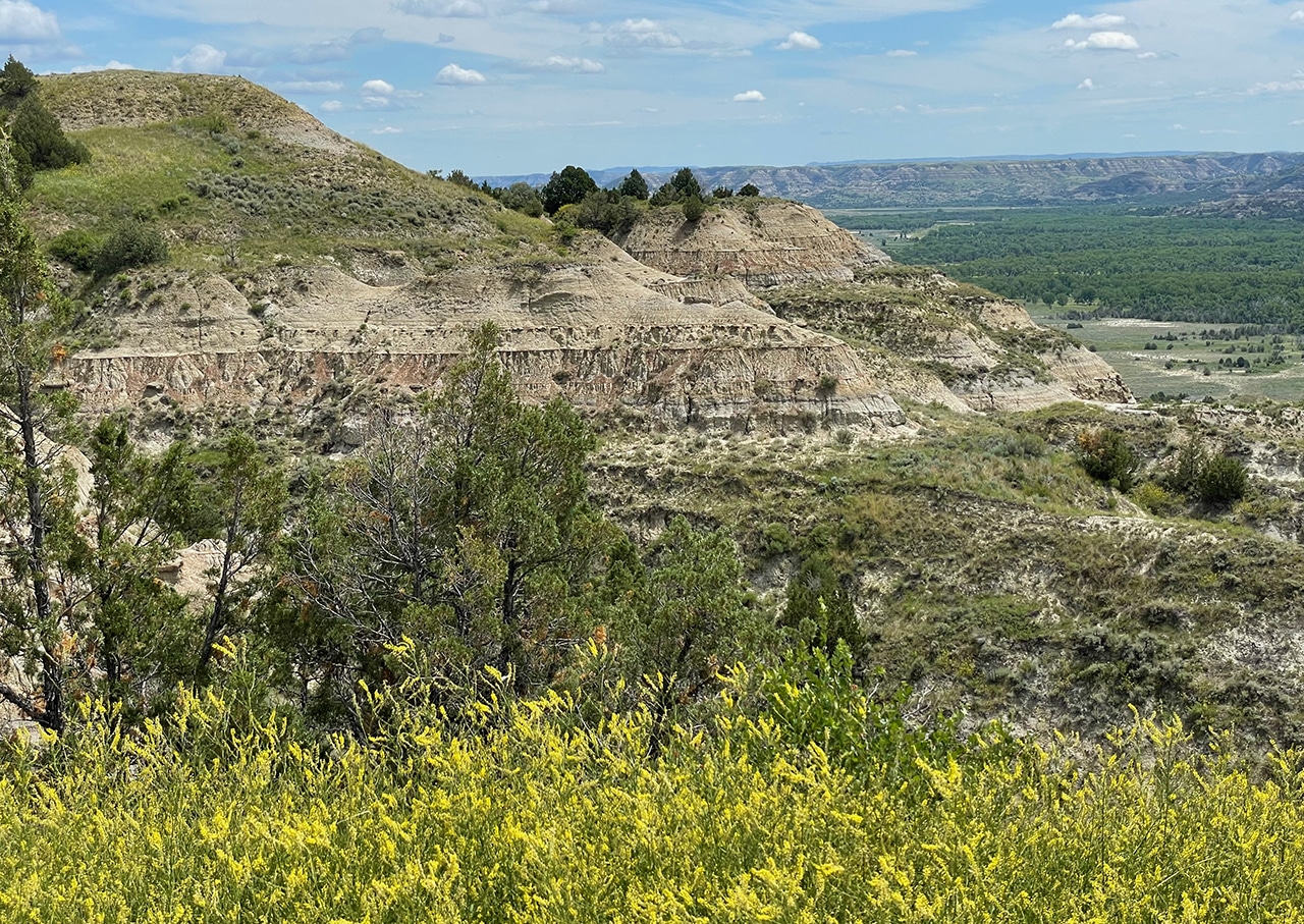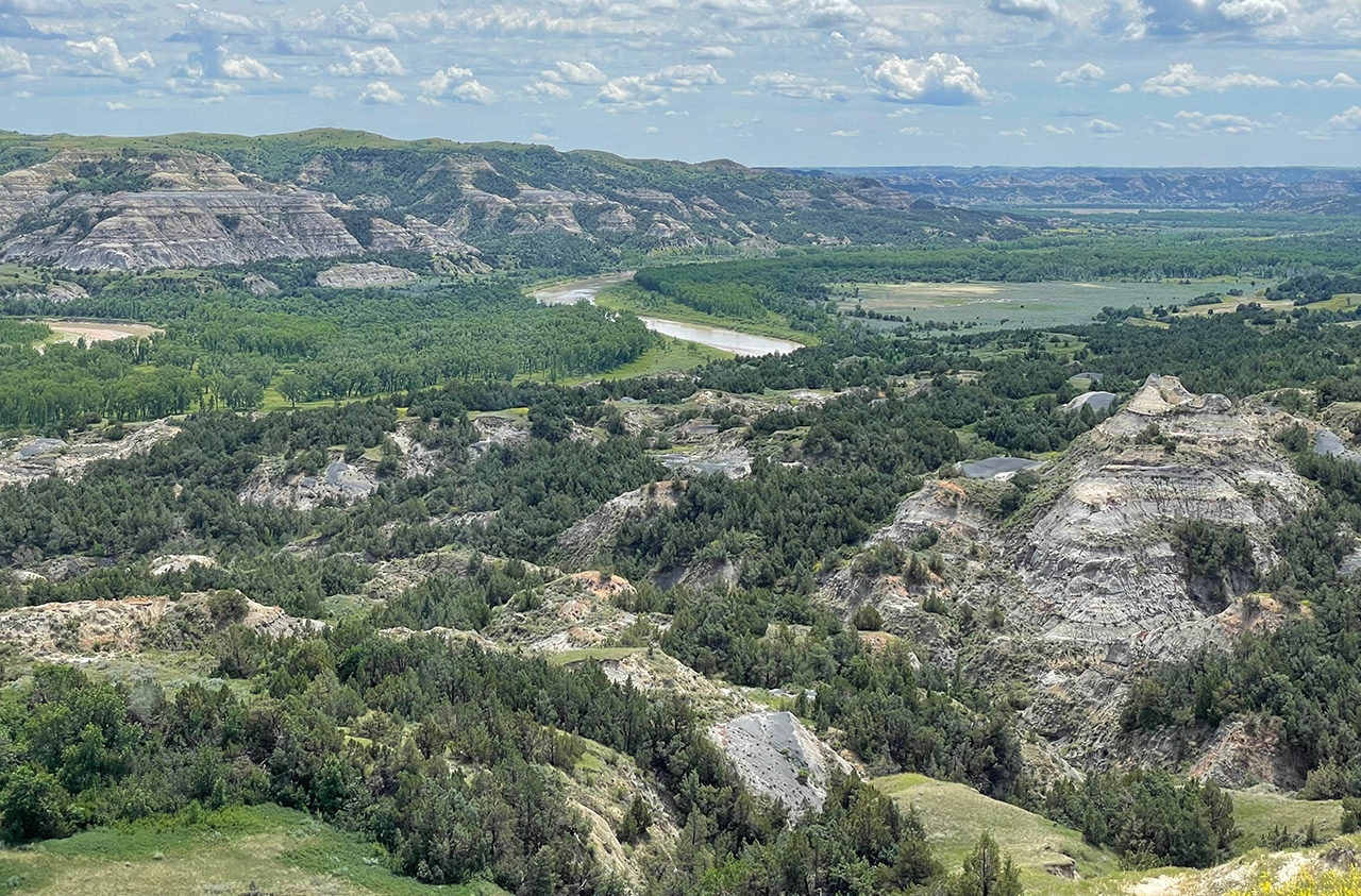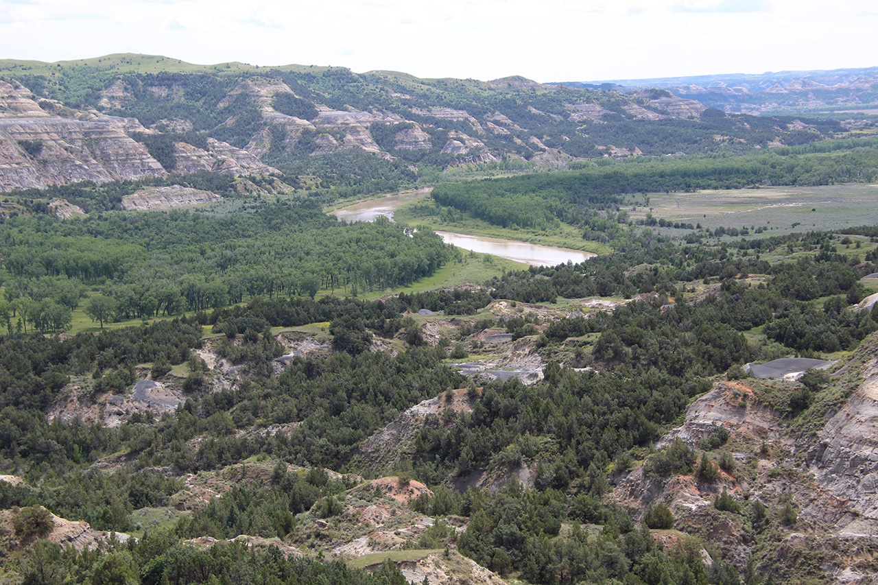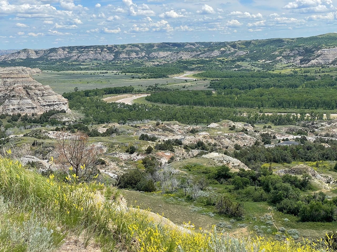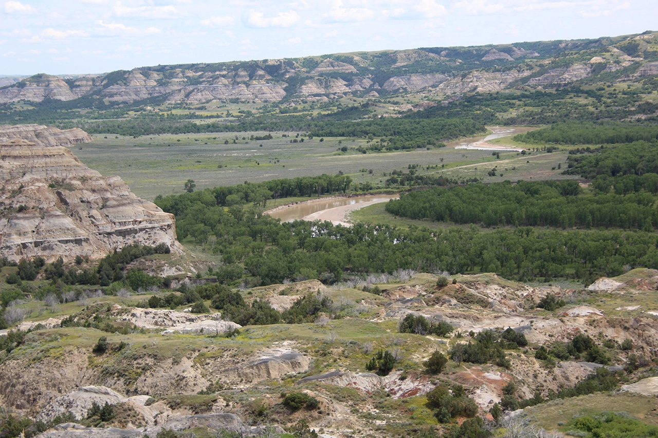 “A spectacular scenic vista awaits your exploration at the end of the North Unit Scenic Drive. Explore interpretive waysides along a short accessible sidewalk and take in the views of the meandering Little Missouri River surrounded by tall cottonwood trees and impressive buttes.
